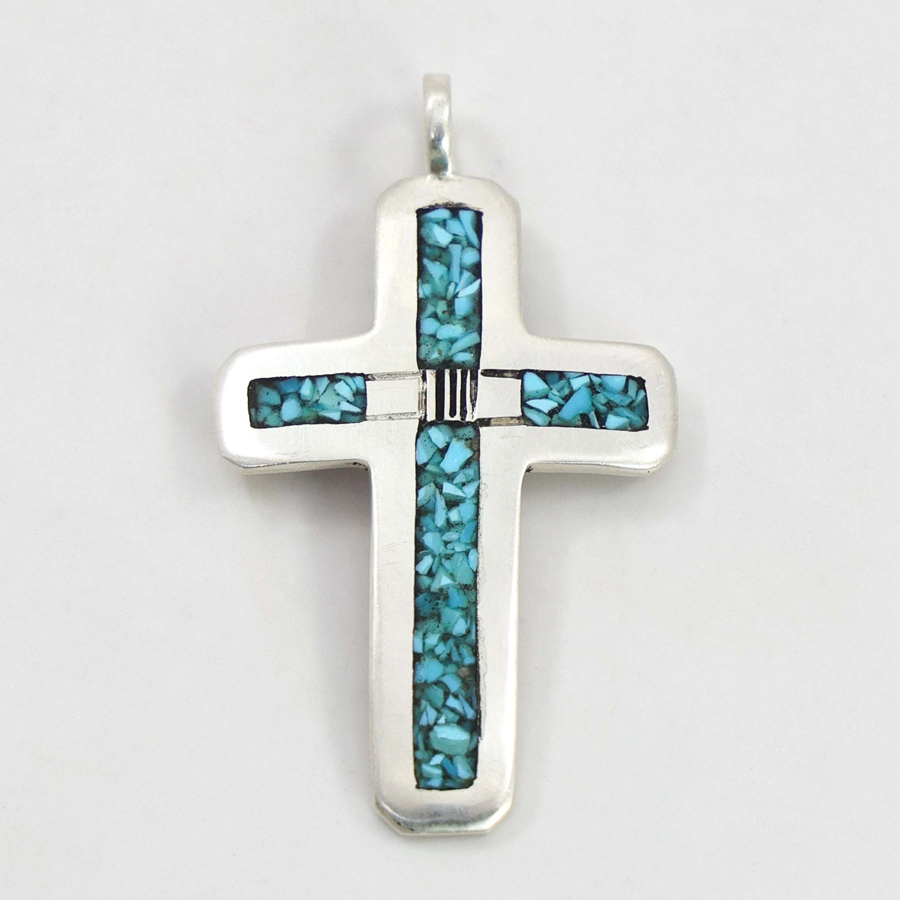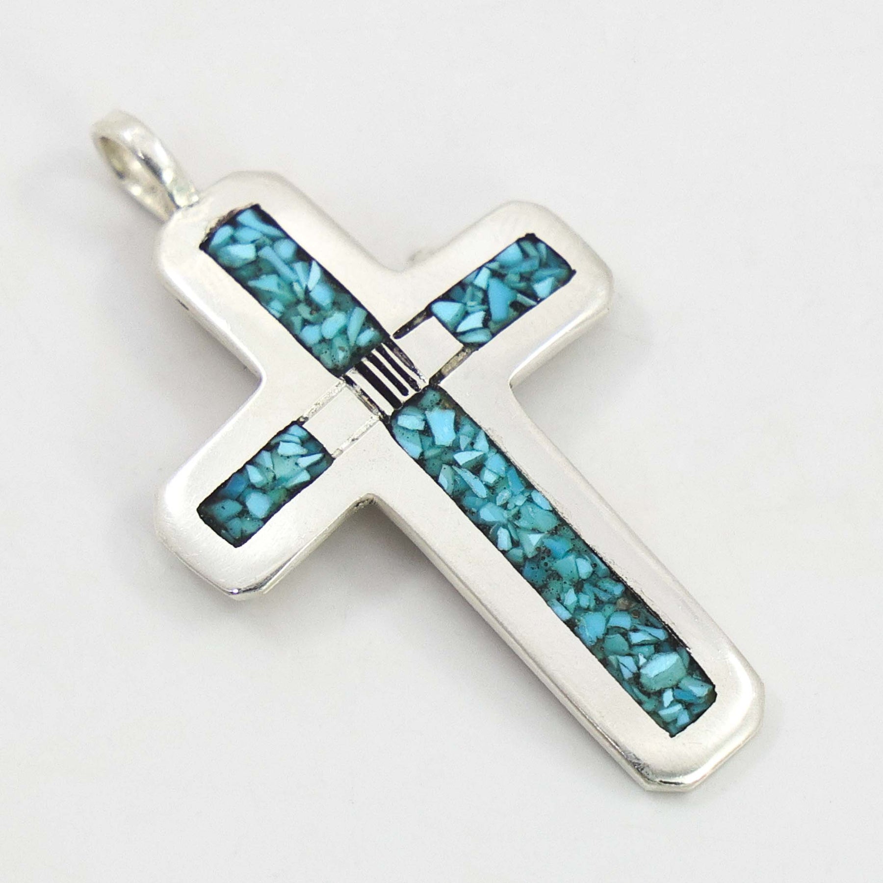 Sterling Silver Cross Pendant with Turquoise Chip Inlay.