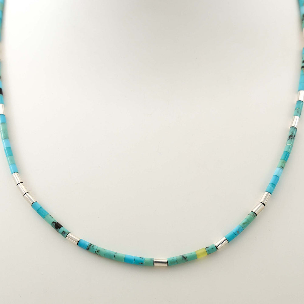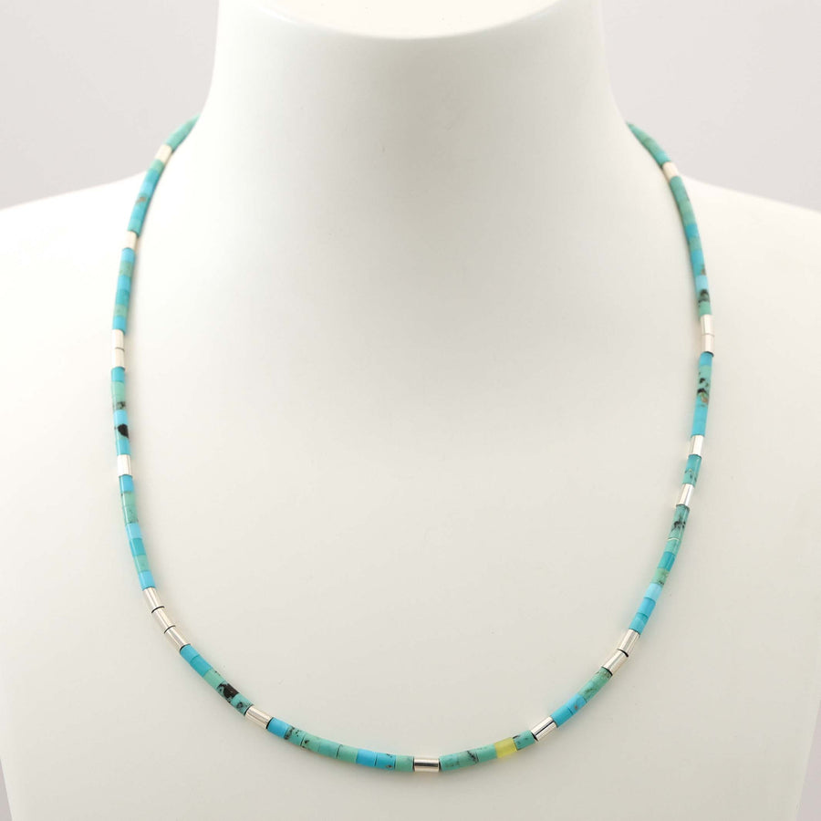 A beautiful collection of stone and metal beads. Each tribe specializes in different types of beads, from Navajo Pearls to Santo Domingo Heishi. Stone beads are made by hand cutting the raw material into squares, after which holes are drilled through the center. Strung together, the rough squares are hand shaped against a turning stone wheel. In the process, 60 – 70% of the original material is lost. For metal beads, artists make each half of the bead individually by hammering a sheet of metal against a semi-circular depression in a steel/iron plate. The two bead halves are delicately soldered together to create a continuous form.