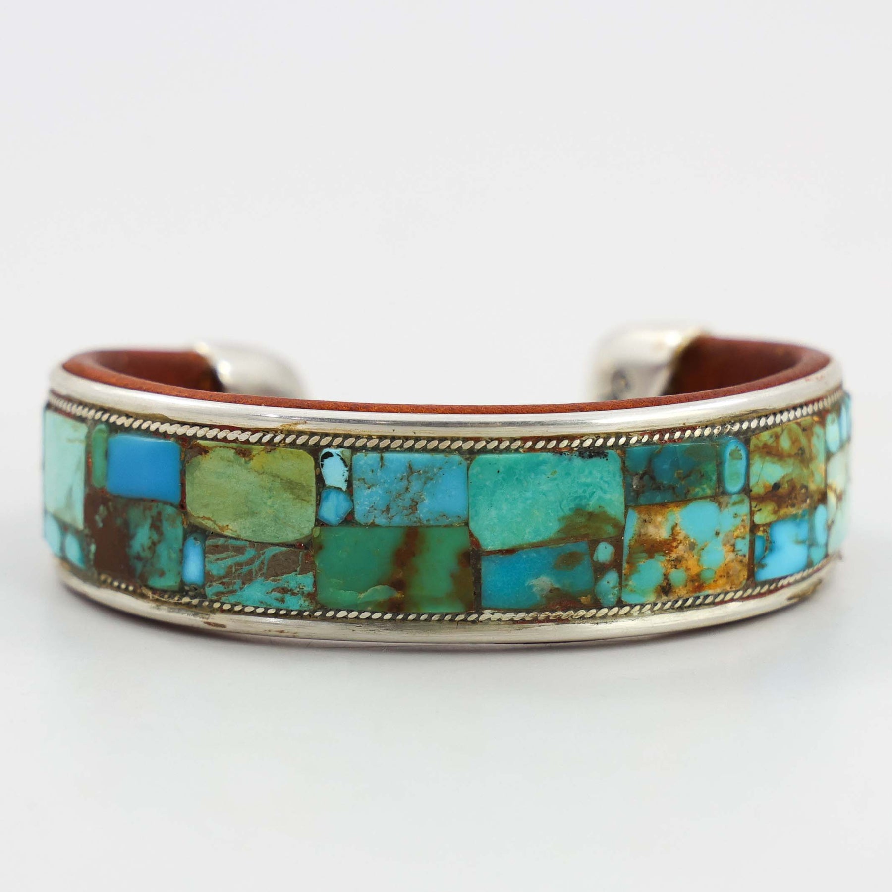 Sterling Silver, Copper, and Goat Leather Cuff Bracelet with Mosaic Inlaid Turquoise.