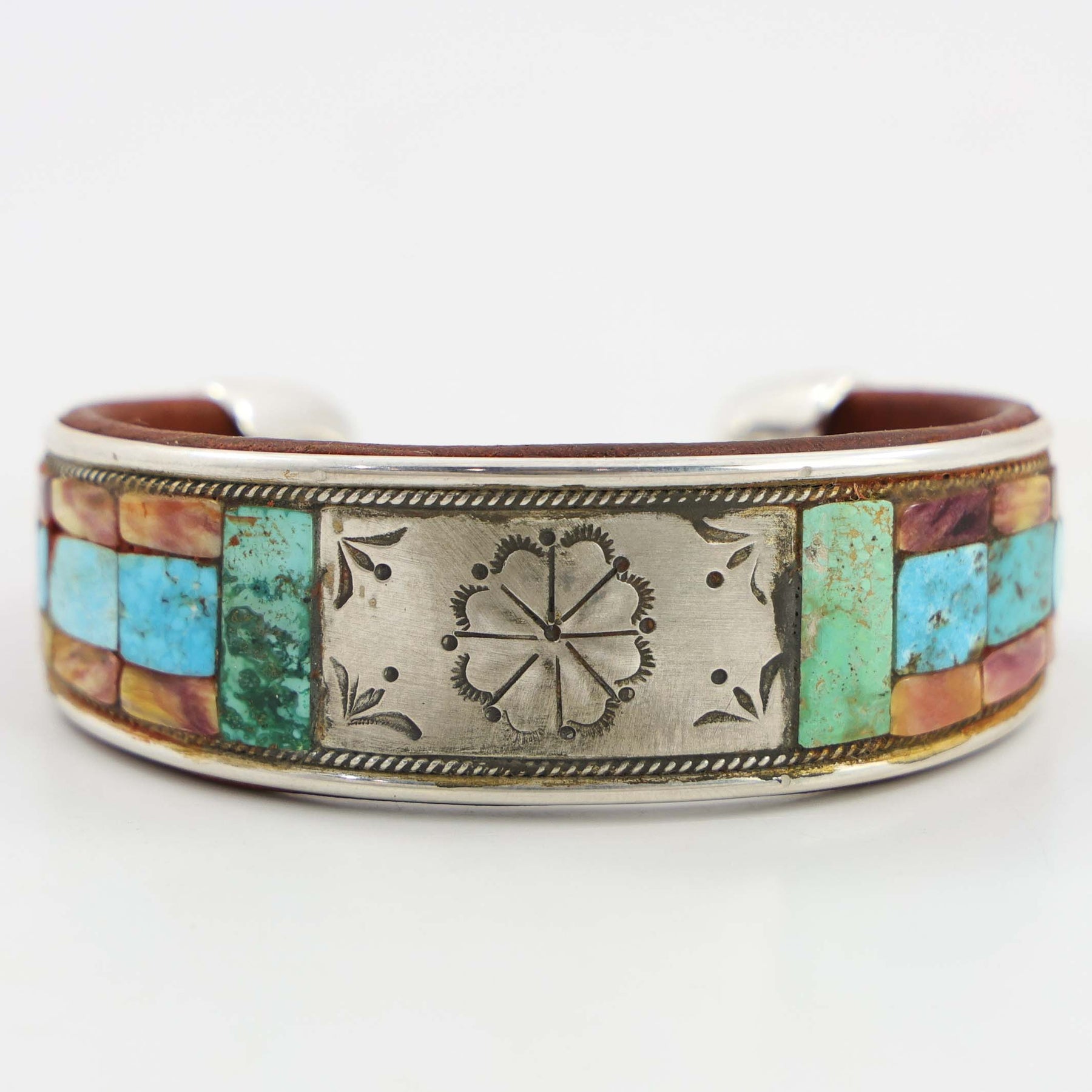 Sterling Silver, Copper, and Goat Leather Cuff Bracelet with Mosaic Inlaid Turquoise and Spiny Oyster Shell.