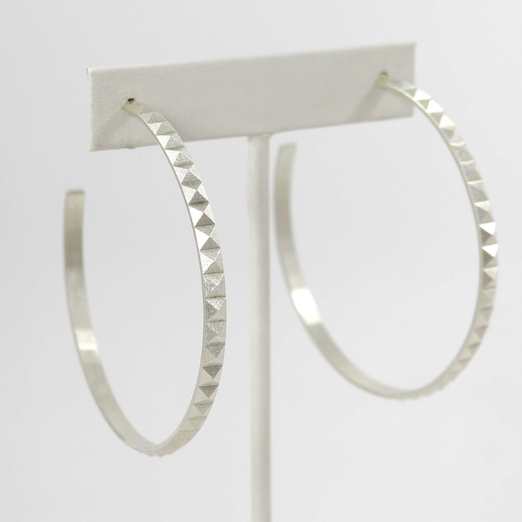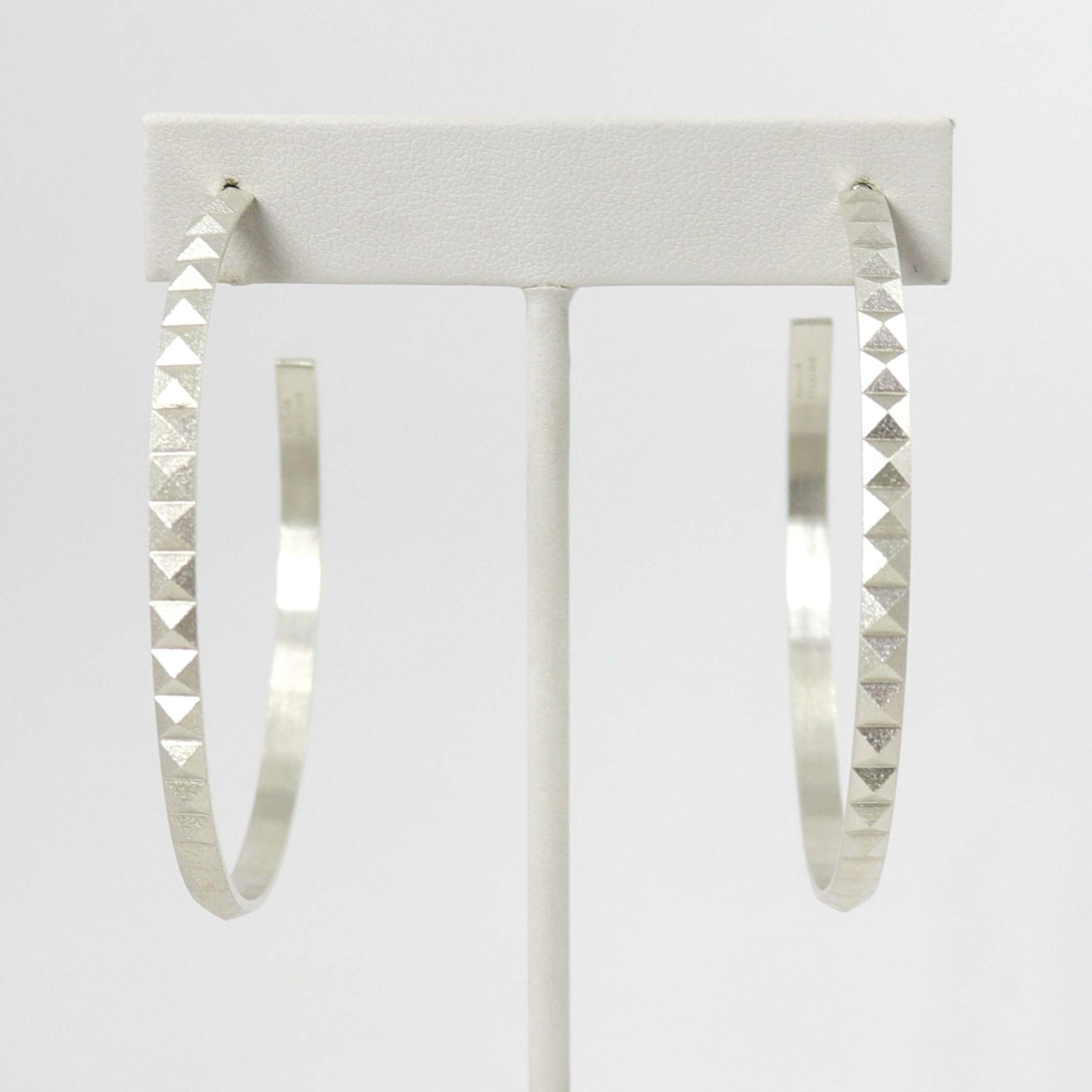 Sterling Silver Post Pyramid Hoop Earrings with a Satin Matte Finish.