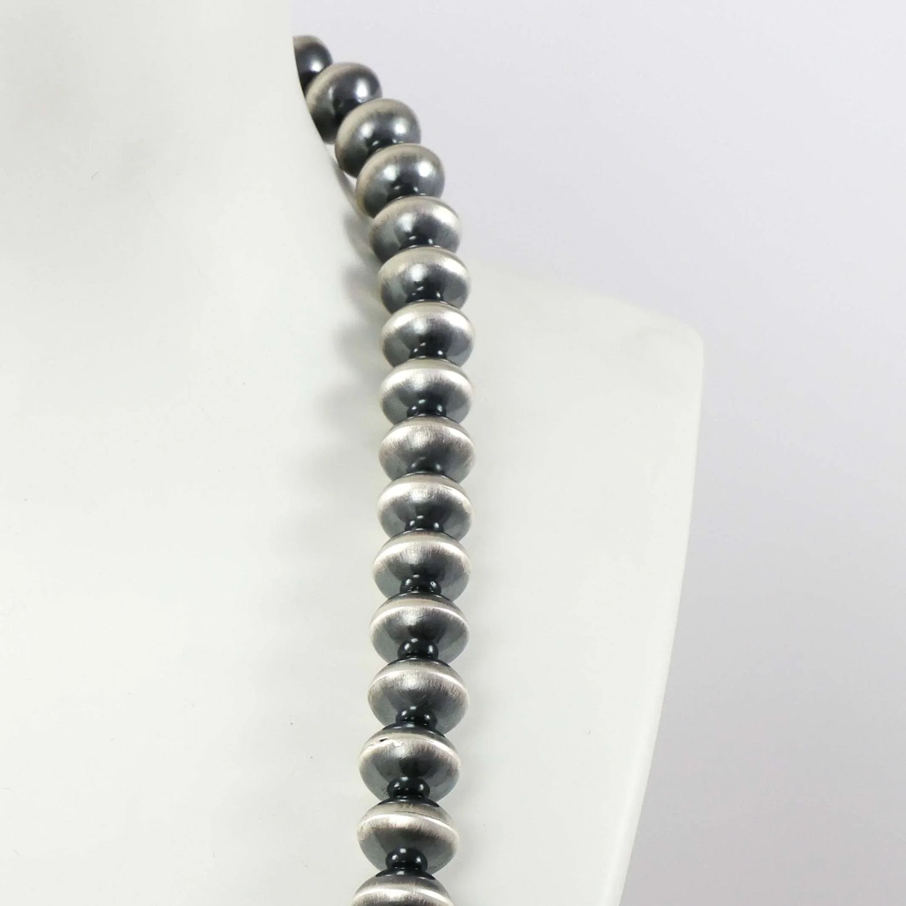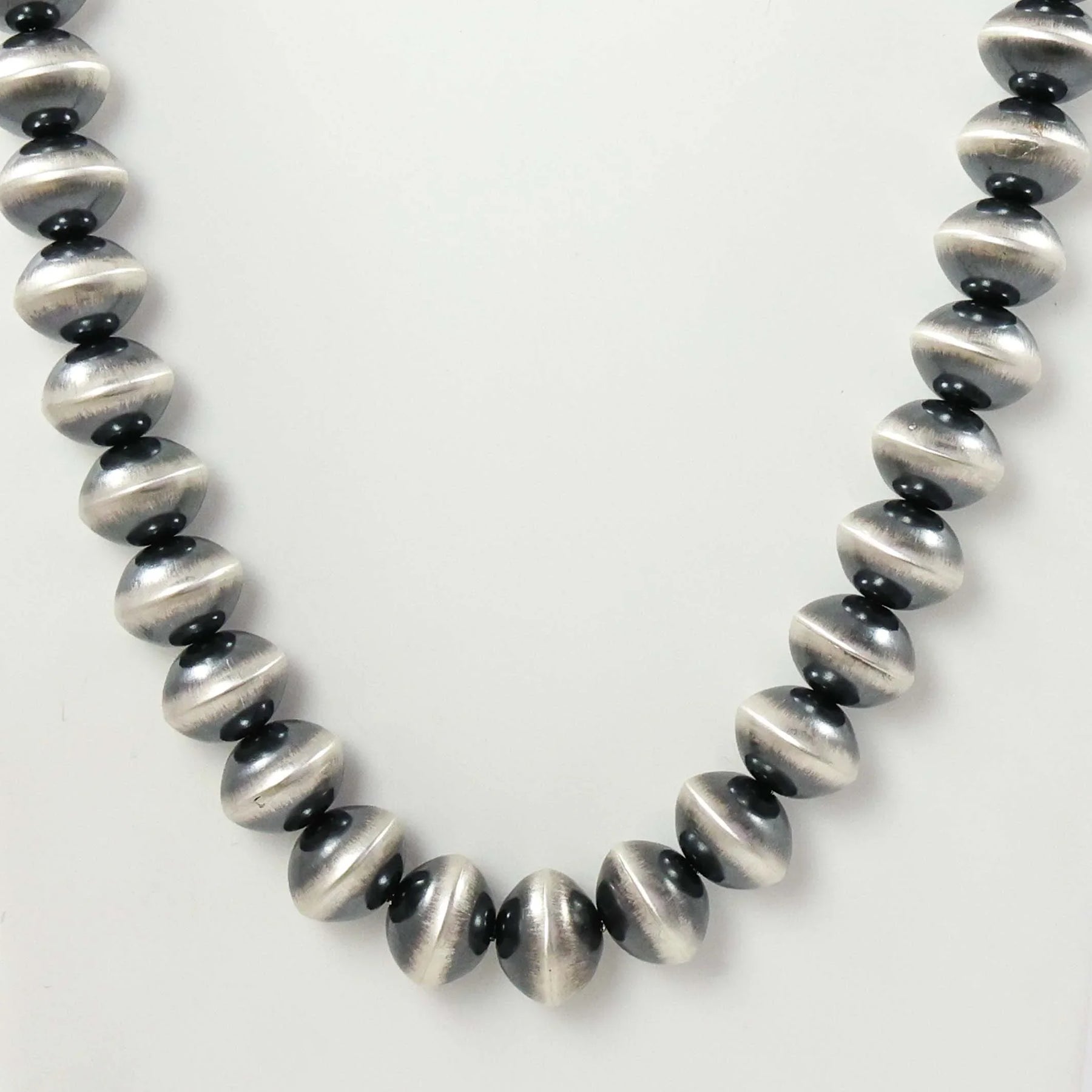 Single Strand Sterling Silver Navajo Pearl Necklace with Handmade Beads. This necklace features an oxidized finish.