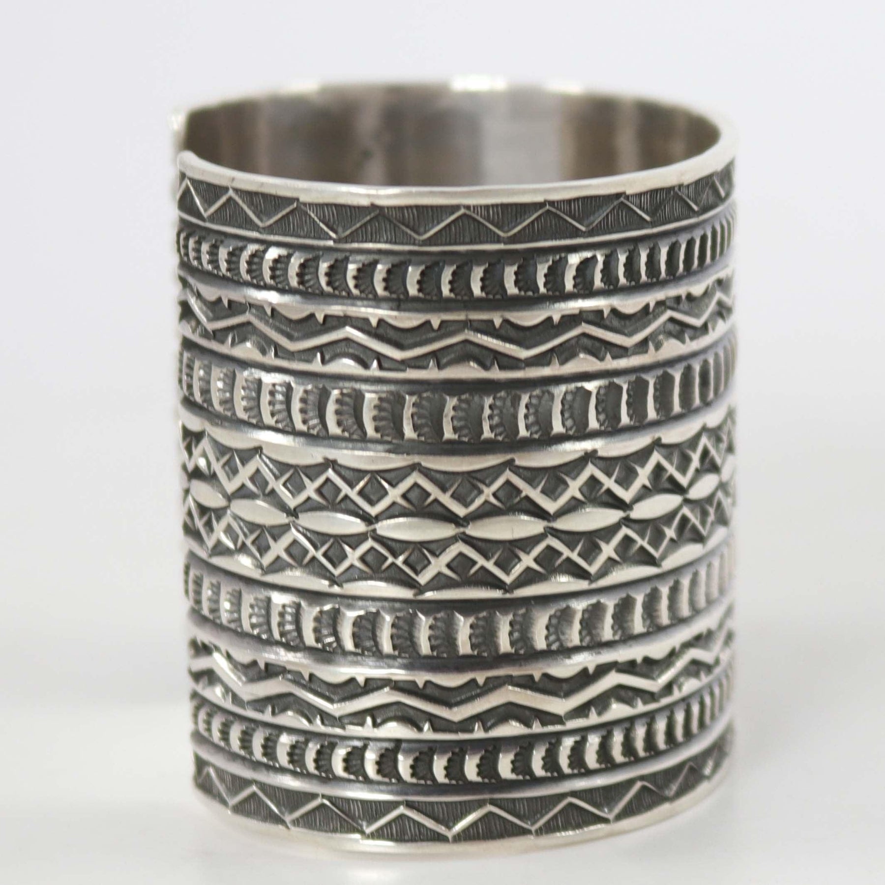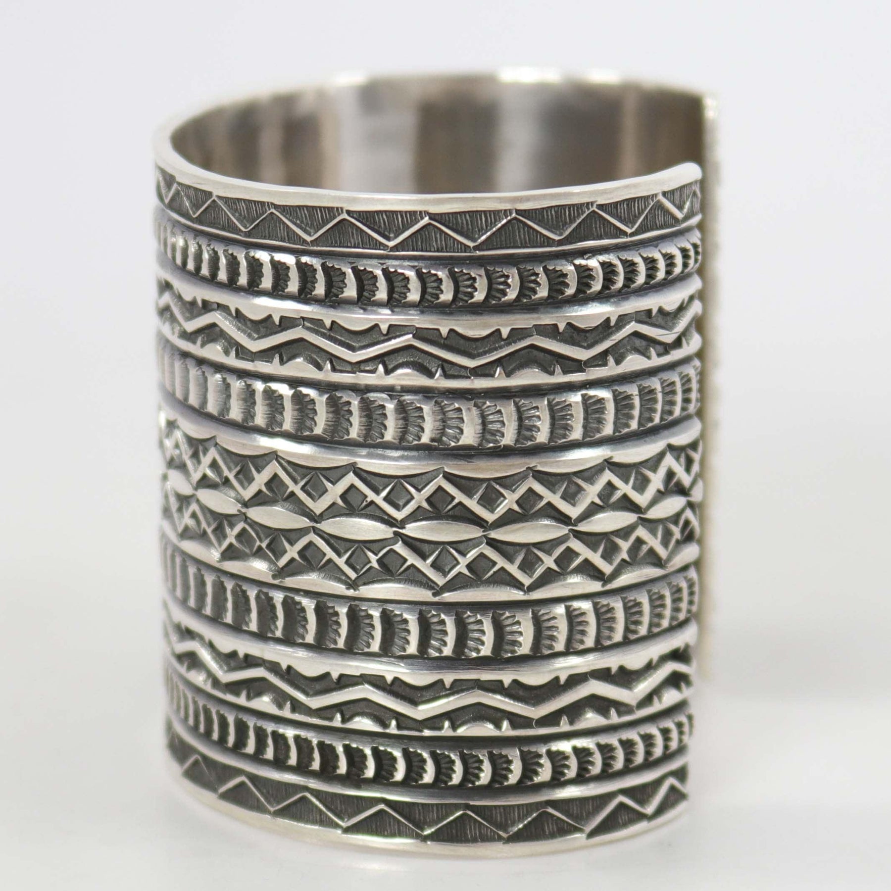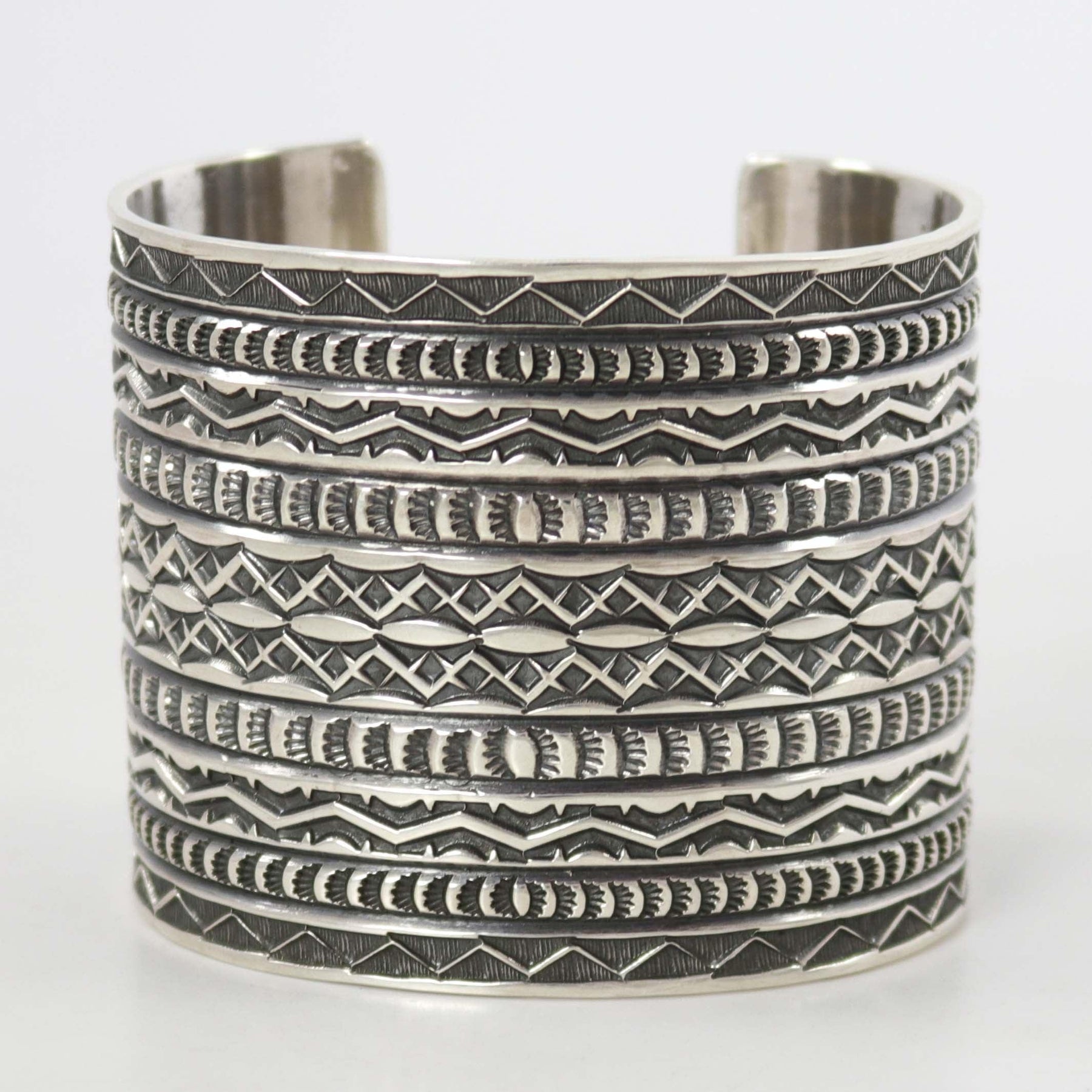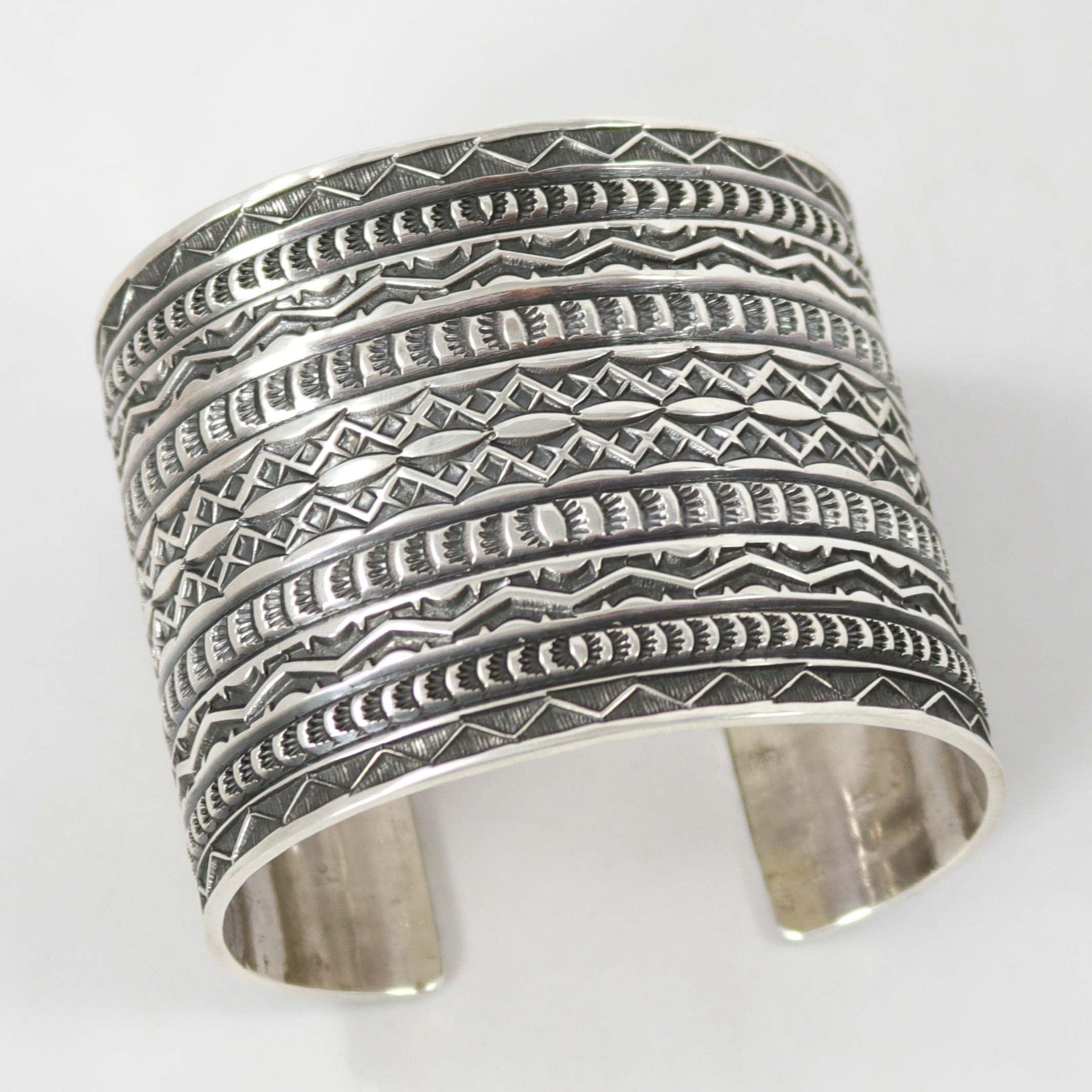Wide Sterling Silver Cuff Bracelet with Intricate Hand-Stamped Designs.