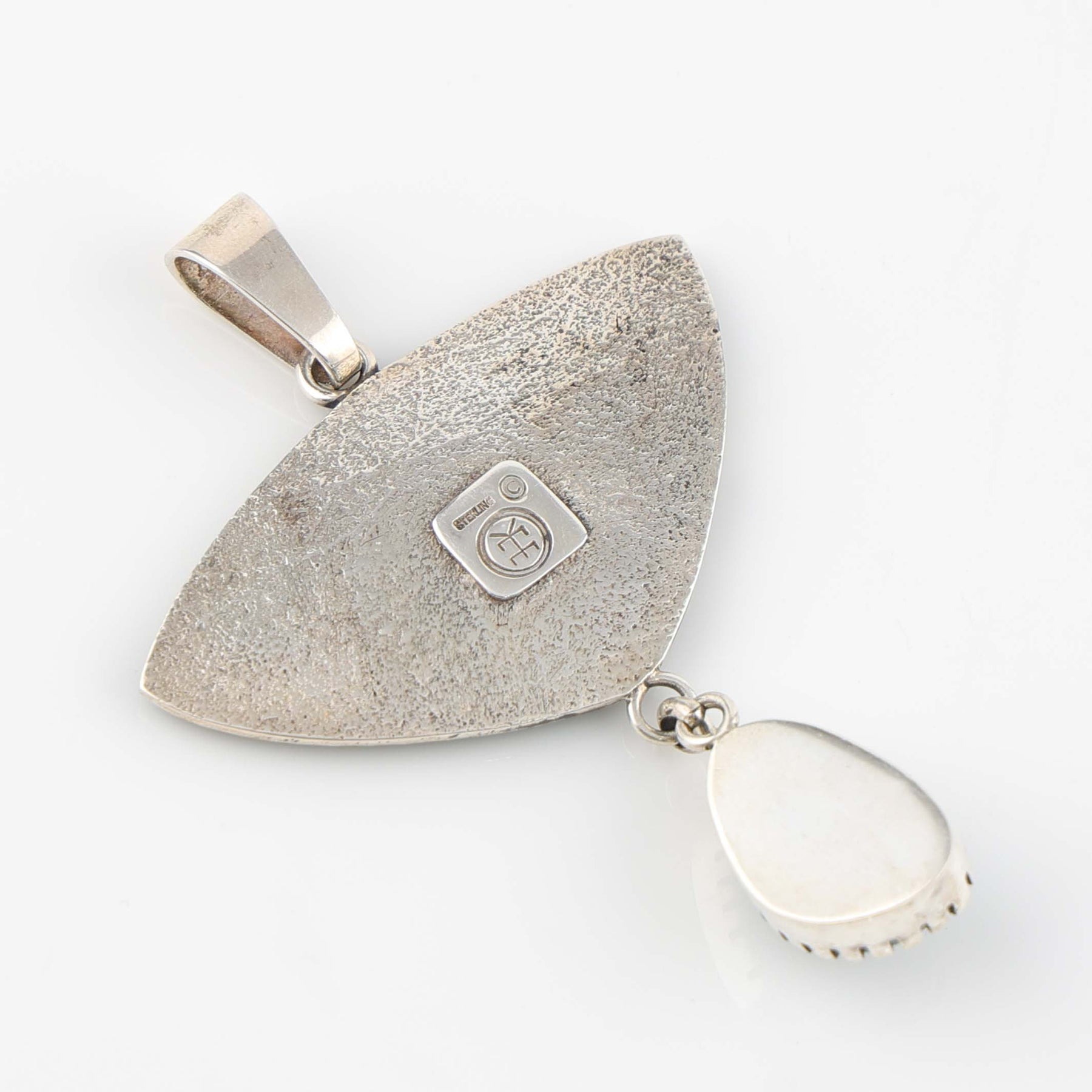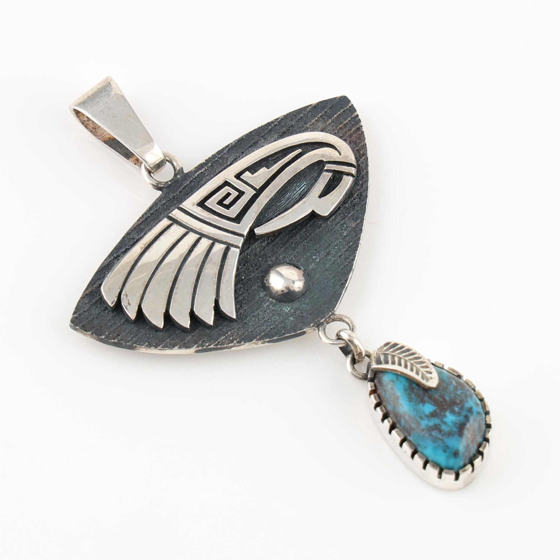 Sterling Silver Pendant with a Raised Hopi Overlaid Eagle Design and Applique Silver Rain Drop. The pendant features a Natural Bisbee Turquoise stone from Arizona, with a hand-stamped silver leaf, dangling beneath the eagle.