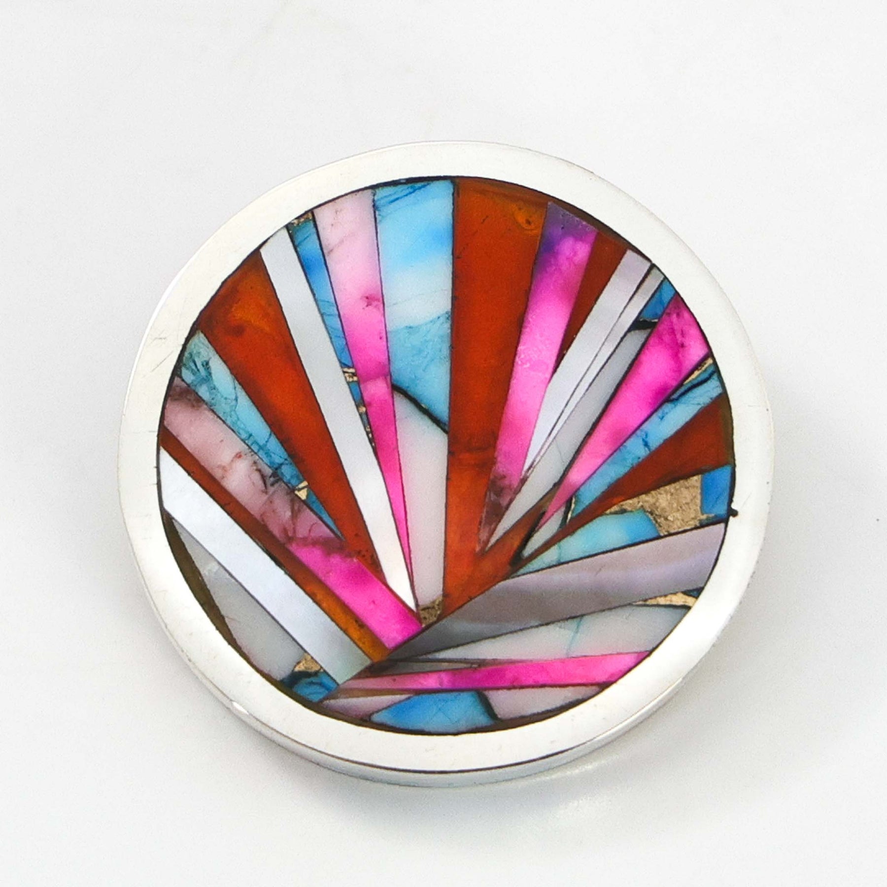Sterling Silver Pendant with Mosaic Inlaid “Blue Dahlia,” a Turquoise and Copper Composite, Mother of Pearl Shell, and Mexican Fire Opal.