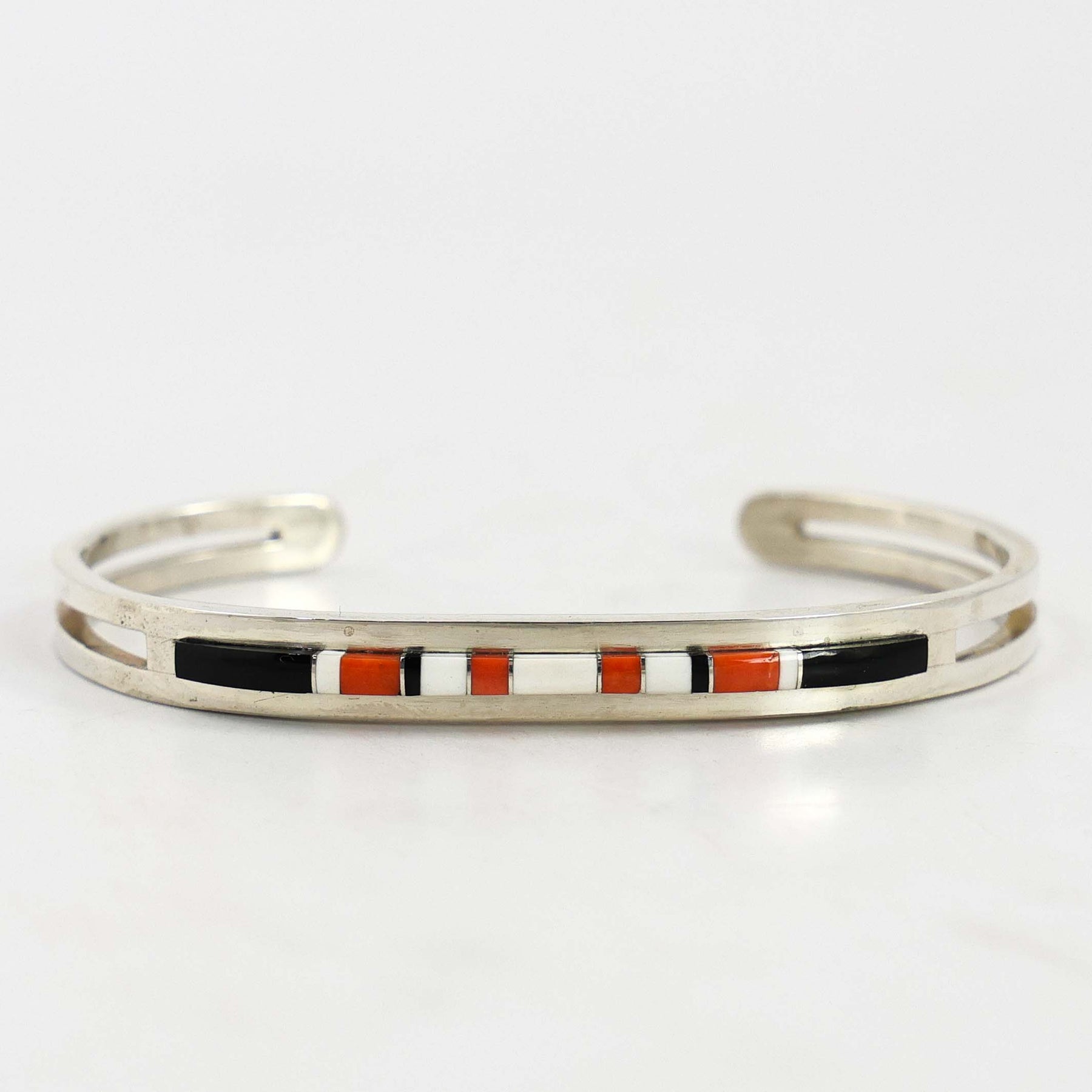 Sterling Silver Split Band Cuff Bracelet featuring a Channel Inlaid Design using Black Onyx, Mediterranean Coral, and Bone.