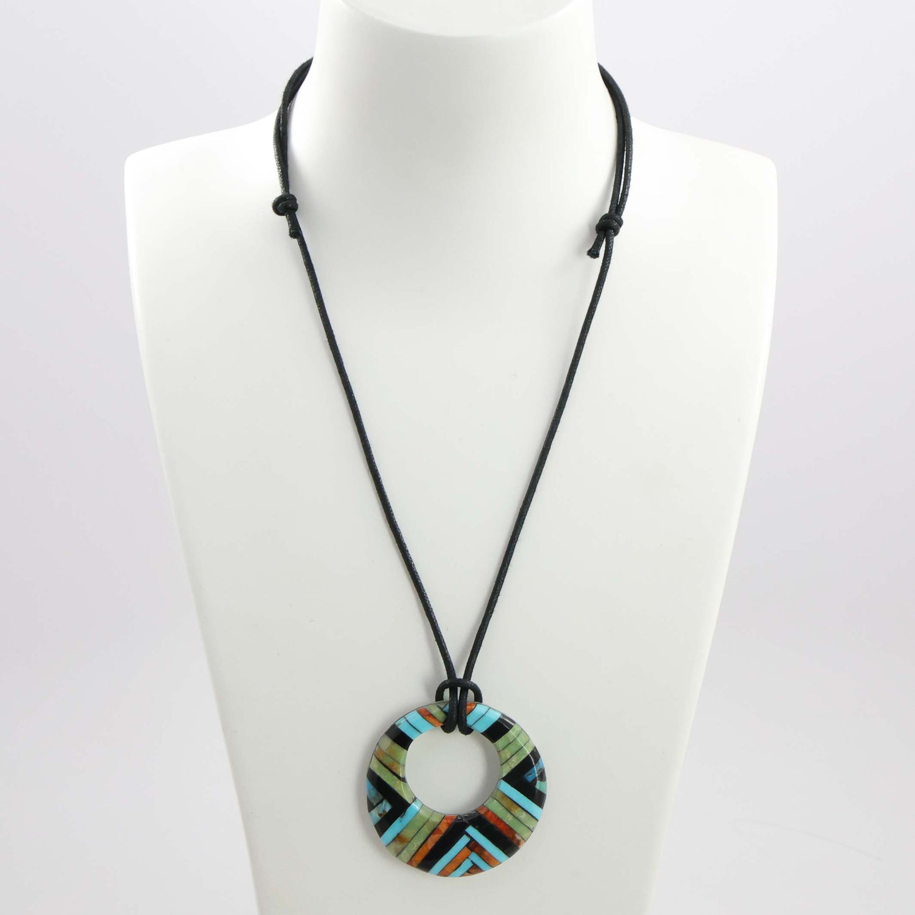 Shell Pendant with Mosaic Inlaid Turquoise, Jet, and Spiny Osyter Shell. This pendant comes with an adjustable cord.