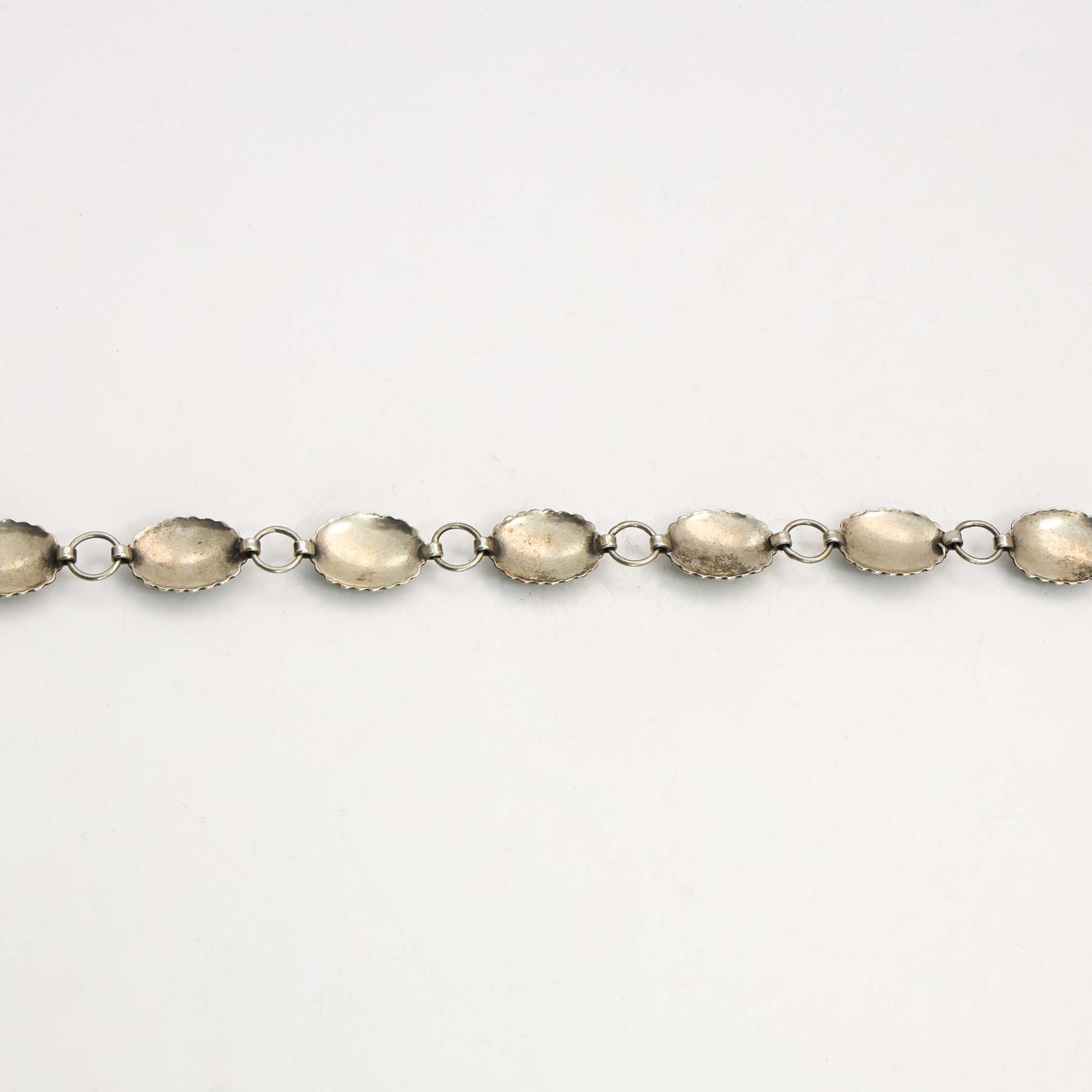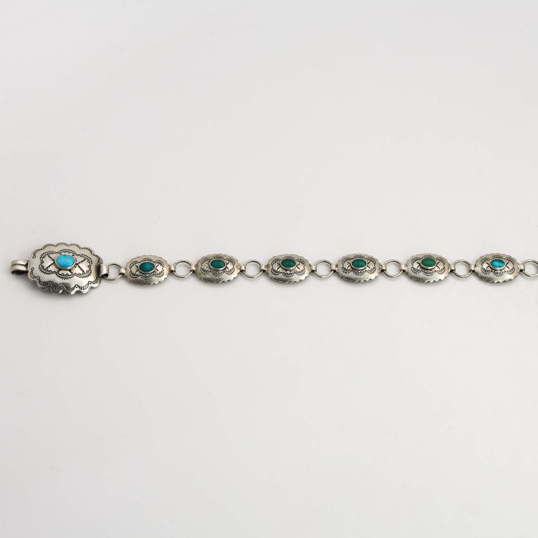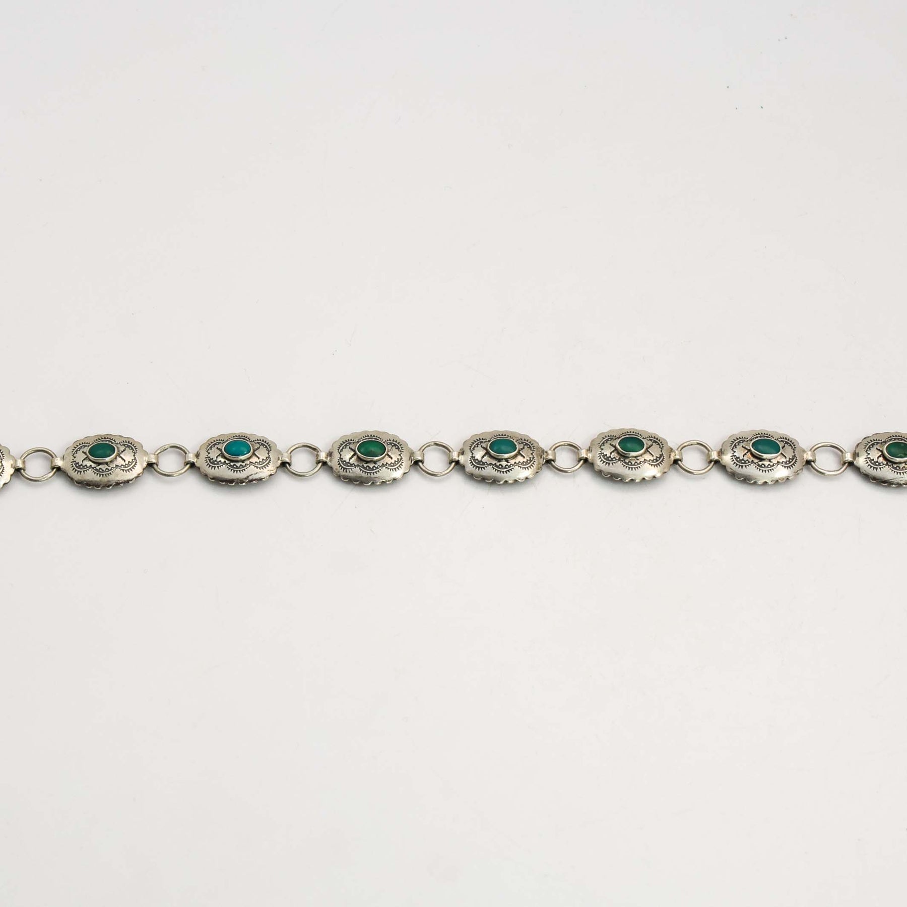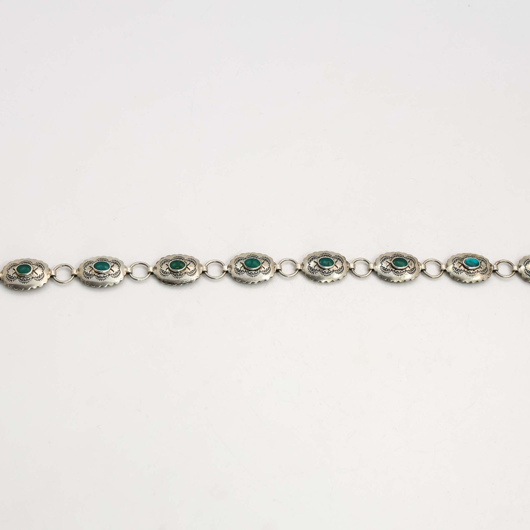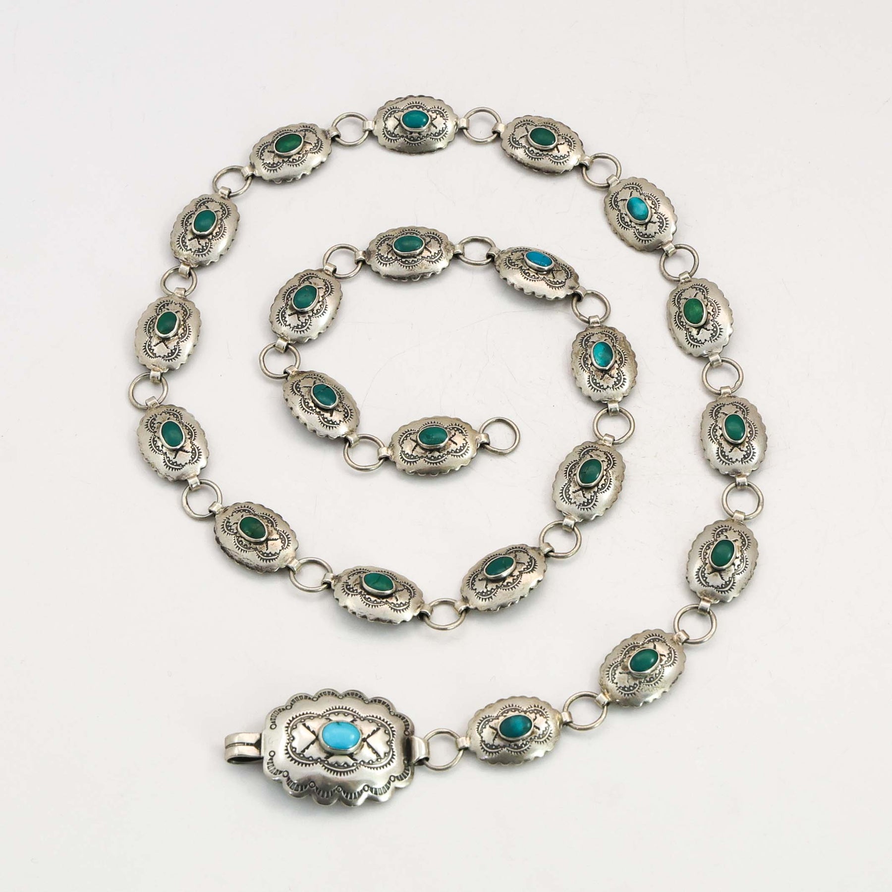 1930s Navajo Sterling Silver Link Concho Belt with Hand-Stamped Designs and set with Natural American Turquoise.