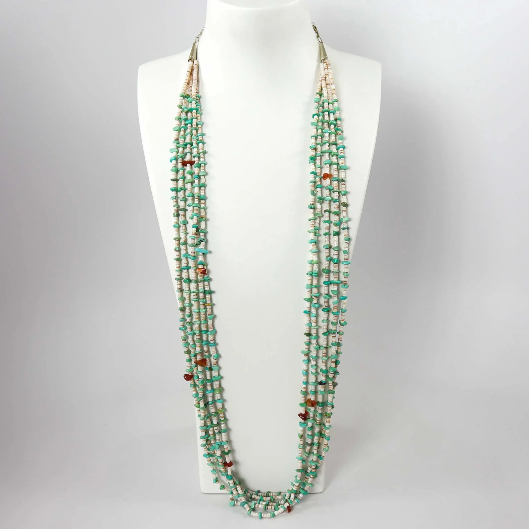1960s Santo Domingo 5-Strand Necklace with Hand Rolled Beads made from White Clam Shell, Amber, and Turquoise with a Sterling Silver Clasp.