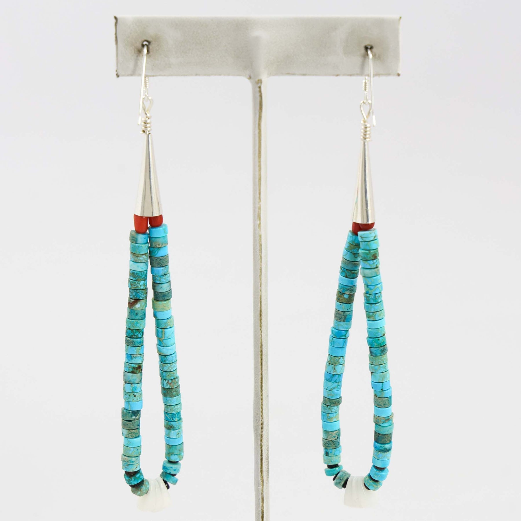 Sterling Silver French Hook Dangle Jacla Style Earrings with Coral, Kingman Turquoise, Pen Shell, and Mother of Pearl Shell Beads.