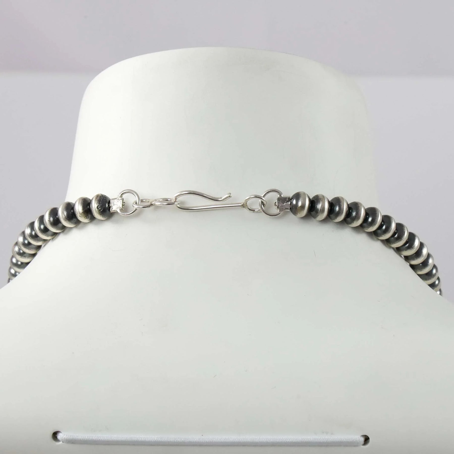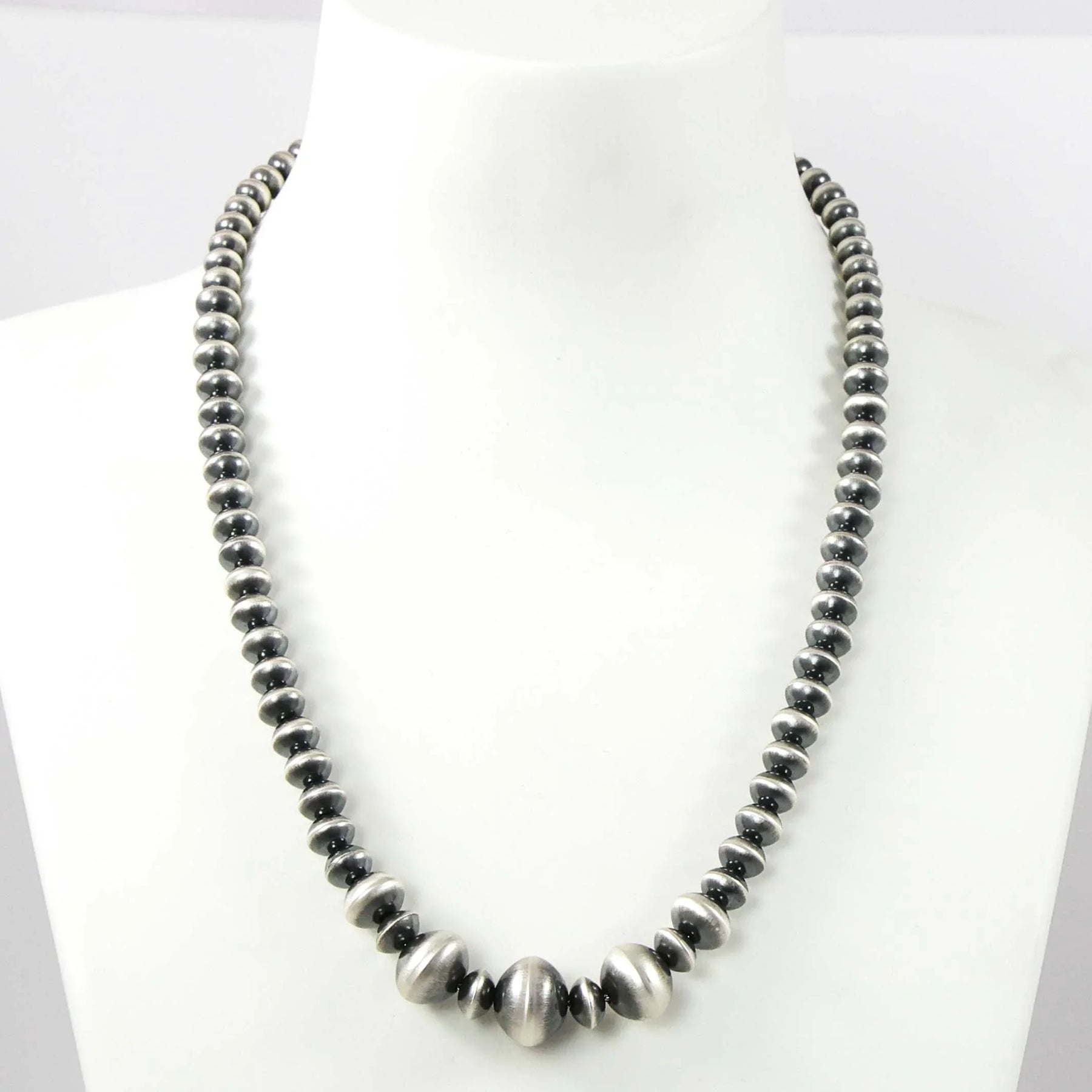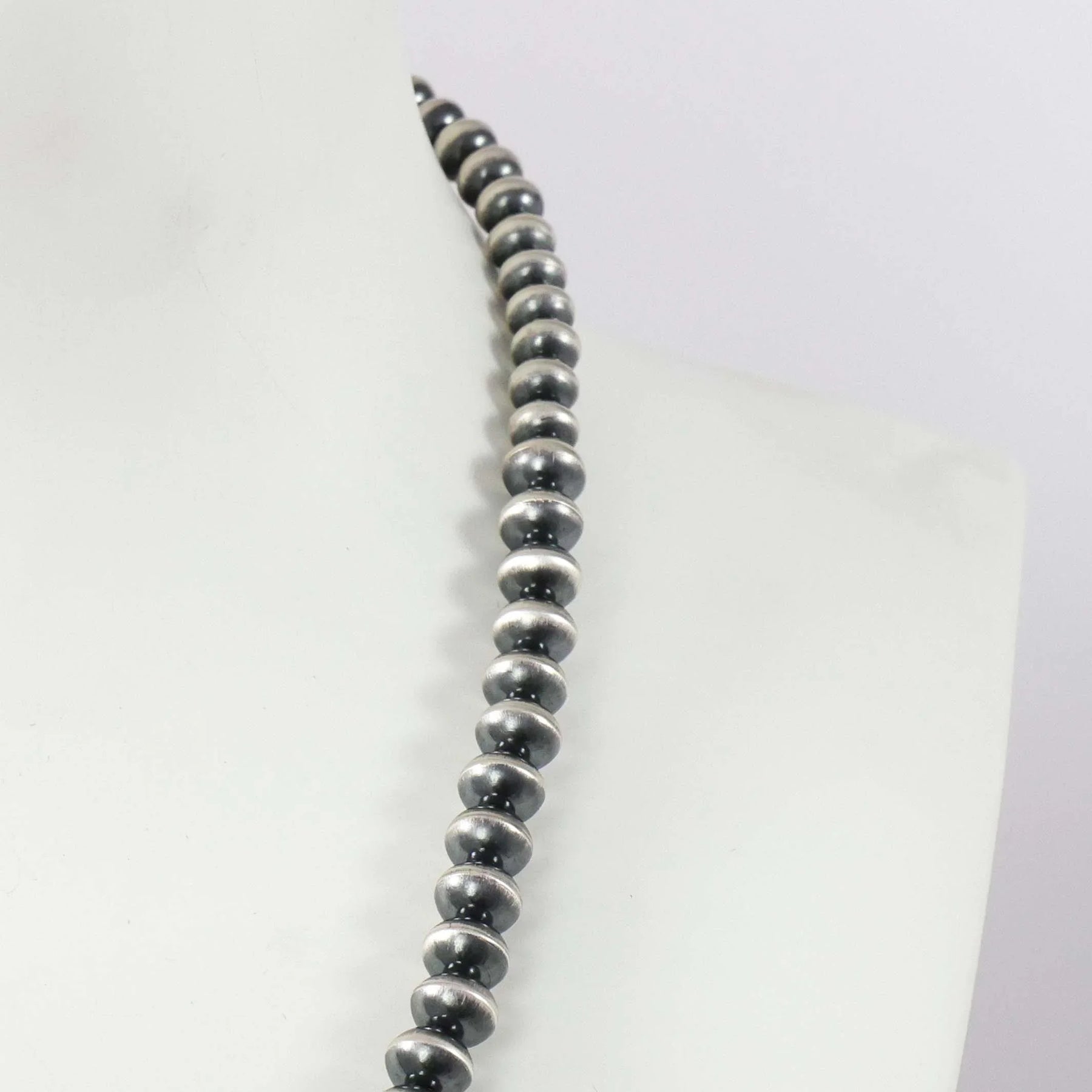 Single Strand Sterling Silver Navajo Pearl Necklace with Handmade Beads. This necklace features an oxidized finish.