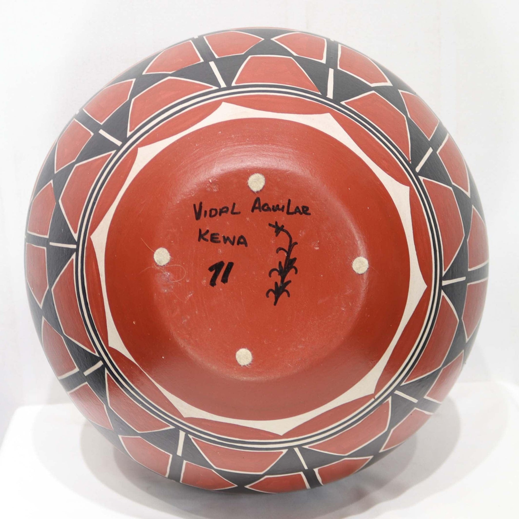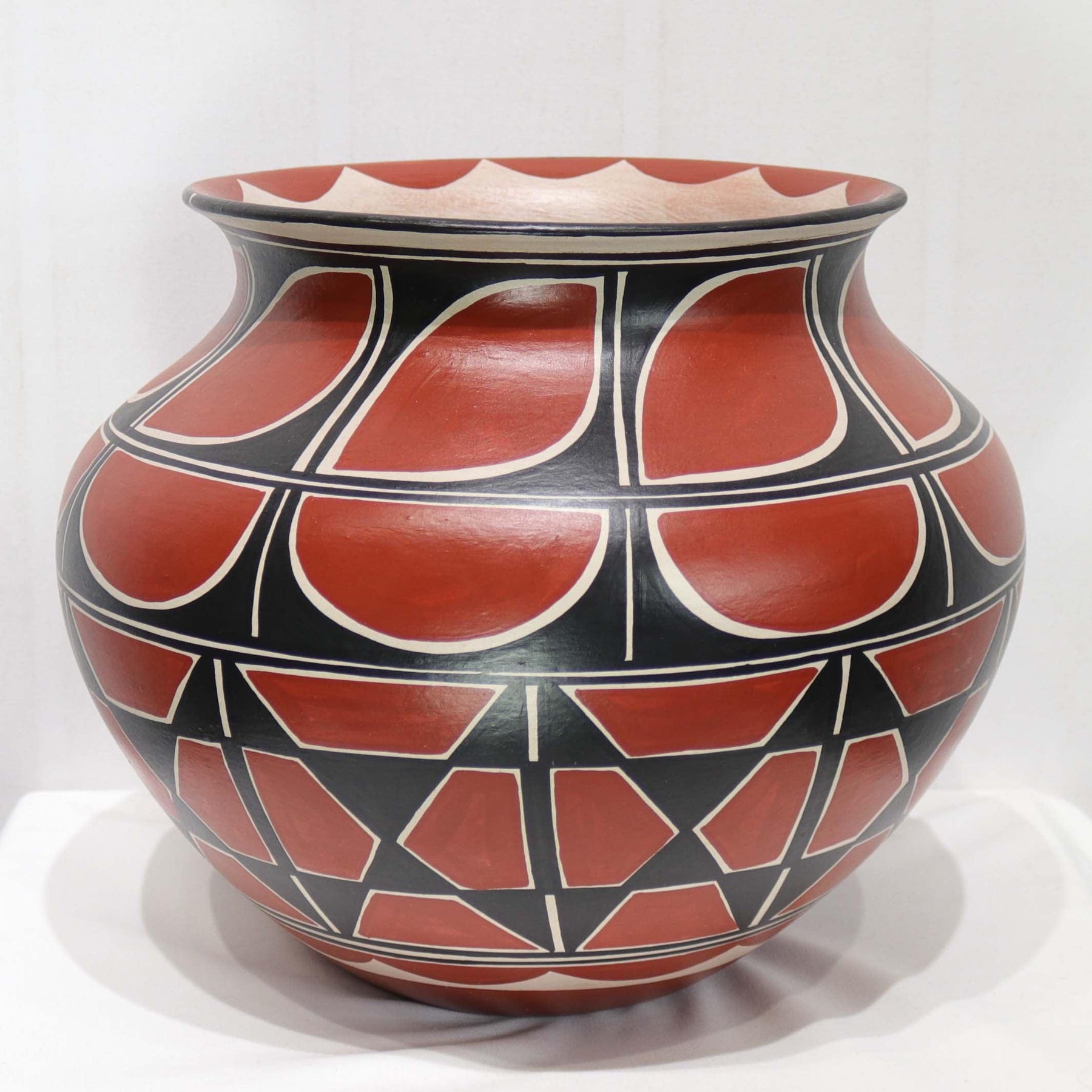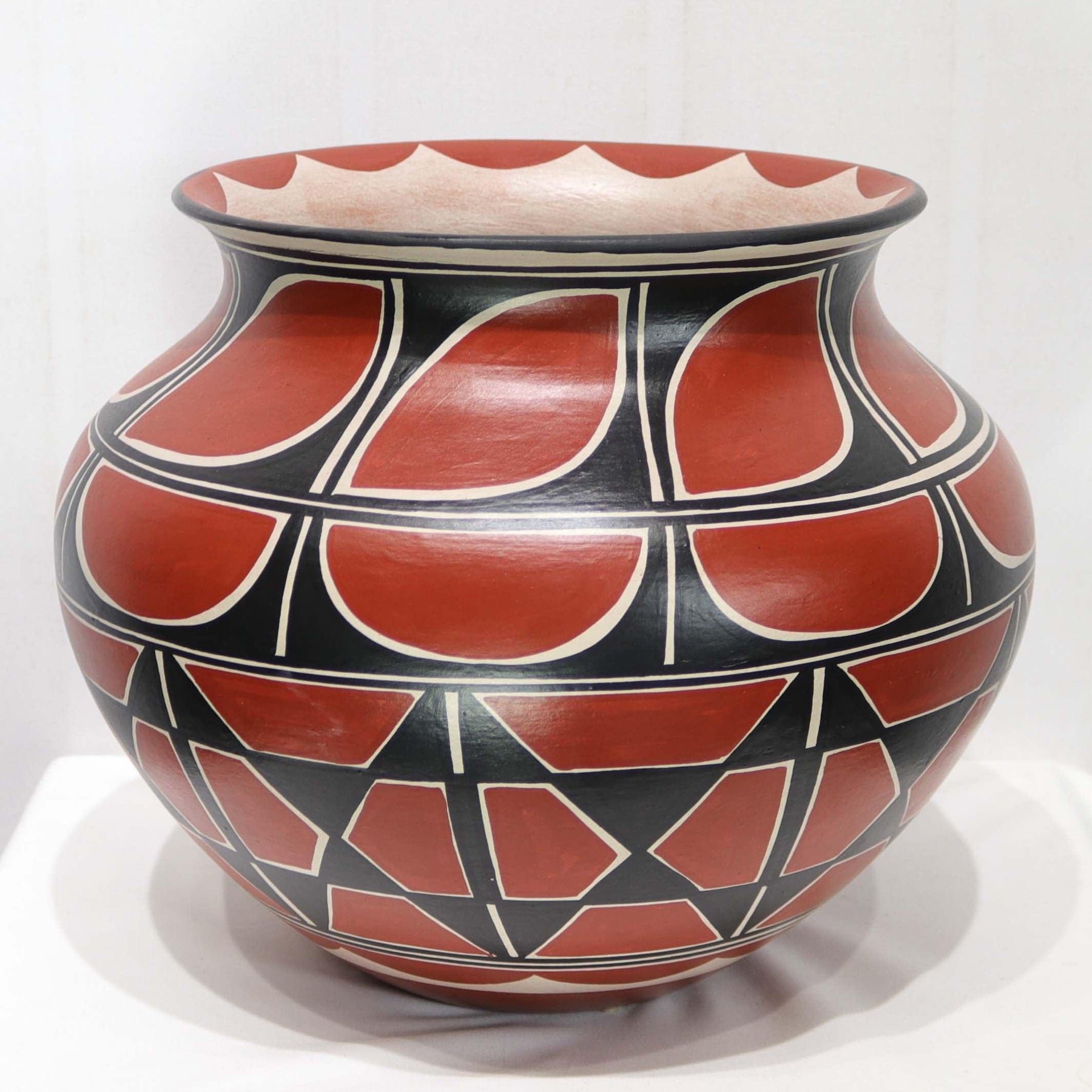 Large Hand-coiled and Traditionally Fired Santo Domingo Olla Featuring Hand-Painted Polychrome Designs using Natural Pigments. The rim has the classic Santo Domingo “spirit line” where there is a space in the painting. This pot is by Santo Domingo (Kewa) potter, Vidal Agiular (b. 1972). Vidal comes from a long family lineage of acclaimed potters.