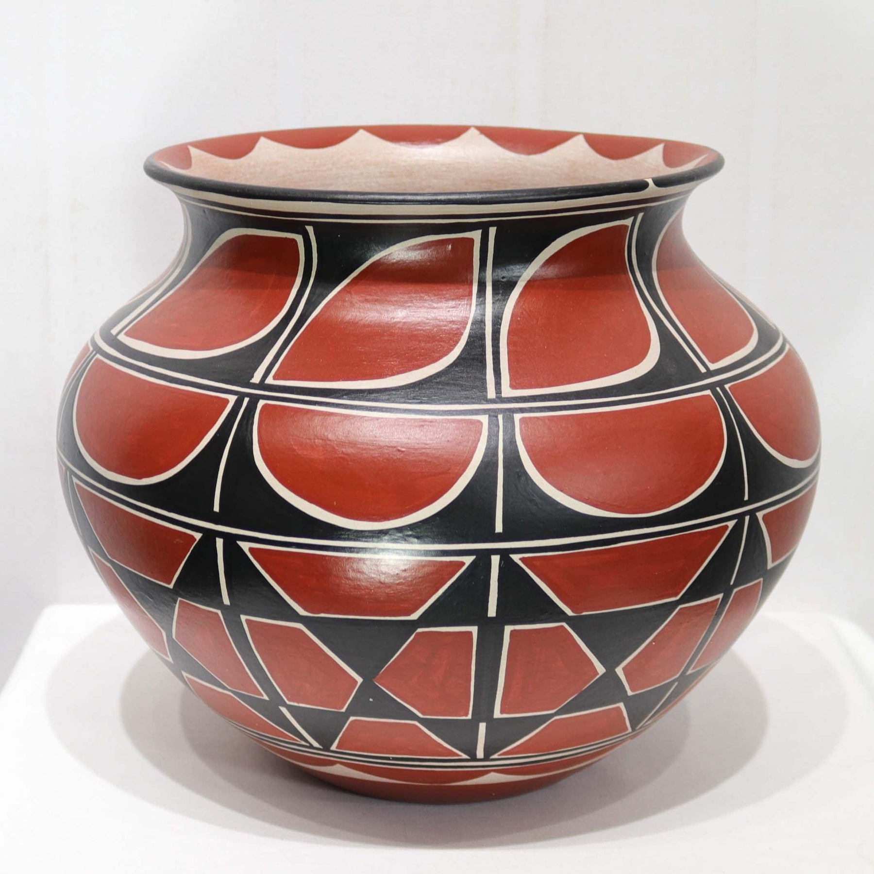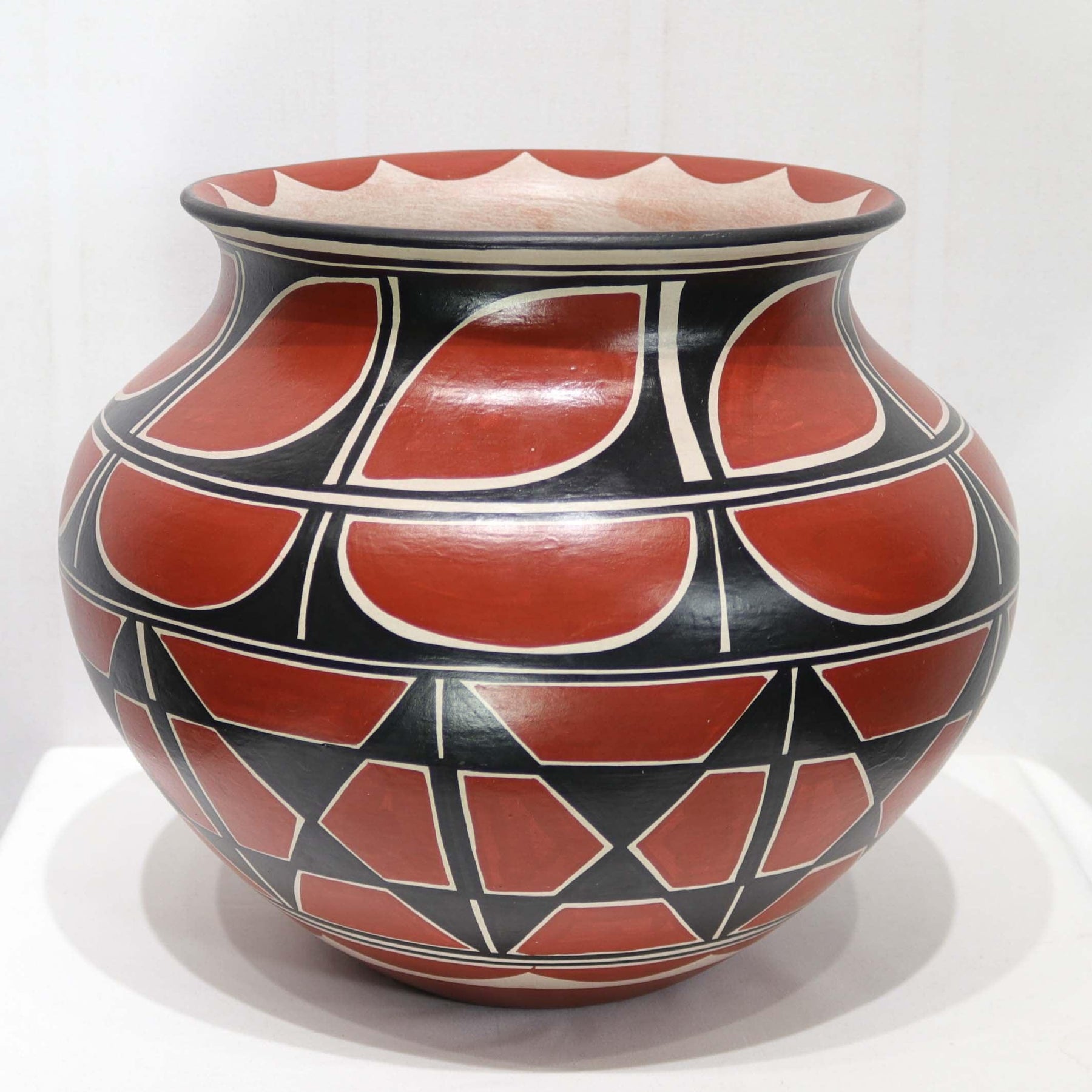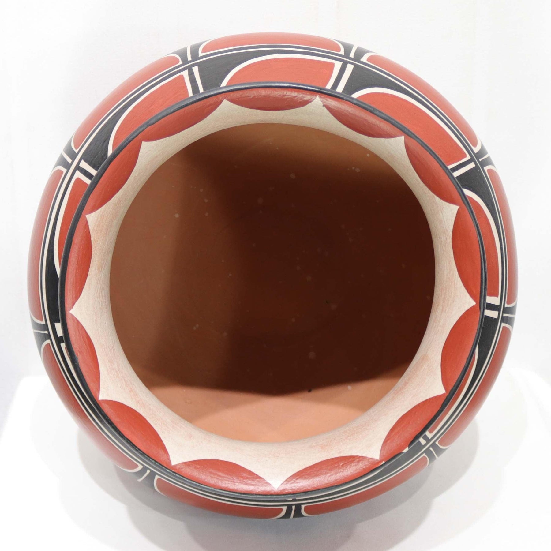 Large Hand-coiled and Traditionally Fired Santo Domingo Olla Featuring Hand-Painted Polychrome Designs using Natural Pigments. The rim has the classic Santo Domingo “spirit line” where there is a space in the painting. This pot is by Santo Domingo (Kewa) potter, Vidal Agiular (b. 1972). Vidal comes from a long family lineage of acclaimed potters.