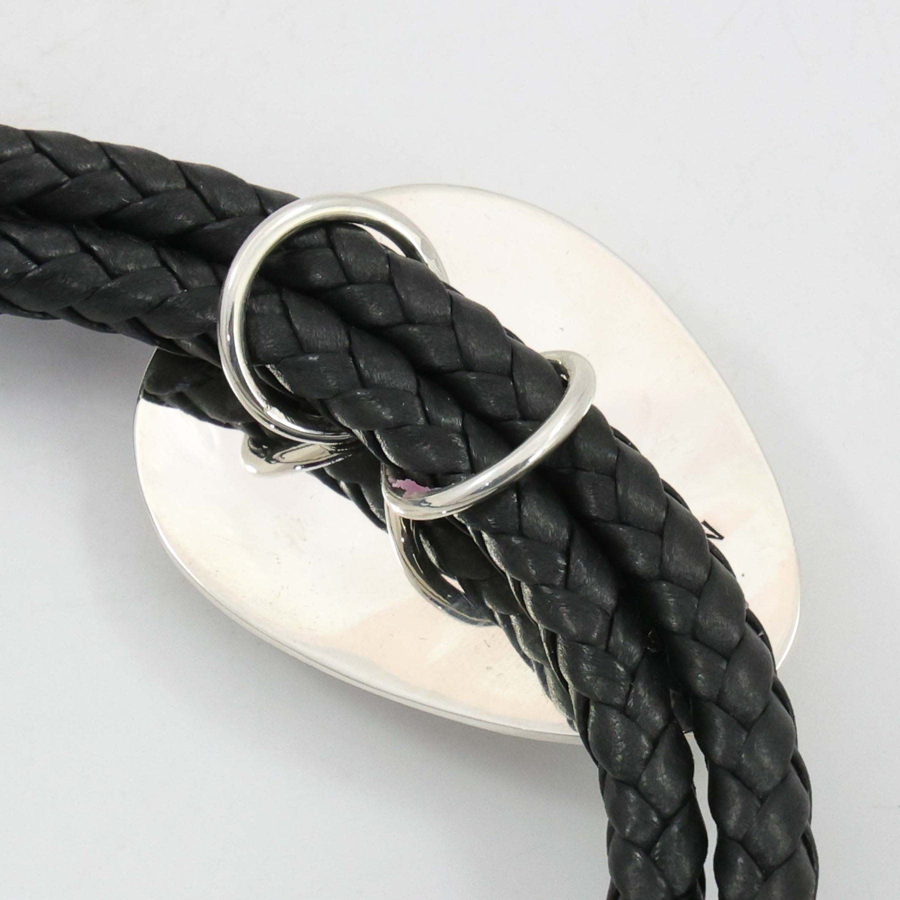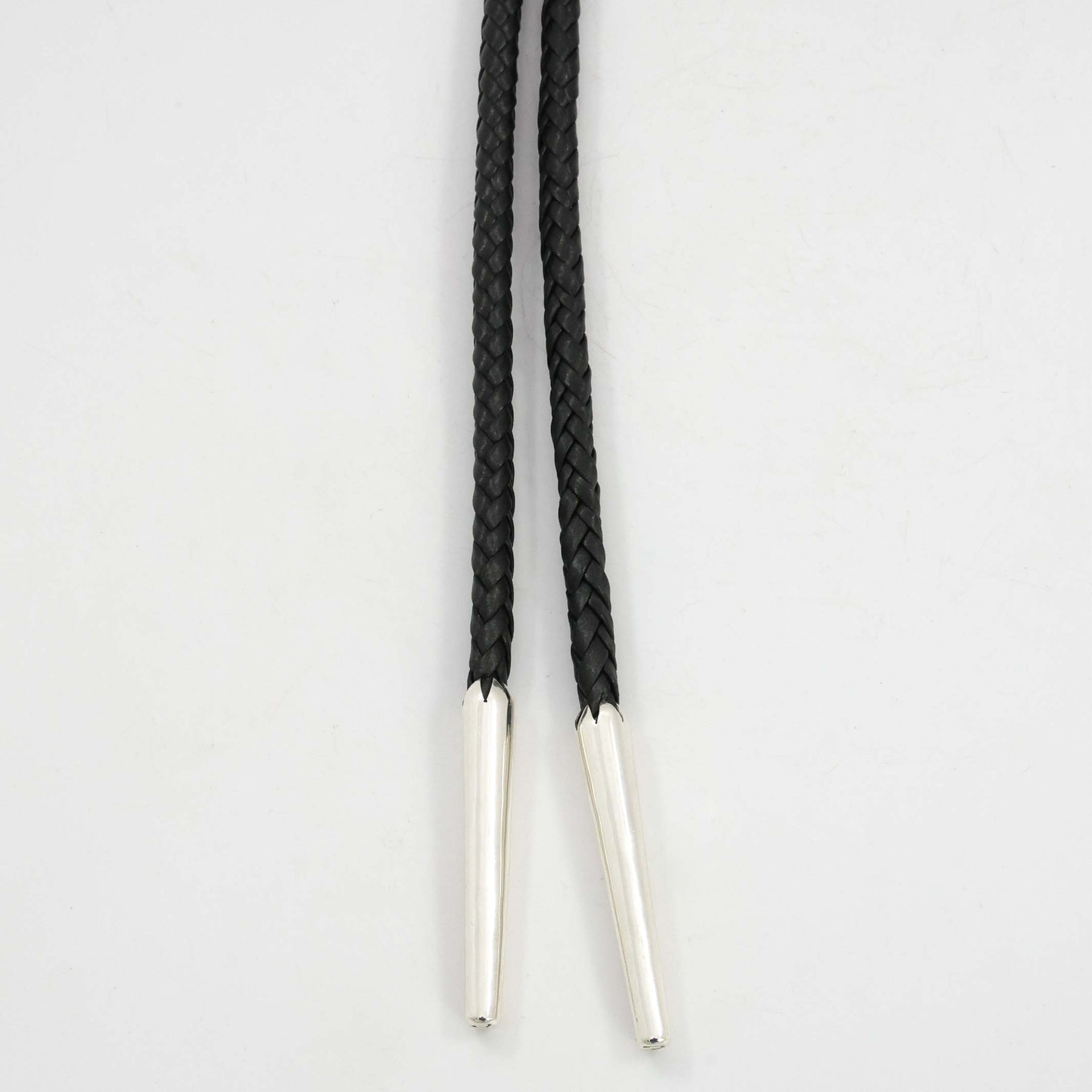 Sterling Silver Bola Tie with Hand-Stamped Designs and set with Natural Morenci Turquoise from Arizona. This bola tie has a figure eight backing, sterling silver tips, and a black leather cord.
