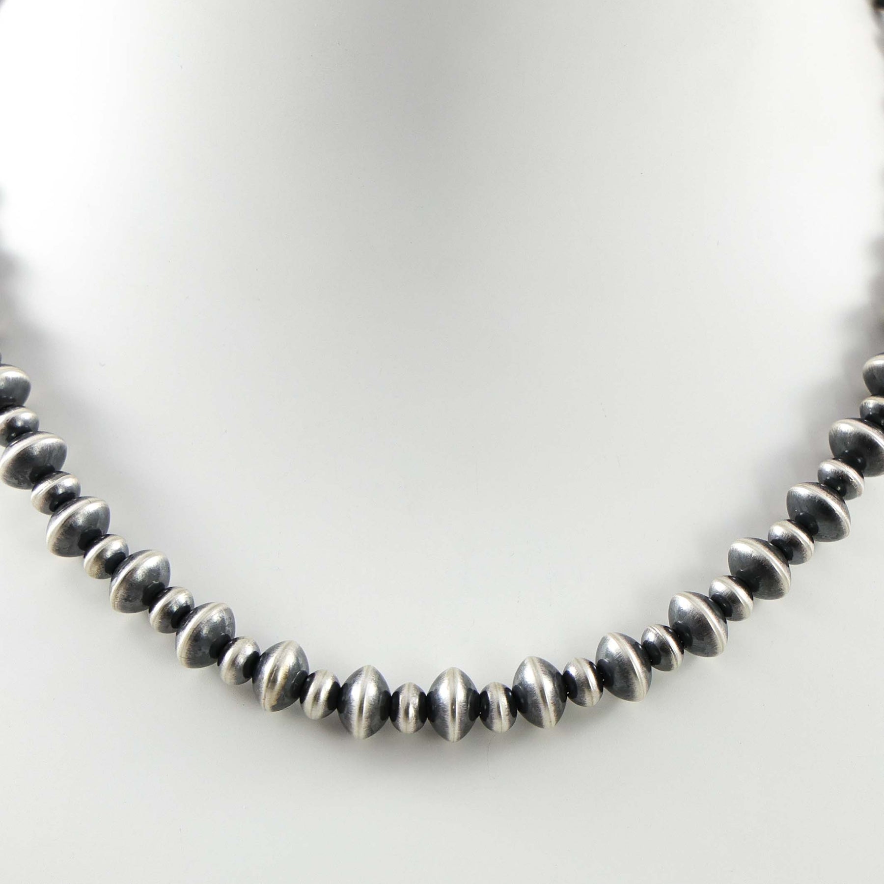 Single Strand Sterling Silver Navajo Pearl Necklace with Alternating Handmade Beads in an Oxidized Finish.