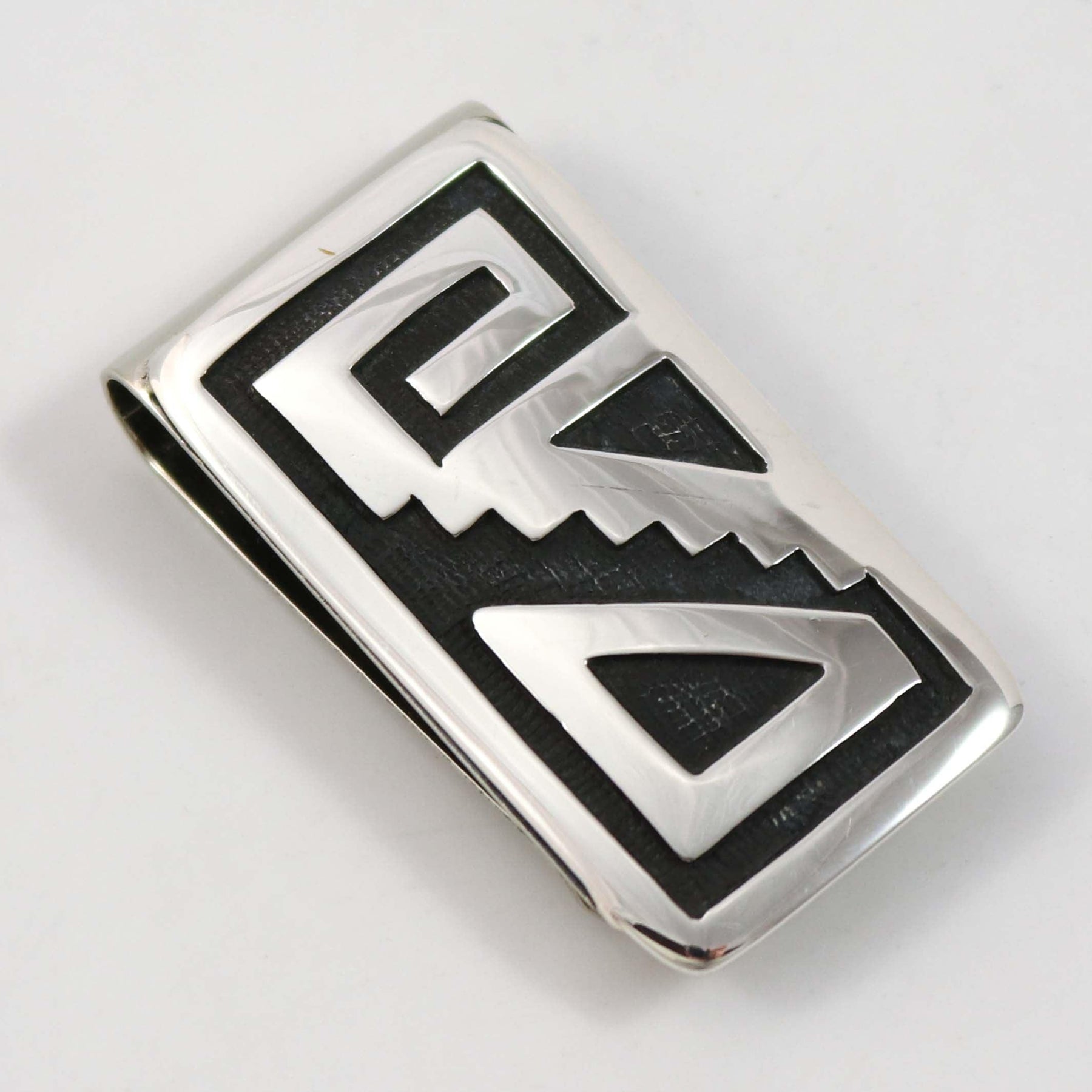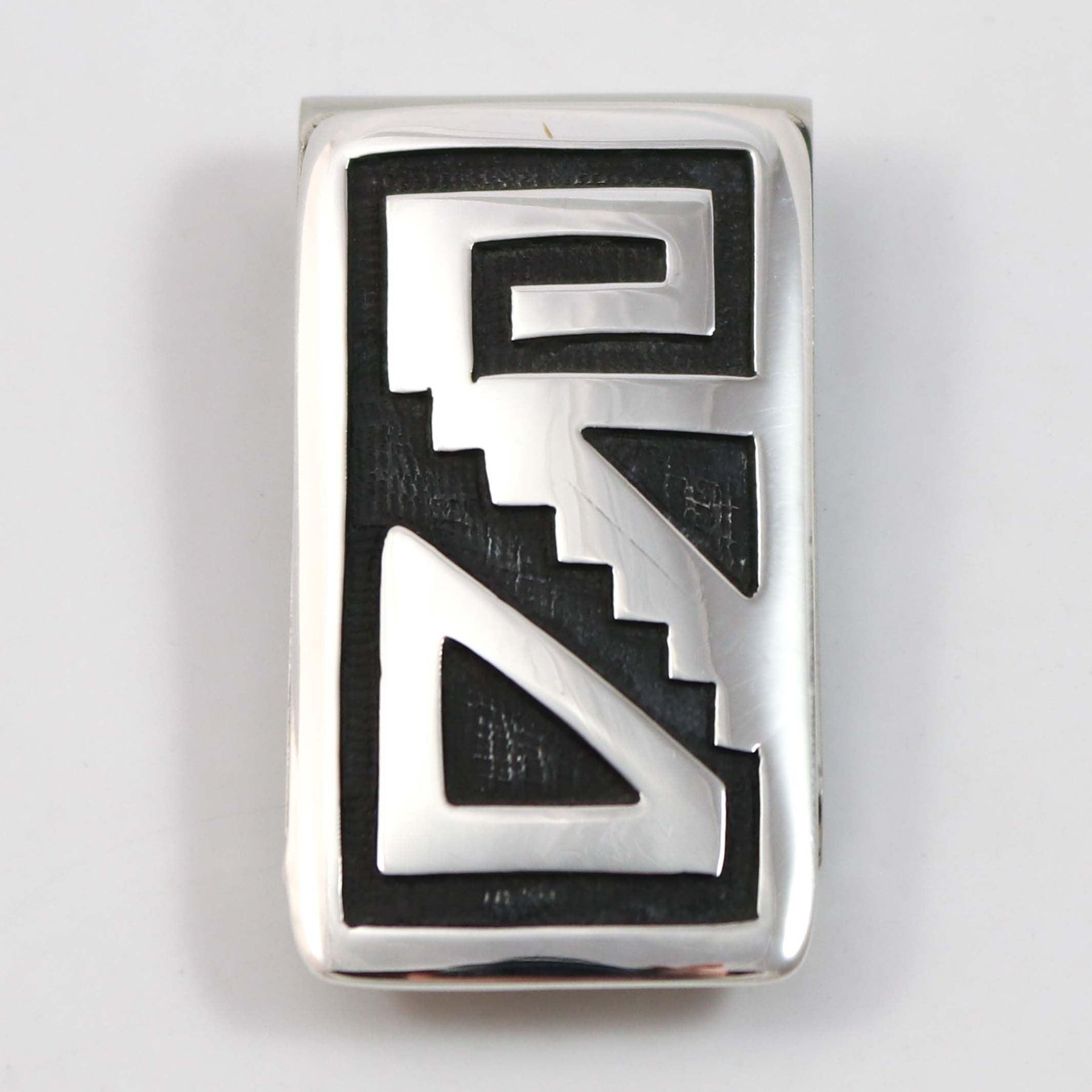 Stainless Steel Money Clip with a Sterling Silver Face featuring Hopi Overlaid Designs of a Raincloud and Whirlwind (the wind that brings rain).