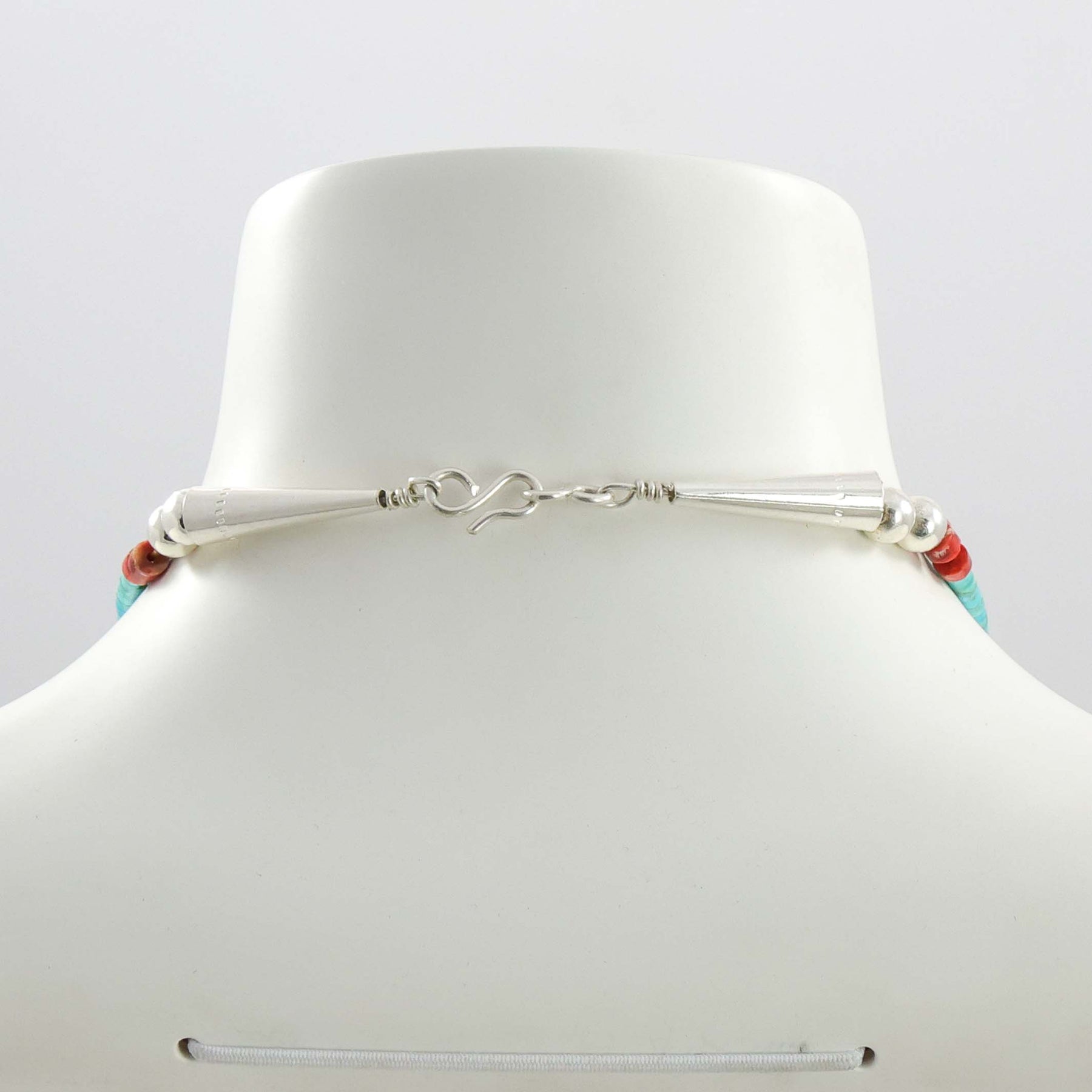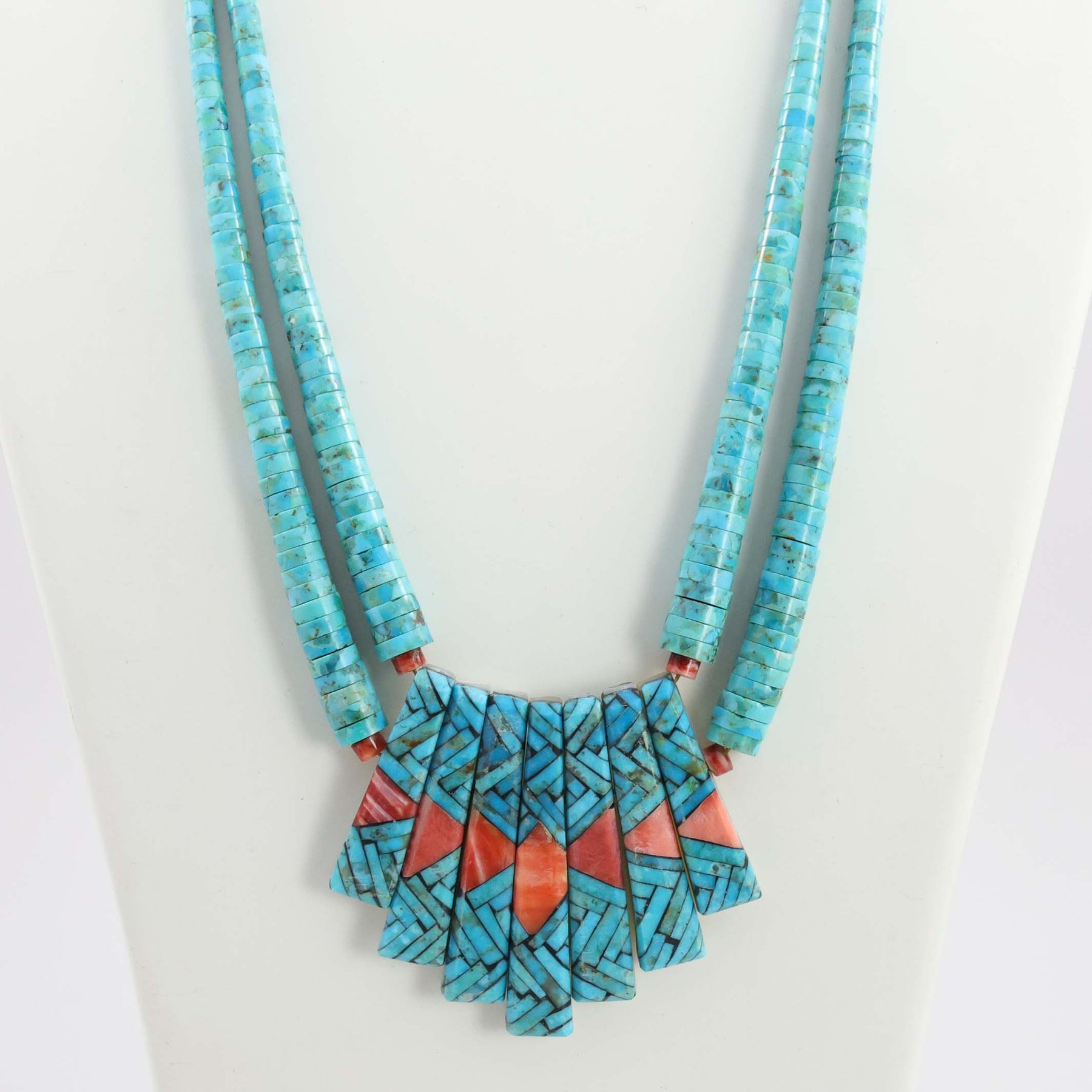 Two Strand Turquoise Bead Necklace Featuring Reversible Tabs with Inlaid Turquoise, Spiny Oyster Shell, and Mother of Pearl Shell. This necklace has sterling silver cones and clasp.