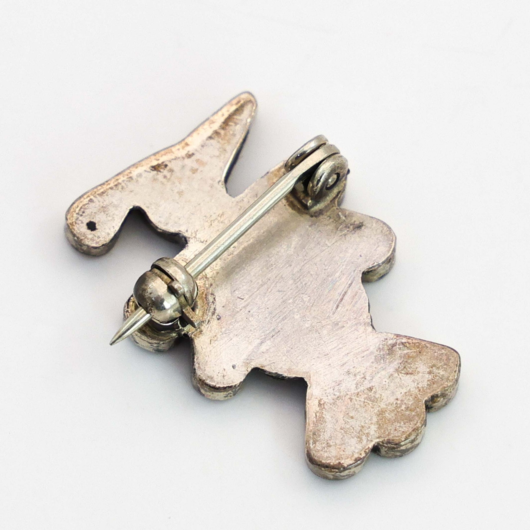 1960s Zuni Sterling Silver Thunderbird Pin featuring Hand-Cut Inlay using Black Jet, Mother of Pearl, Mediterranean Coral, and Natural American Turquoise. The Thunderbird is depicted with outstretched wings and geometric stonework, a charming example of 1960s Zuni channel inlay jewelry.