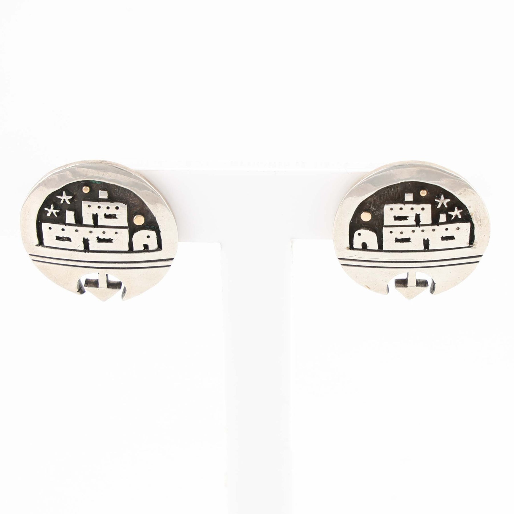Sterling Silver Post Earrings with Overlaid Pueblo Scene Design with 14k Gold Celestial Accents. By Santo Domingo (Kewa) artist, Joseph Coriz.