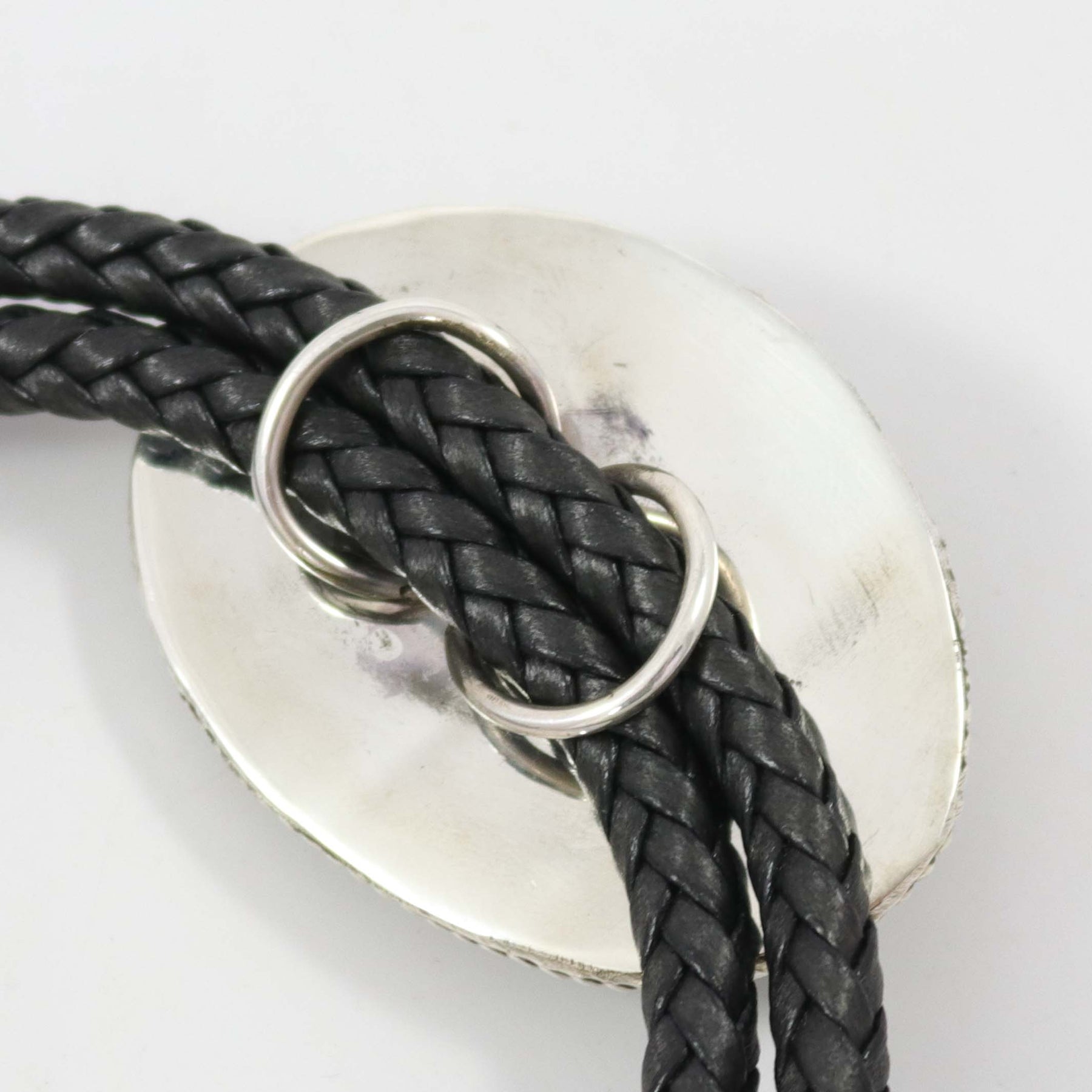 Sterling Silver Bola Tie set with Kingman Turquoise from Arizona. This bola tie has figure eight backing, sterling silver tips, and black leather cord.