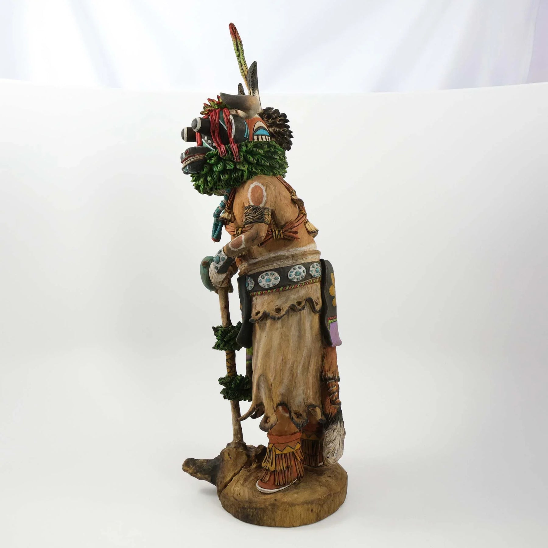 Hand-Carved and Painted Hopi Cow (Waka) Kachina Holding a Rattle and Staff. This kachina is carved from a single piece of cottonwood root, honoring the spirit of abundance and nourishment. With its gentle presence and earth-toned detailing, it reflects the agricultural blessings central to Hopi life and tradition.