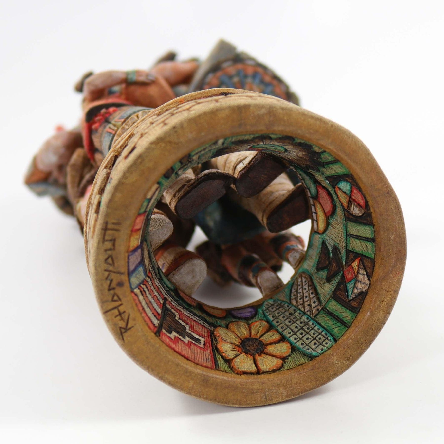 Hand Carved Hopi Kachina Doll with a Family of Heheya Kachinas Singing for Rain including a Heheya (Male) and Heheya Mana (Female) and two children. This carving includes an intricately carved base that is hollowed out from the inside and includes beautiful designs inside the base. This piece is carved entirely out of one piece of cottonwood root by award winning Hopi artist, Ronald Honyouti.