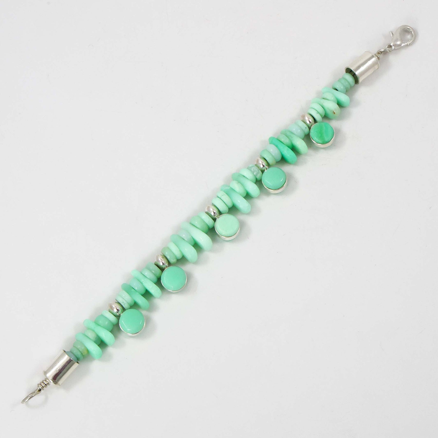 Sterling Silver Treasure Bracelet with Hand-Rolled Beads, Tabs, and Reversible Pendants made out of Chrysoprase.