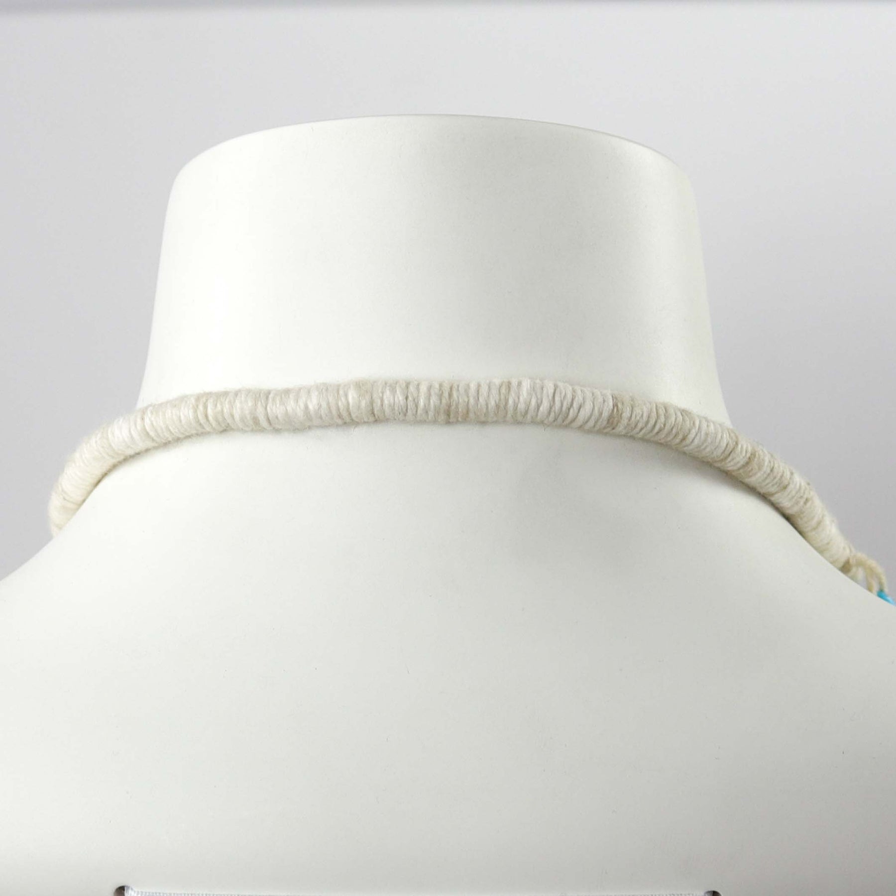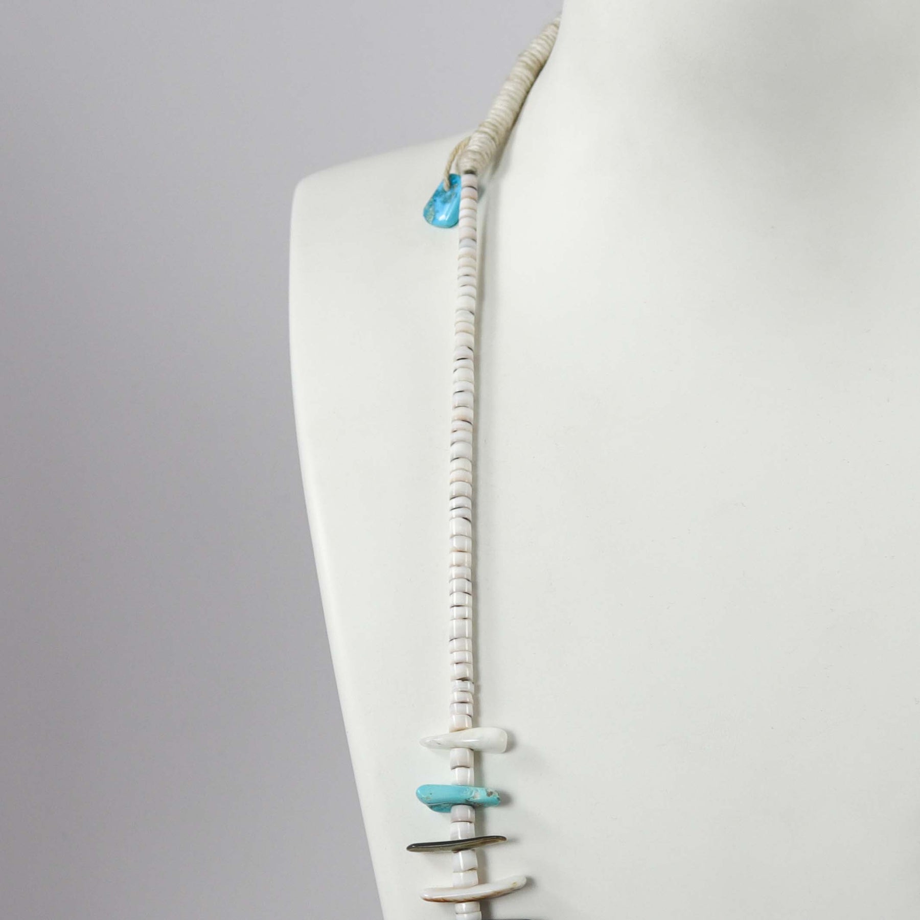 Single Strand Necklace with Shell Heishi Beads and Tabs made from Natural Sleeping Beauty Turquoise, Jet, Spiny Oyster Shell, Abalone Conus Shell, and Clam Shell. This necklace has a traditionally wrapped cotton backing with a Sleeping Beauty Turquoise Tab with Coral (Cheyenne’s signature).