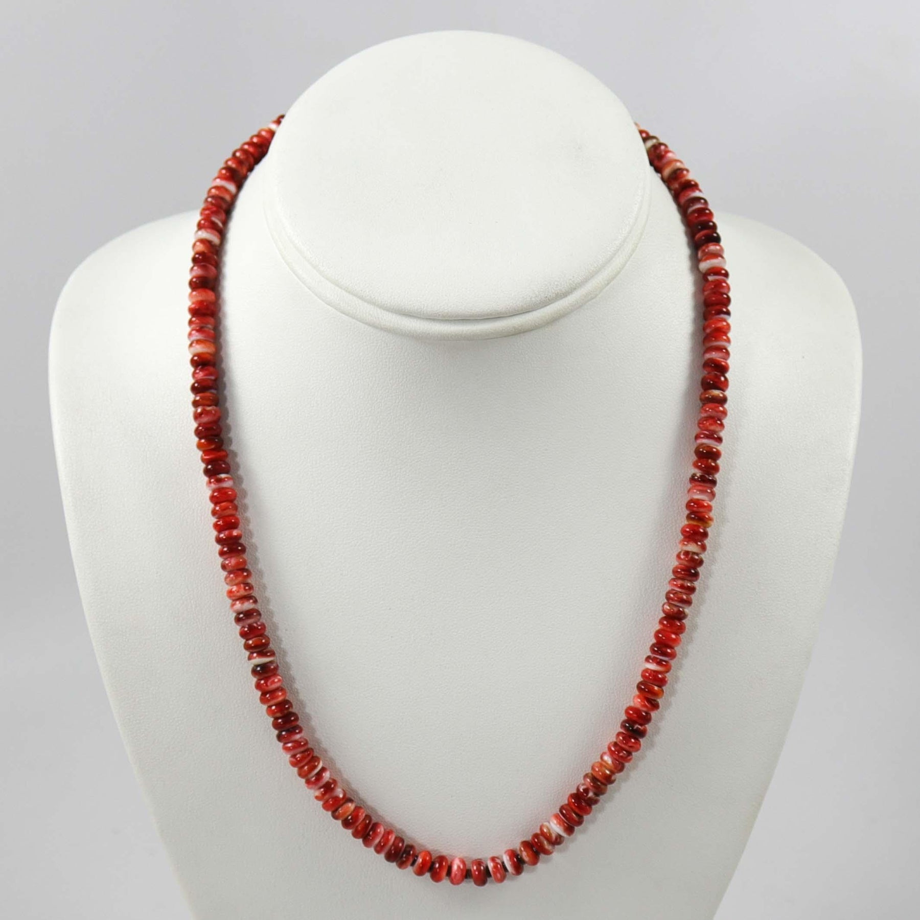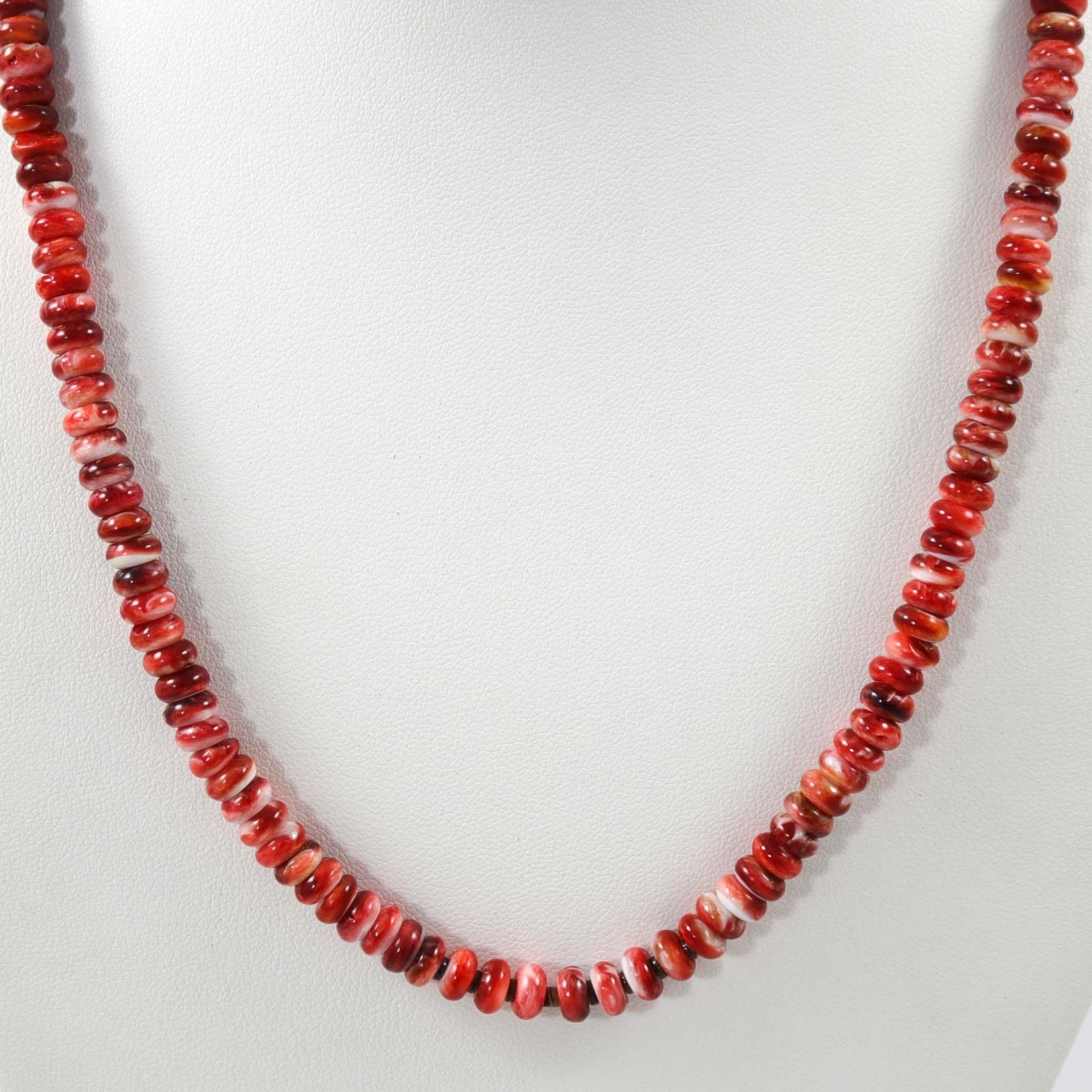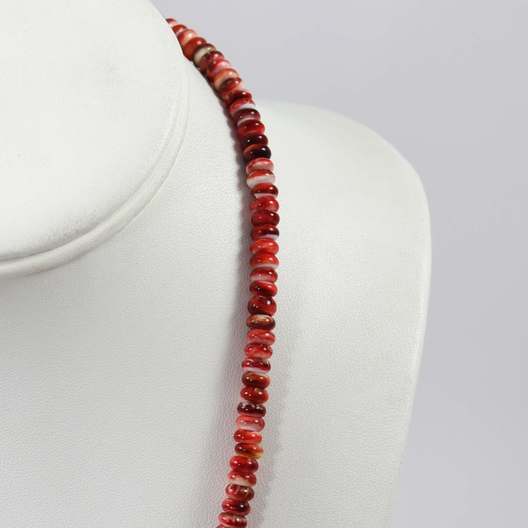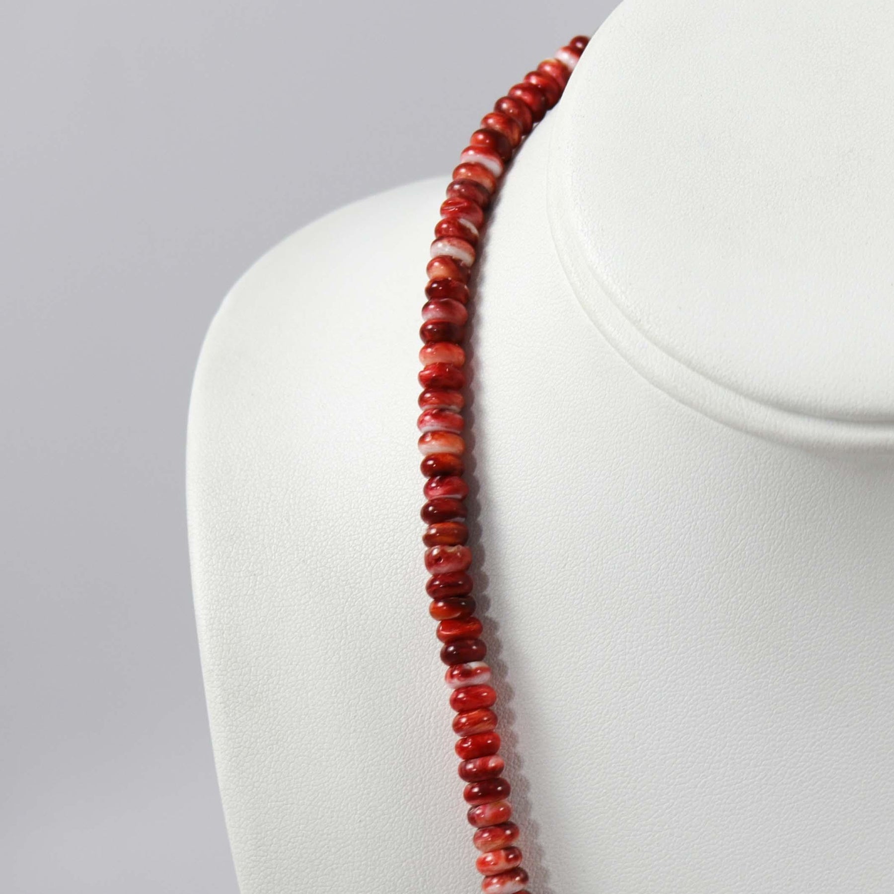Single Strand Bead Necklace with Hand Rolled Red Spiny Oyster Shell Beads with Pen Shell Heishi Beads and a Sterling Silver Clasp.