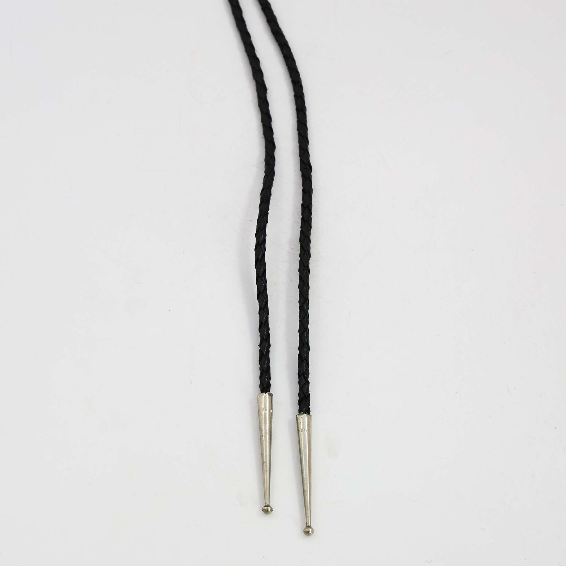 Santo Domingo Sterling Silver Bola Tie with Hand-Stamped Designs and set with Black Onyx. This bola tie has a clamp backing, sterling silver tips, and a 39” black leather cord. Made in the 2000s by Santo Domingo / Kewa silversmith, Clyde Aguilar.