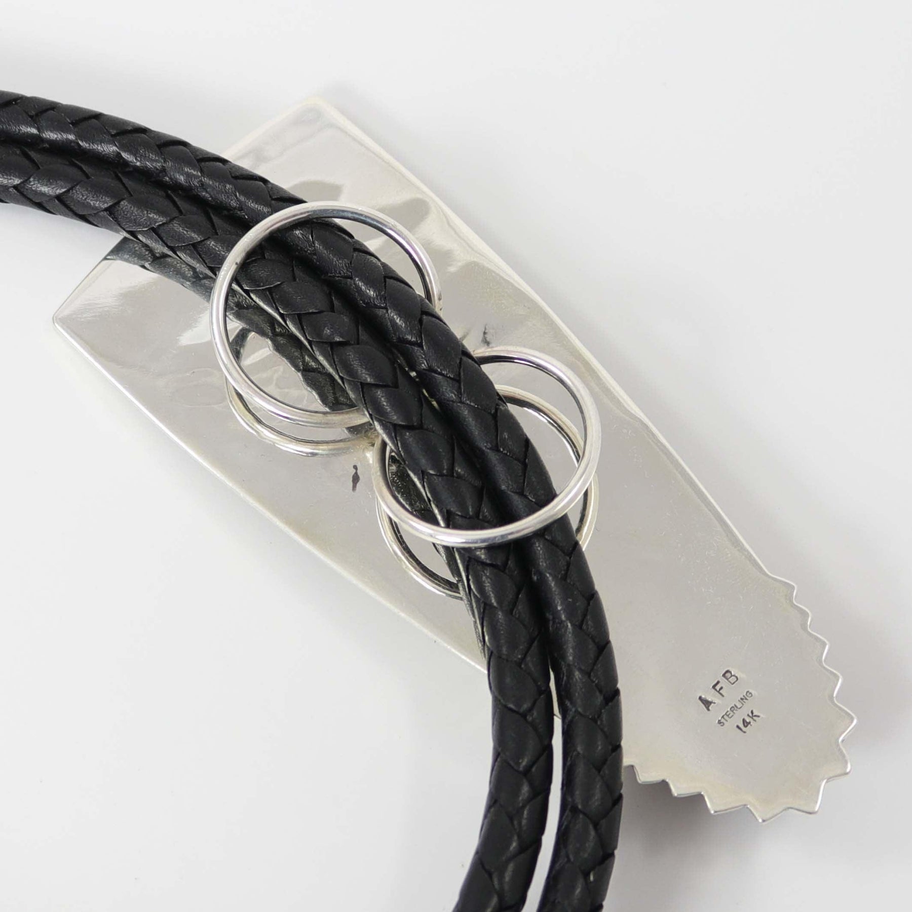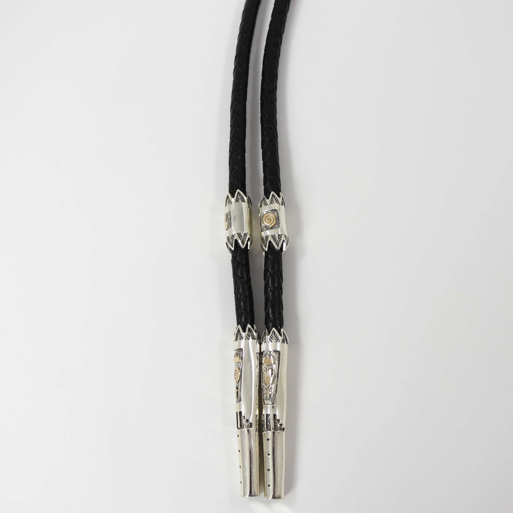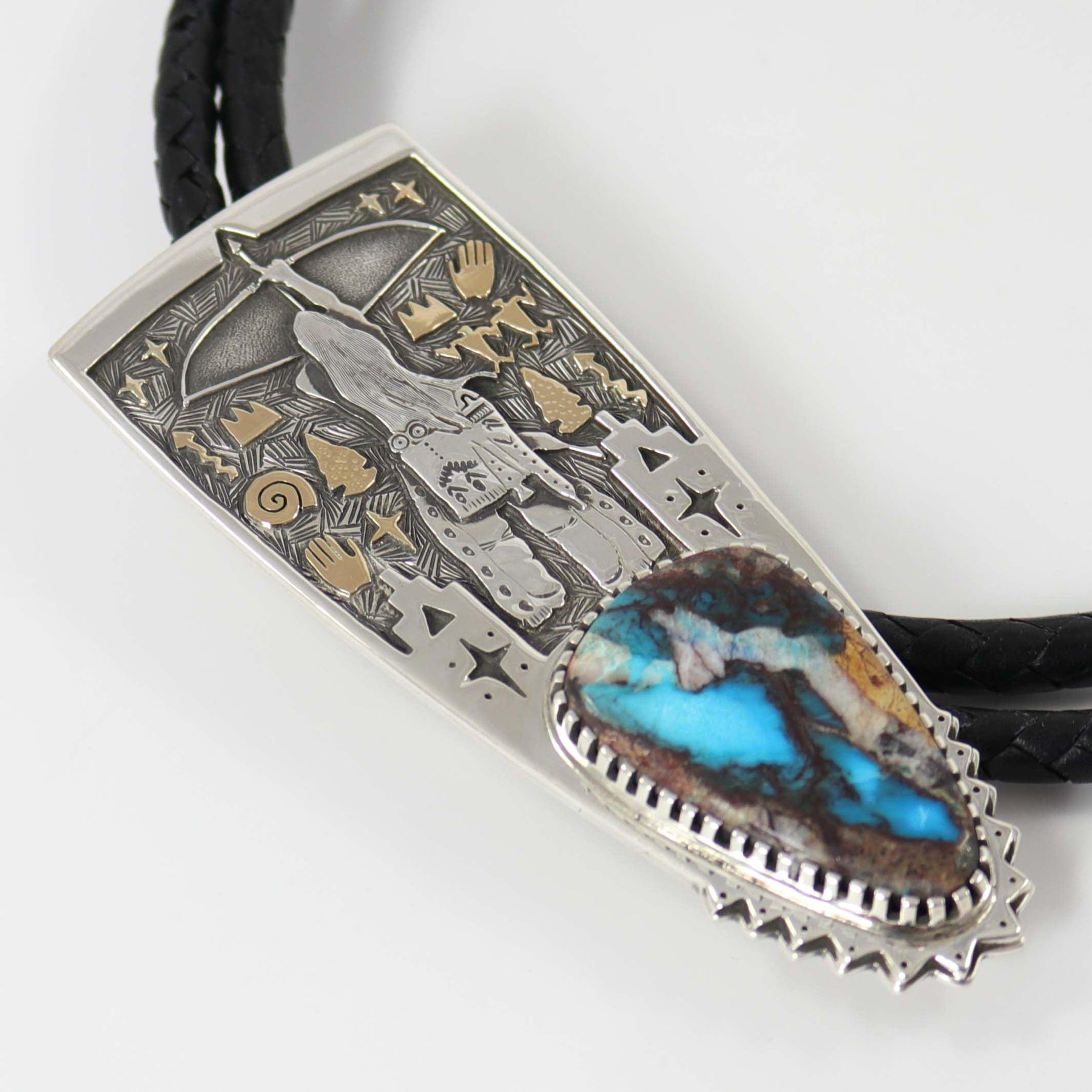 Sterling Silver Bola Tie Depicting an Archer with a Bow and Arrow Pointed to the Sky. This bola tie features natural Bisbee turquoise from Arizona and 14k gold petroglyph symbols. The piece also features handmade sterling silver tips and a black leather cord.