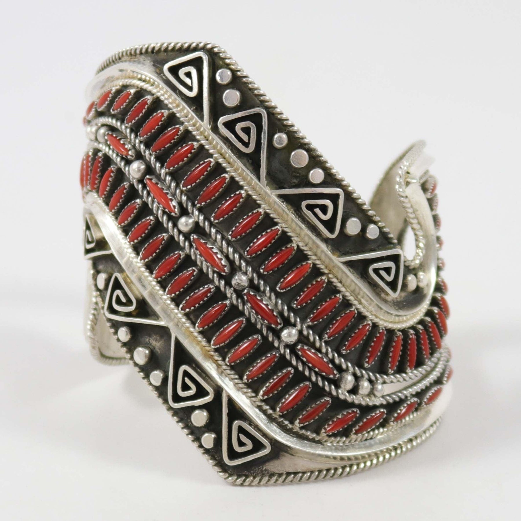 Wide Sterling Silver “Carol” Cuff Bracelet set with Mediterranean Coral and featuring Applique Bent Wire Designs.