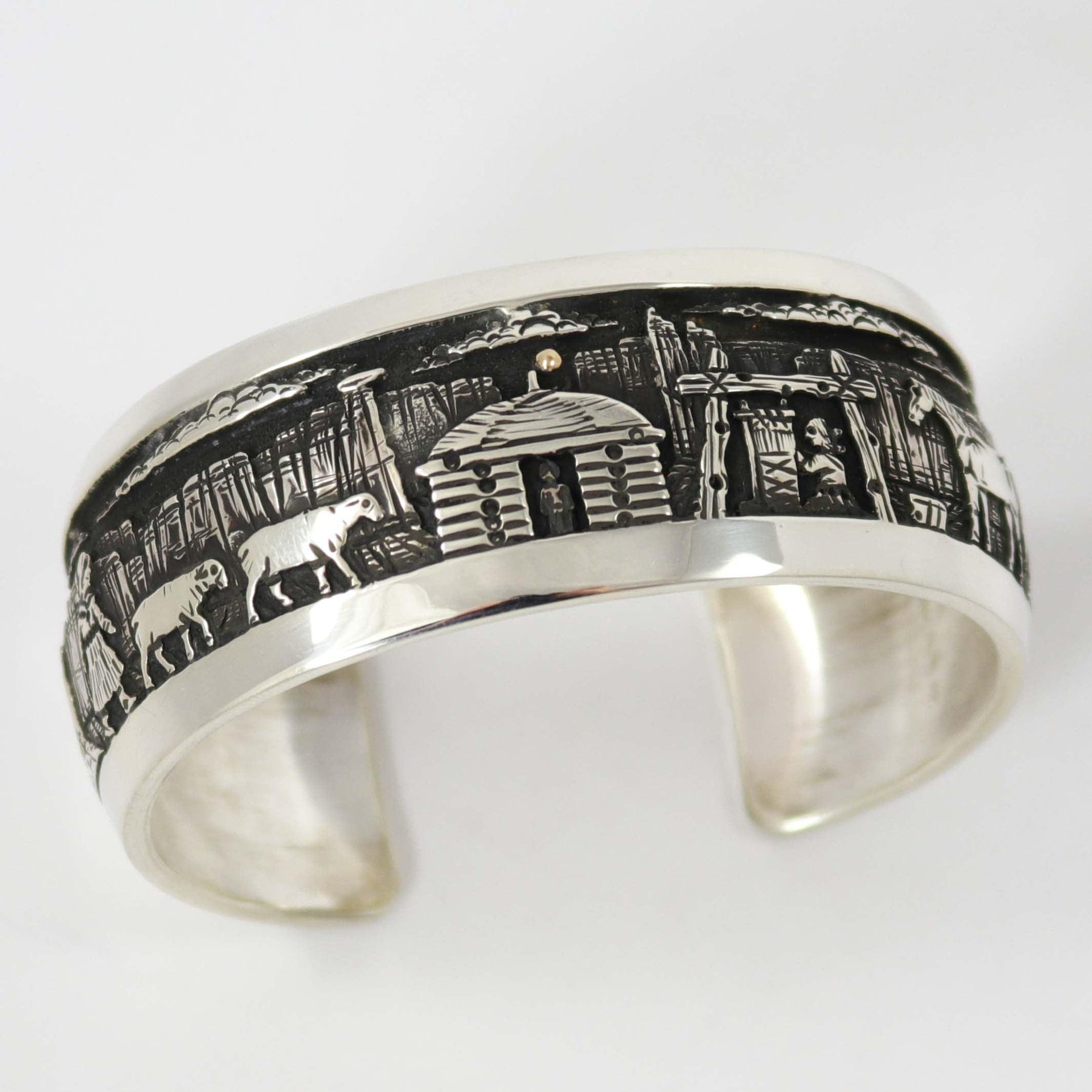 Sterling Silver Cuff Bracelet with an Intricate Navajo Storyteller Design Depicting Traditional Navajo Life. This cuff features four layers of details, including a hogan, weaver at the loom, sheep, horse, 14k gold sun, and Canyon de Chelly Background.