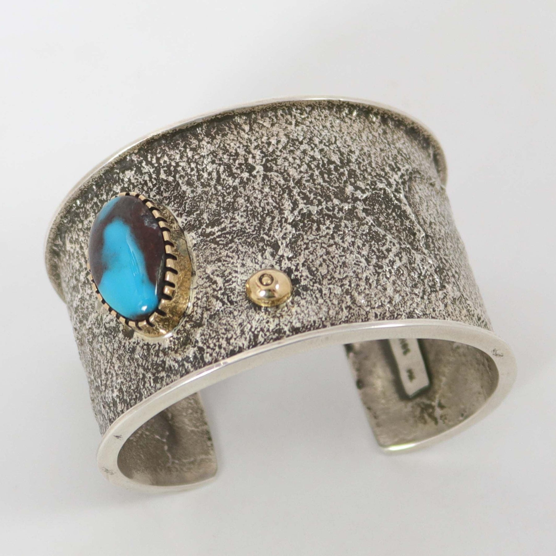 Wide Tufa Cast Sterling Silver Cuff Bracelet with a 14k Gold Applique Dot and with Natural Bisbee Turquoise set in a 14k Gold Bezel.