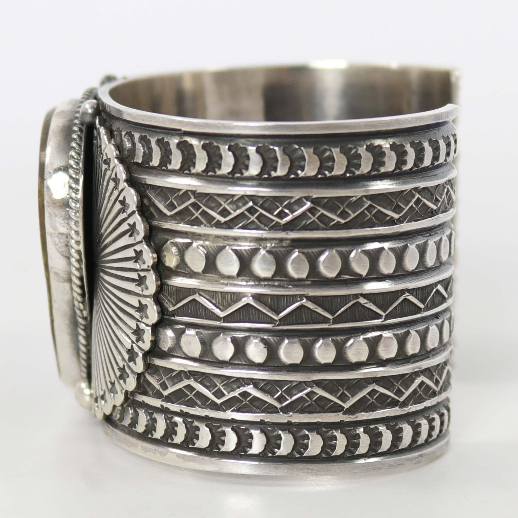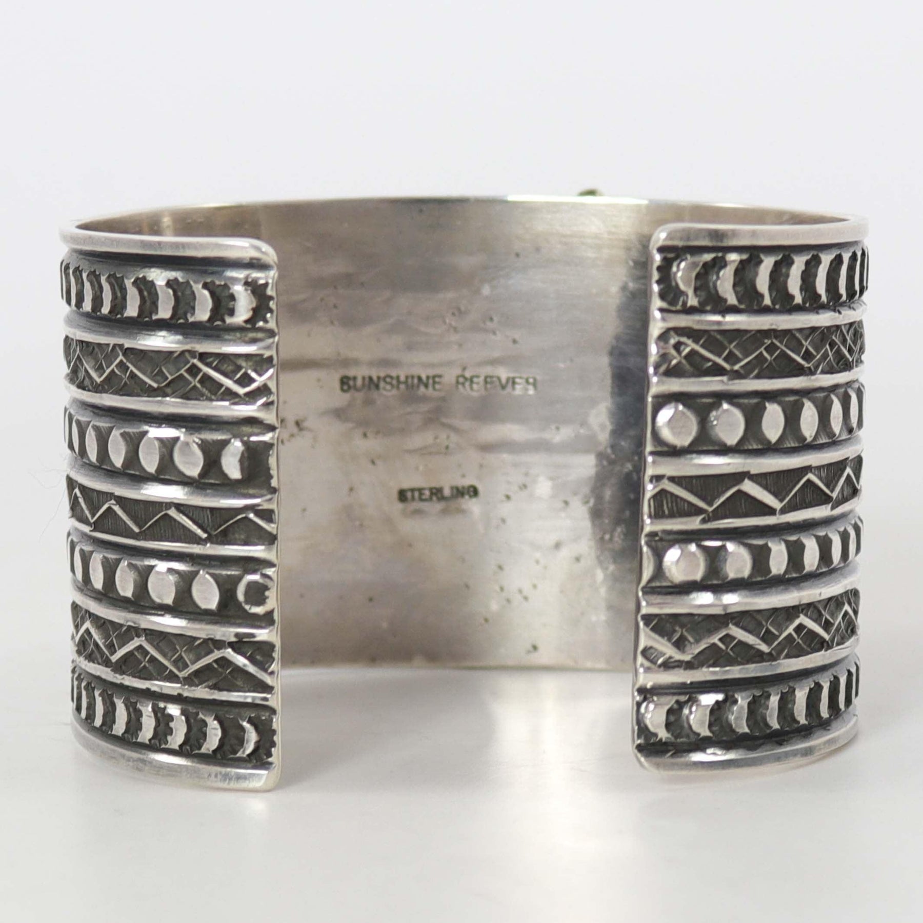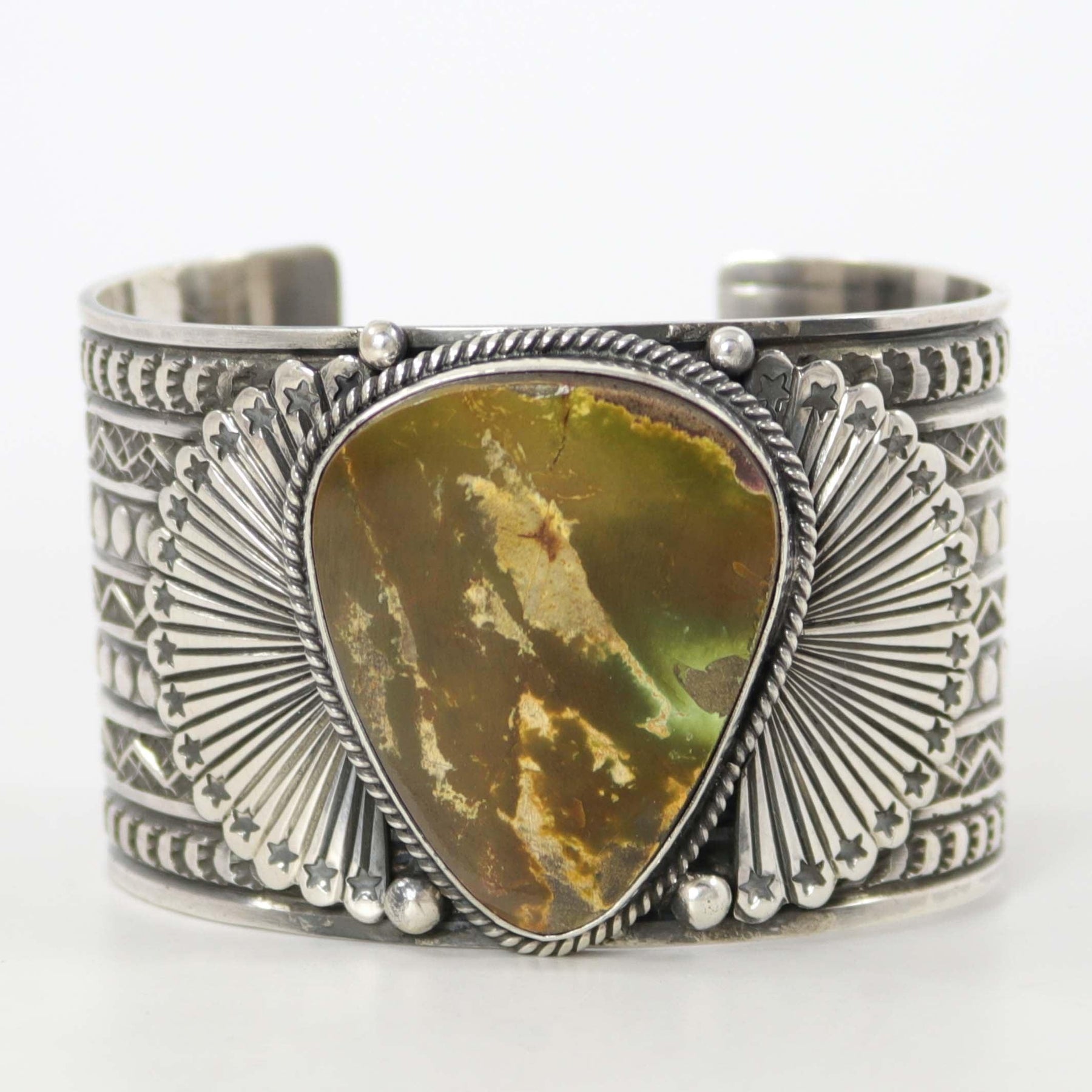 Wide Sterling Silver Cuff Bracelet with Hand-Stamped Designs and set with Natural Royston Turquoise from Nevada.