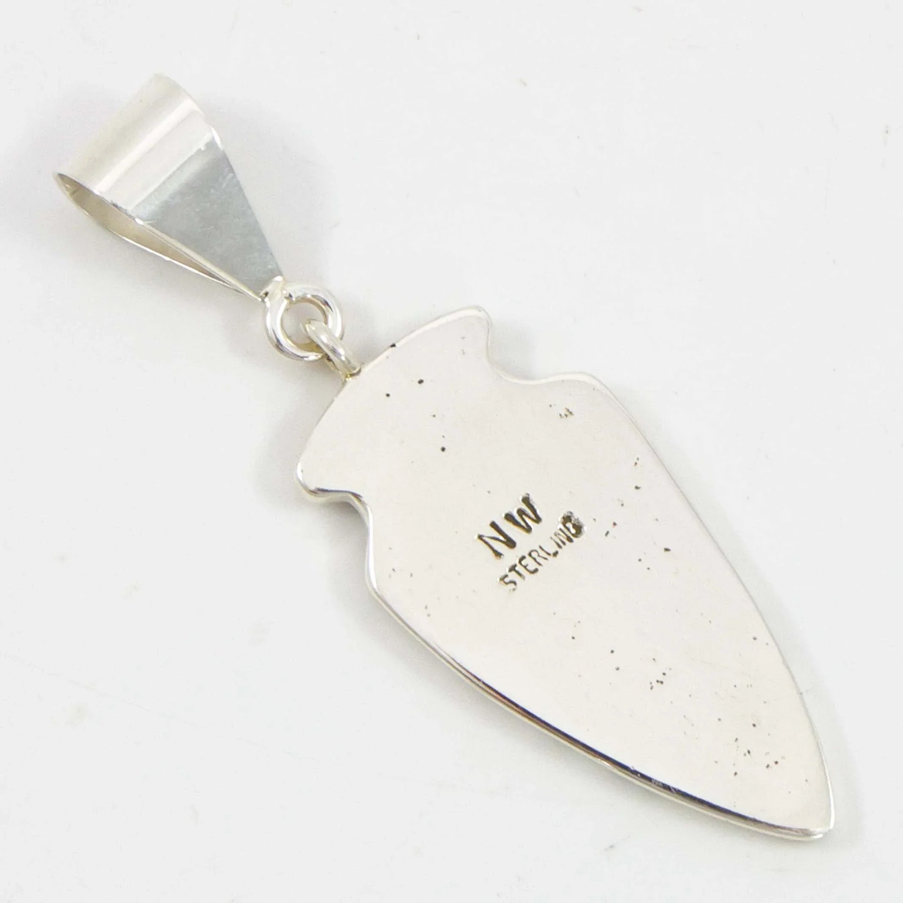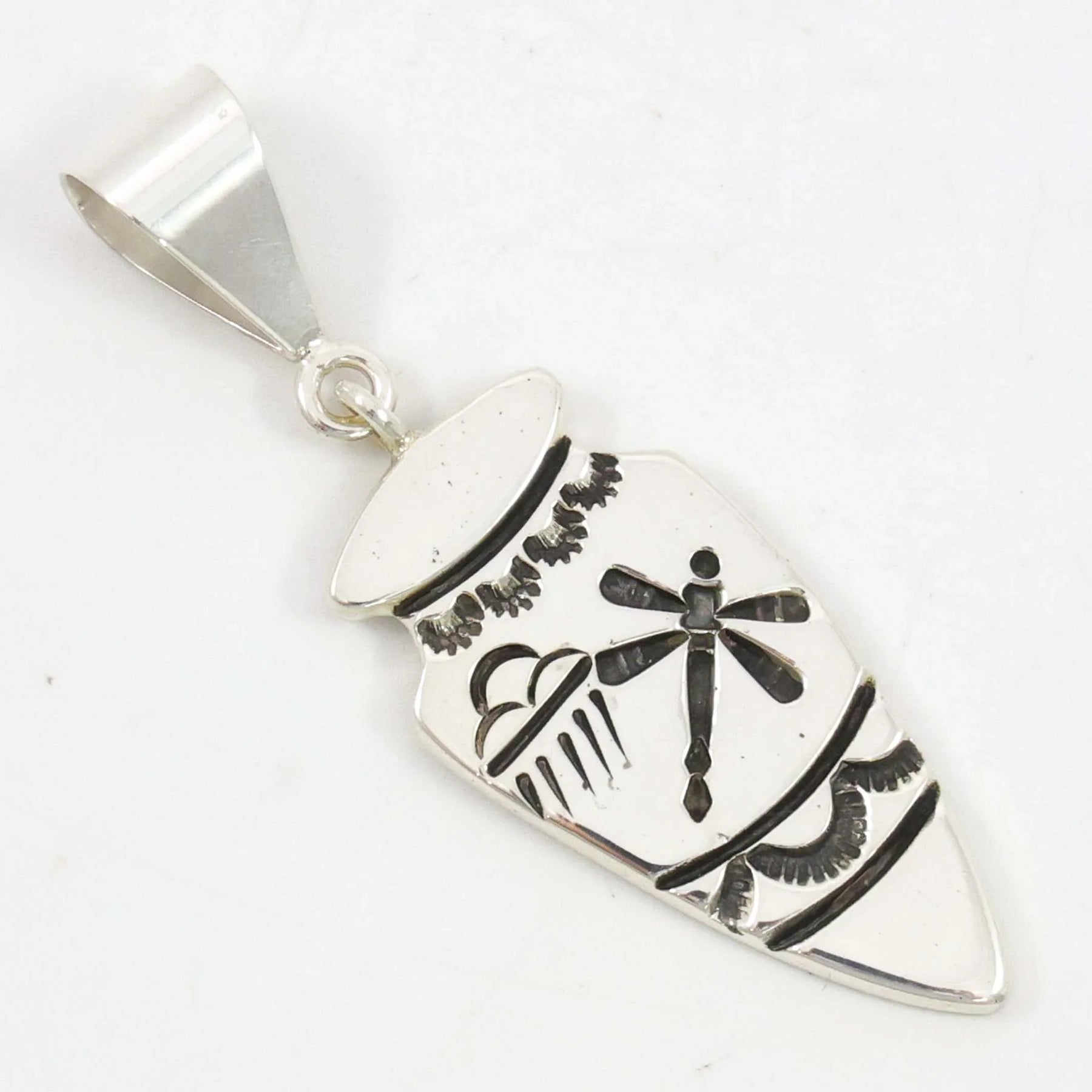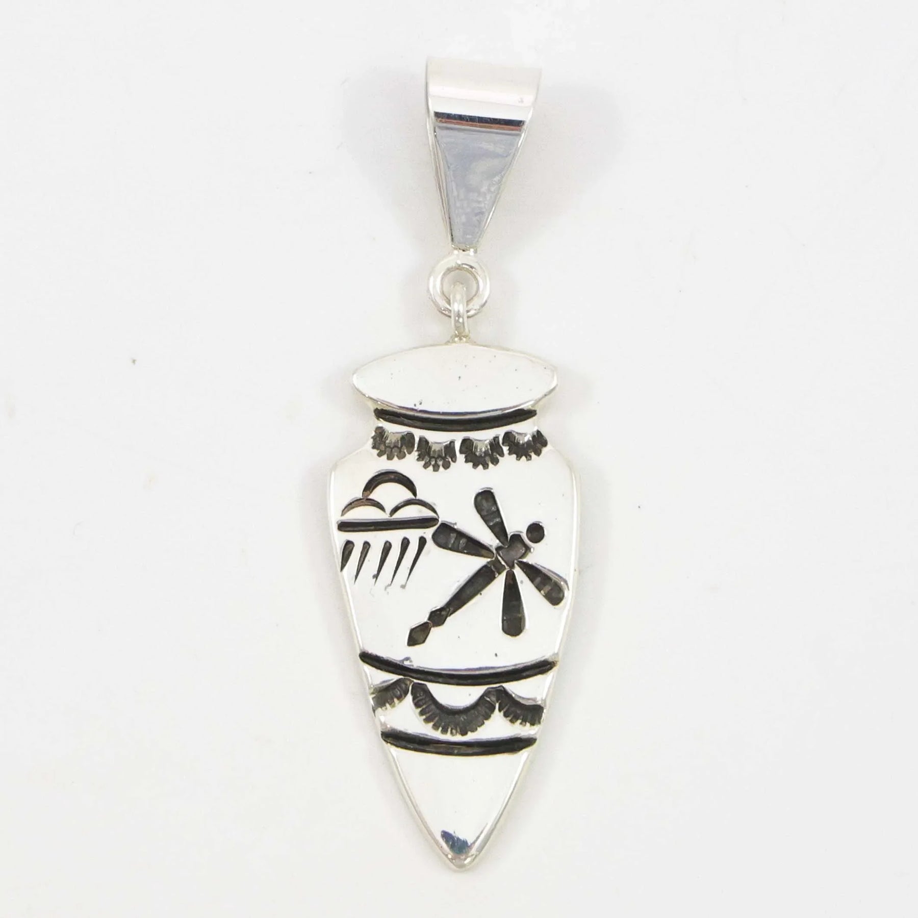 Sterling Silver Arrowhead Pendant with Hand-Stamped Dragonfly and Rain Cloud Design.
