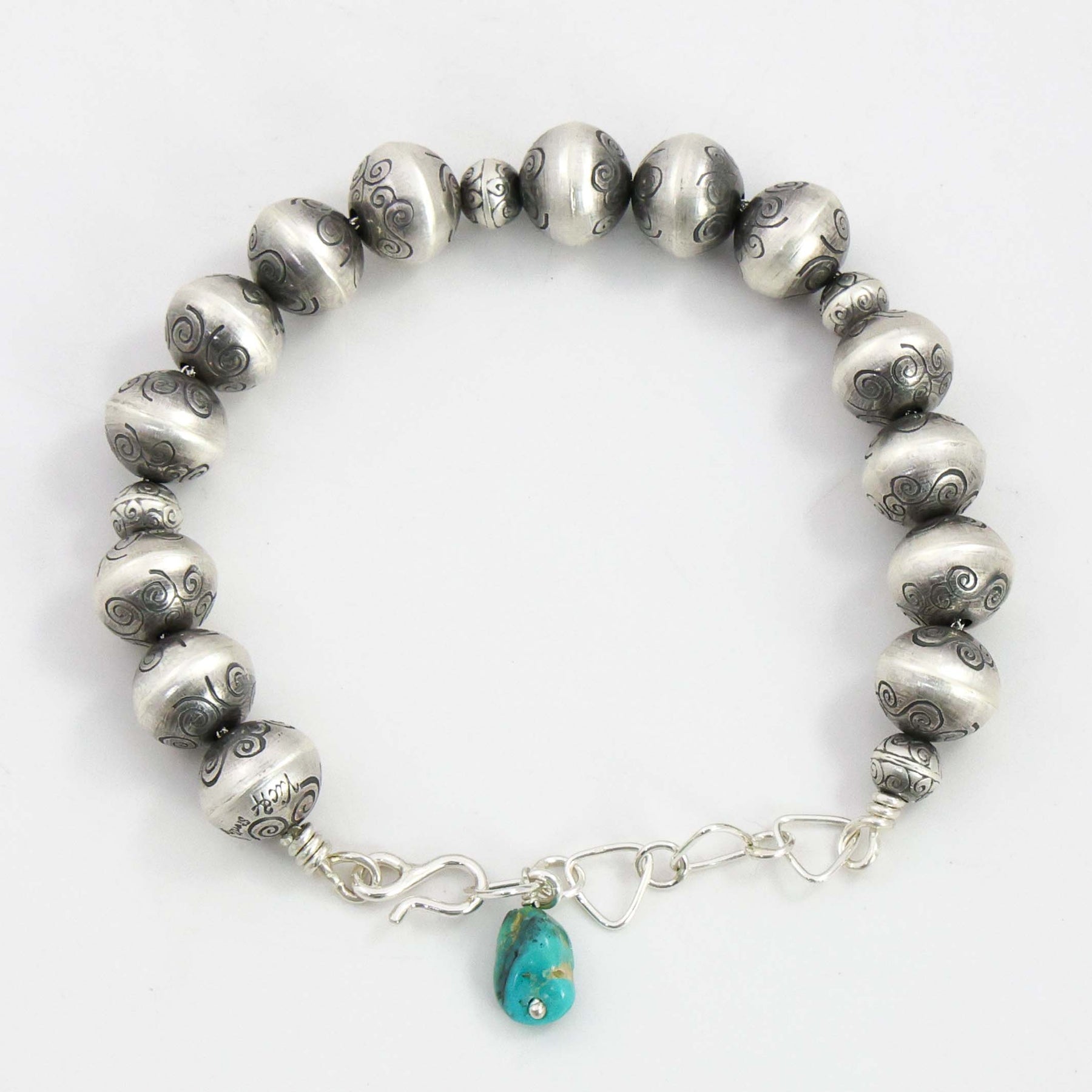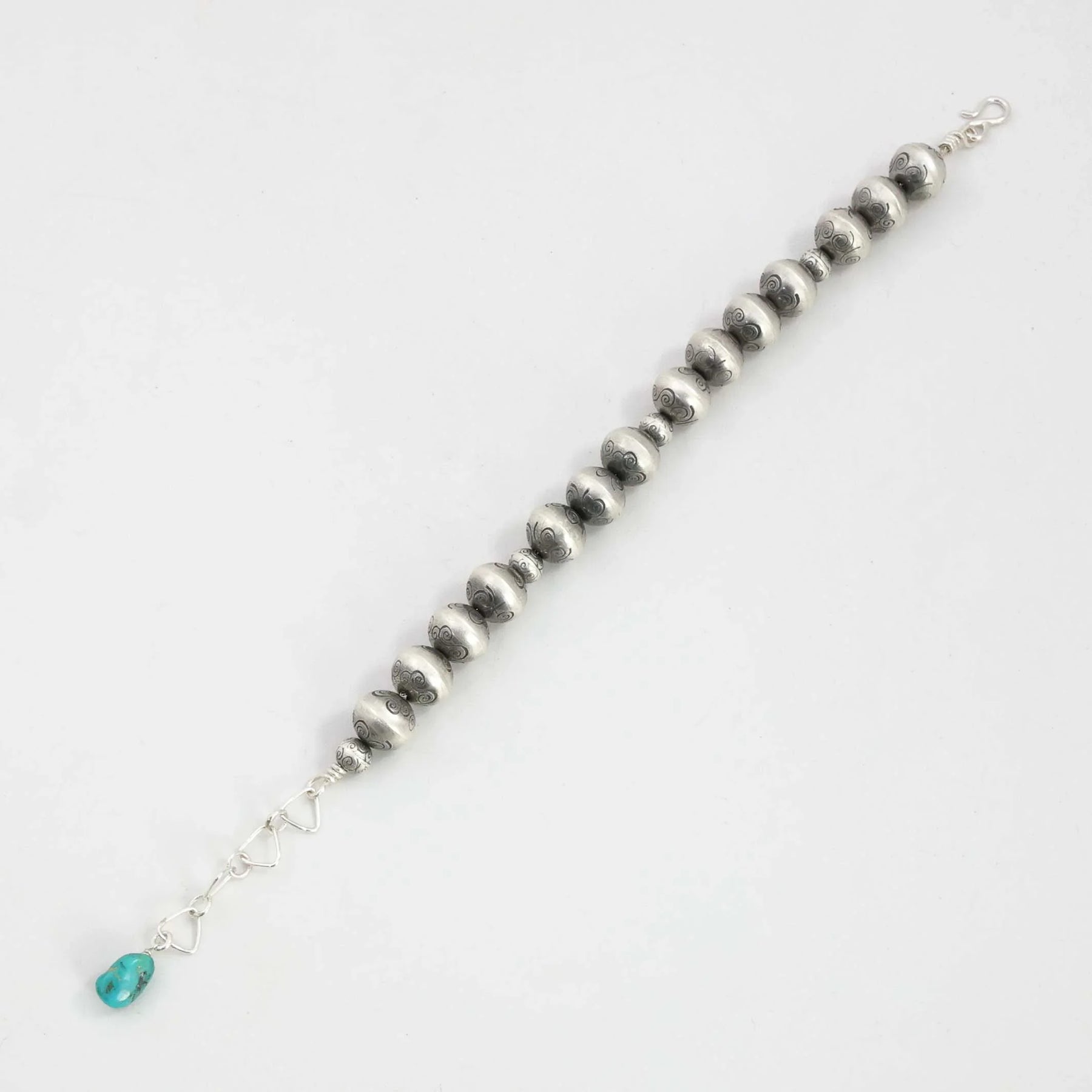 Sterling Silver Navajo Pearl Bracelet Featuring Handmade Beads with Hand-Stamped Designs and an Oxidized Finish.  This bracelet has an adjustable link clasp and turquoise bead charm.