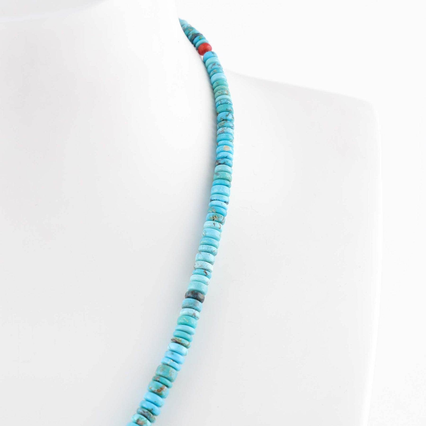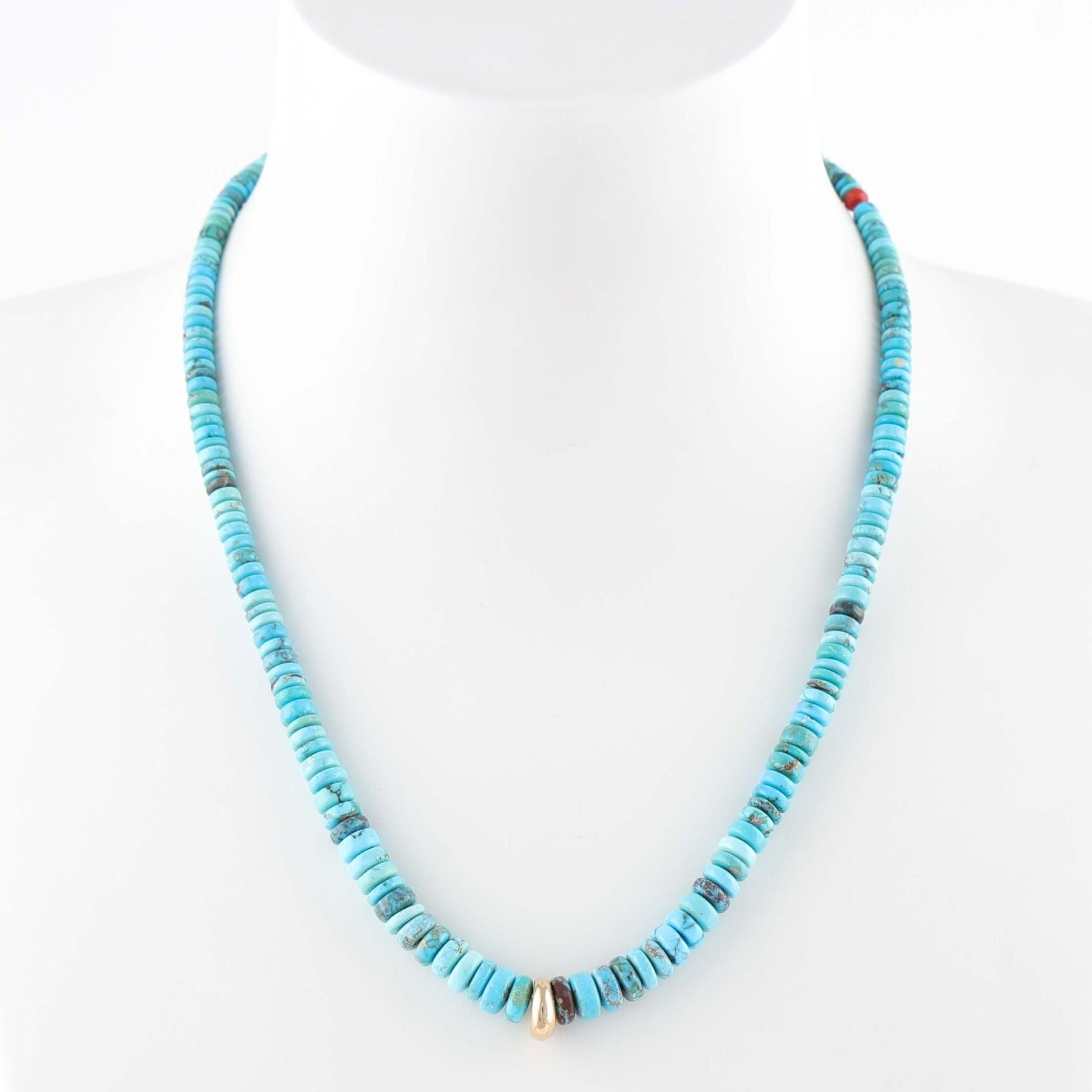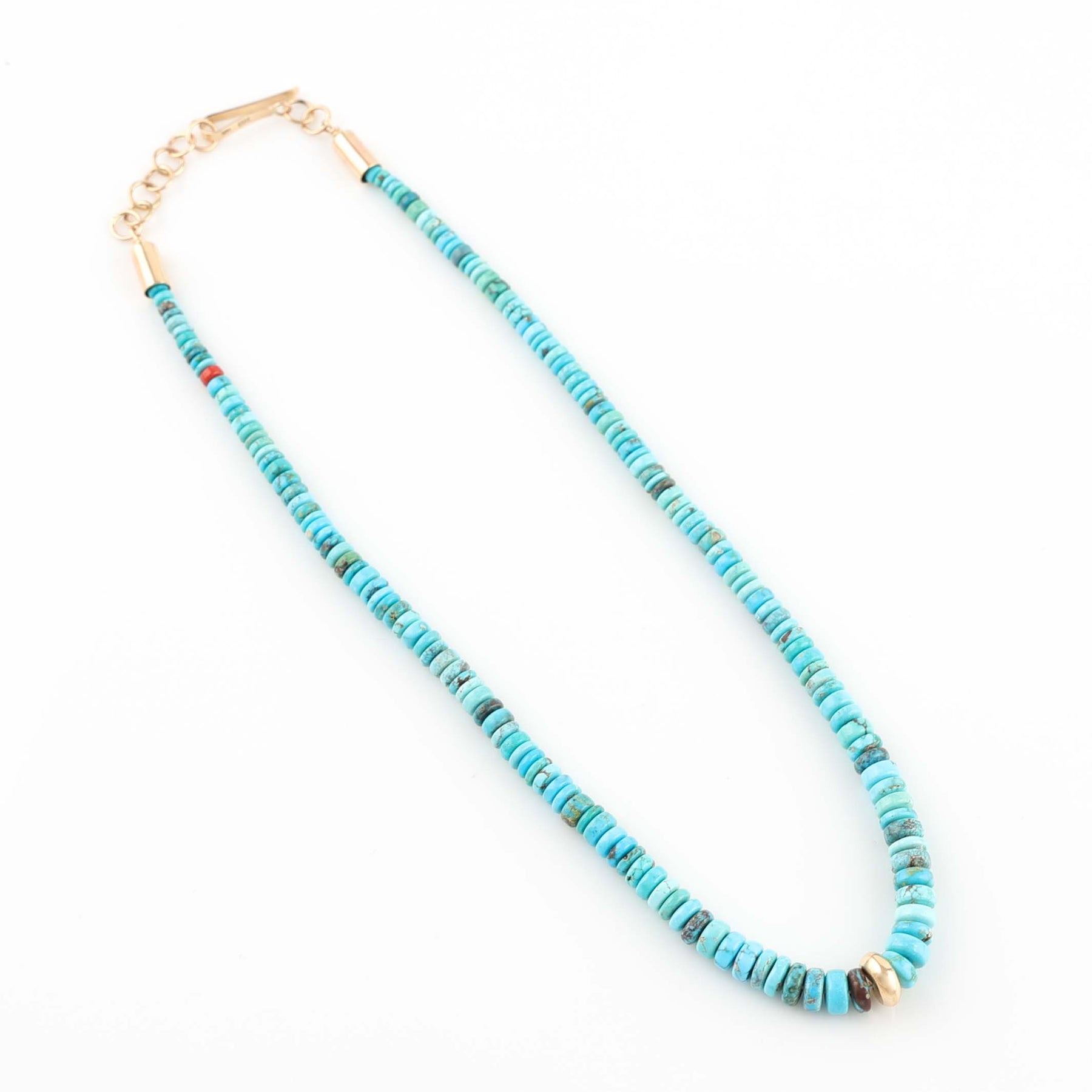 Single Strand Necklace with Graduated Hand-Rolled Natural Bisbee Turquoise Beads. This elegant necklace features a central 14k gold bead as well as an accent coral bead near the 14k gold adjustable clasp.