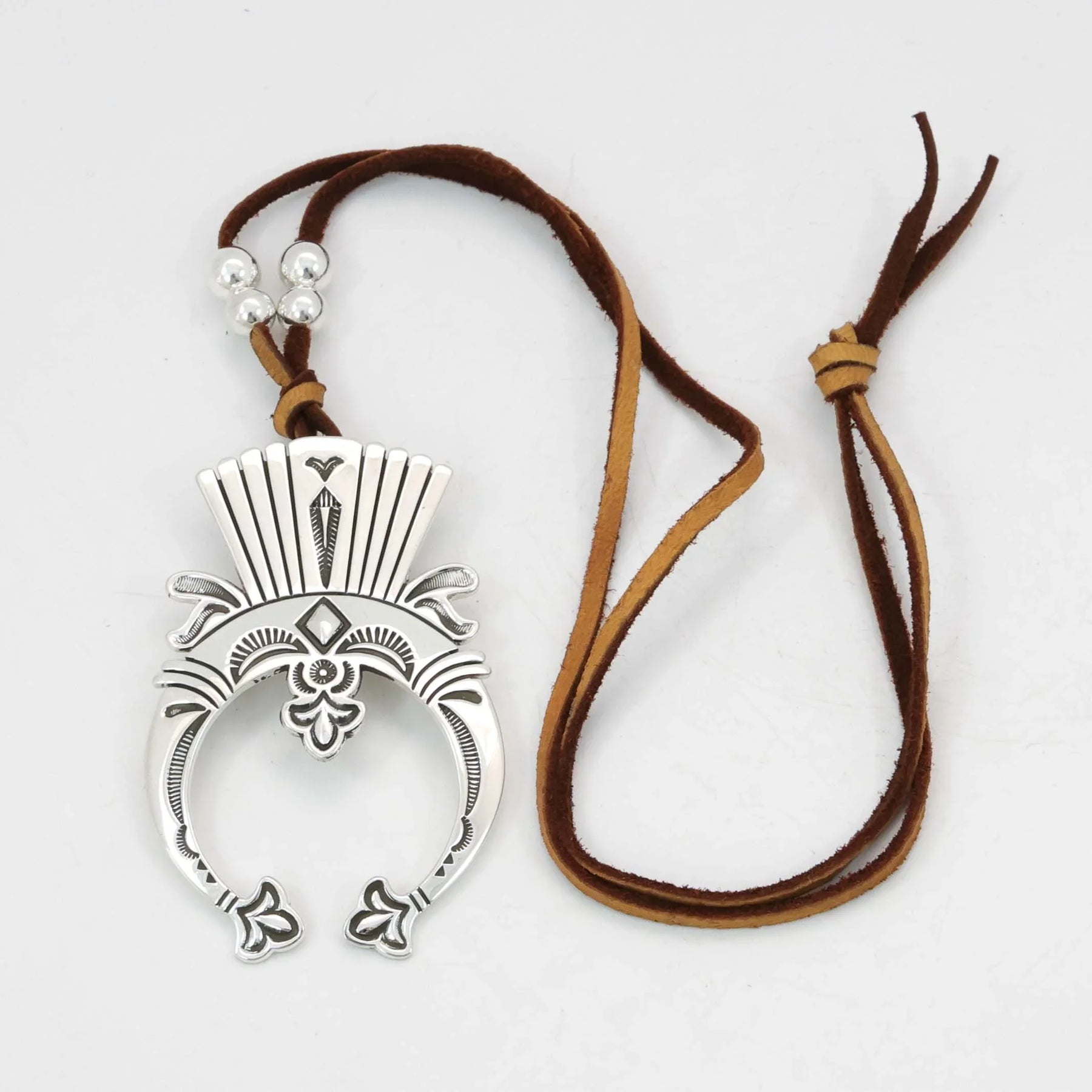 Sterling Silver Naja Pendant with Hand Stamped Designs. This pendant also features a 24” brown leather cord and silver beads.