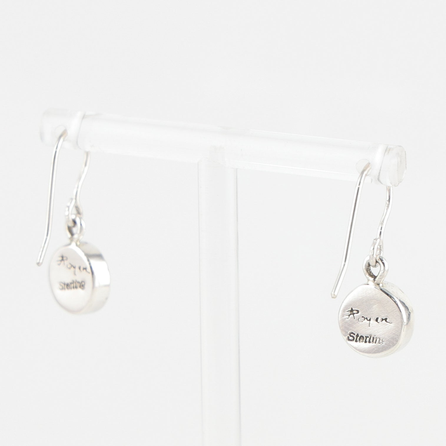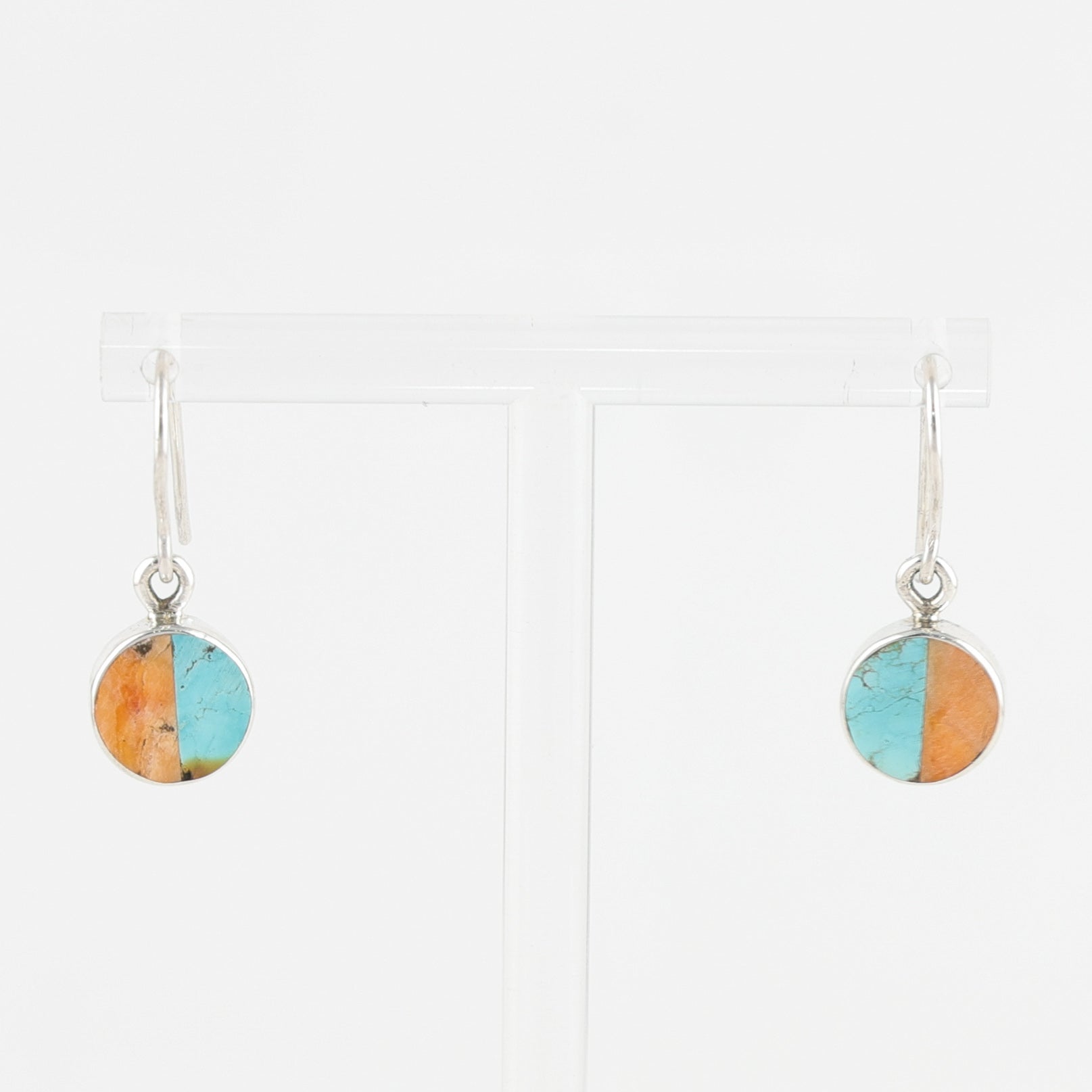 Sterling Silver French Hook Earrings with Mosaic Inlaid Spiny Oyster Shell and Turquoise by Navajo Silversmith, Jimmy Poyer.