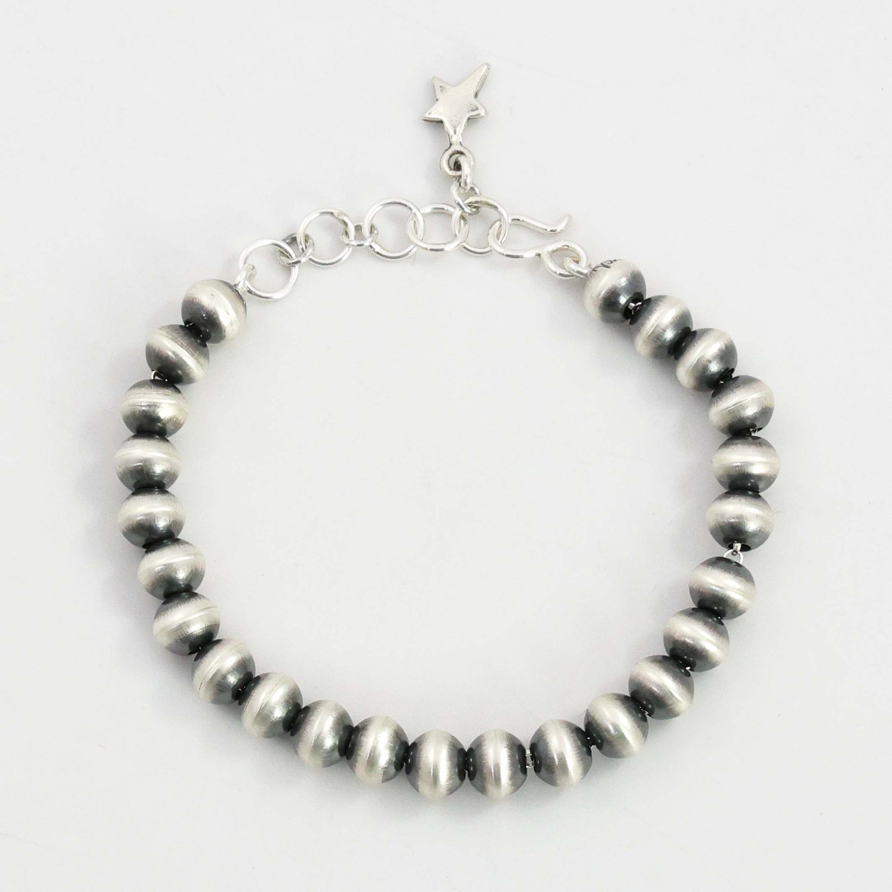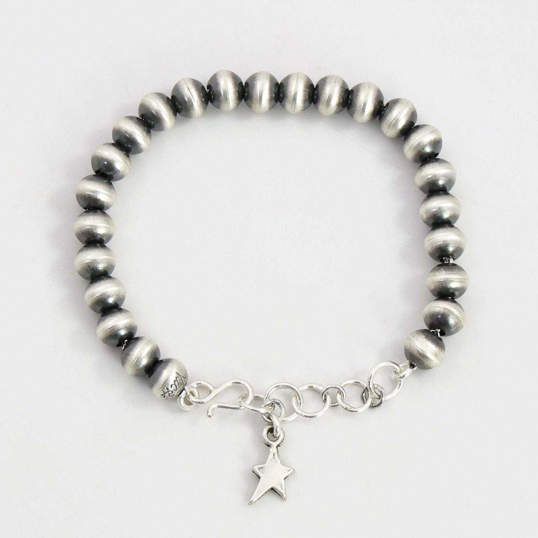 Sterling Silver Navajo Pearl Bracelet with Handmade Beads in an Oxidized Finish. This bracelet has an adjustable link clasp and star charm.