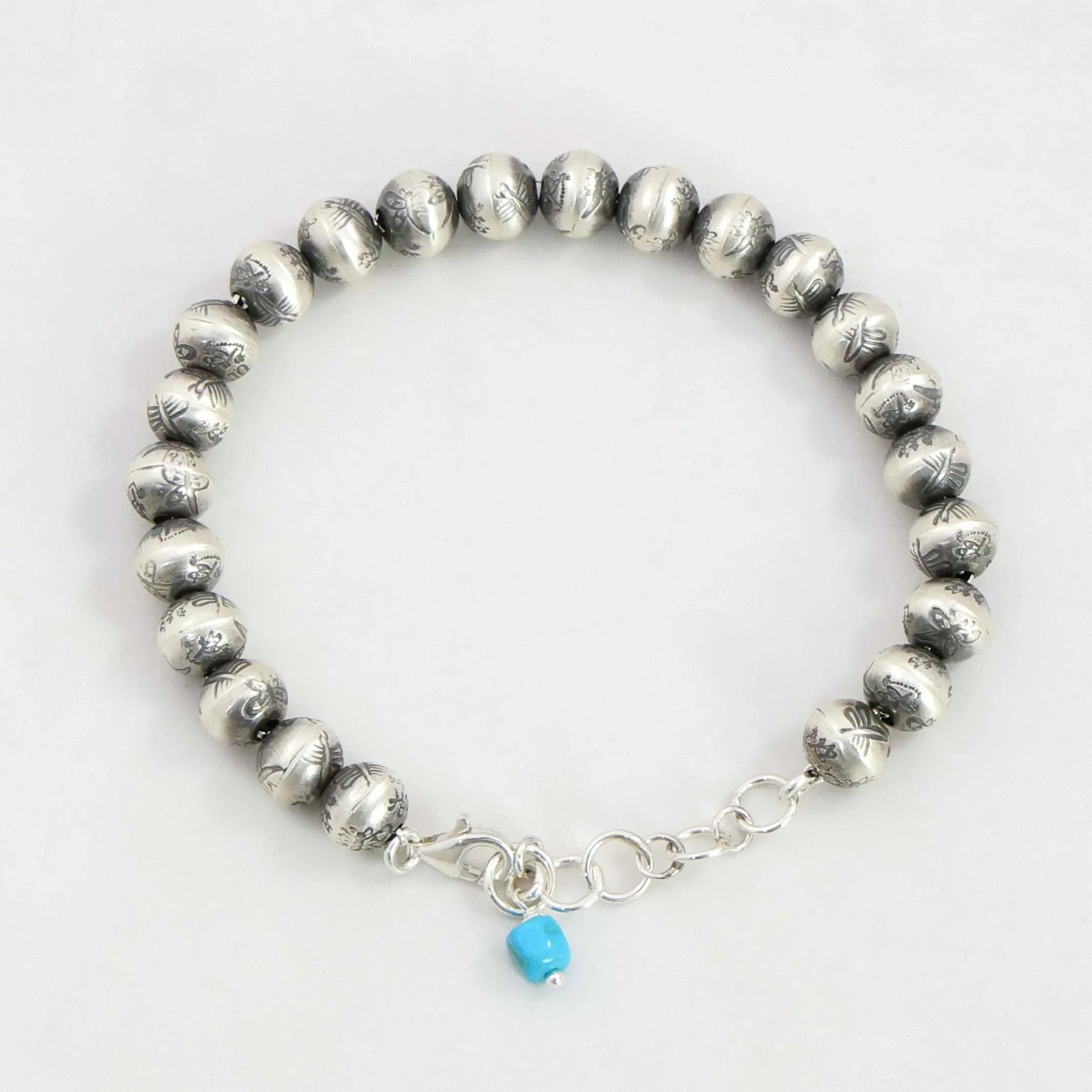 Sterling Silver Navajo Pearl Bracelet Featuring Handmade Beads with Hand-Stamped Designs and an Oxidized Finish. This bracelet has an adjustable link clasp and Sleeping Beauty Turquoise bead charm.