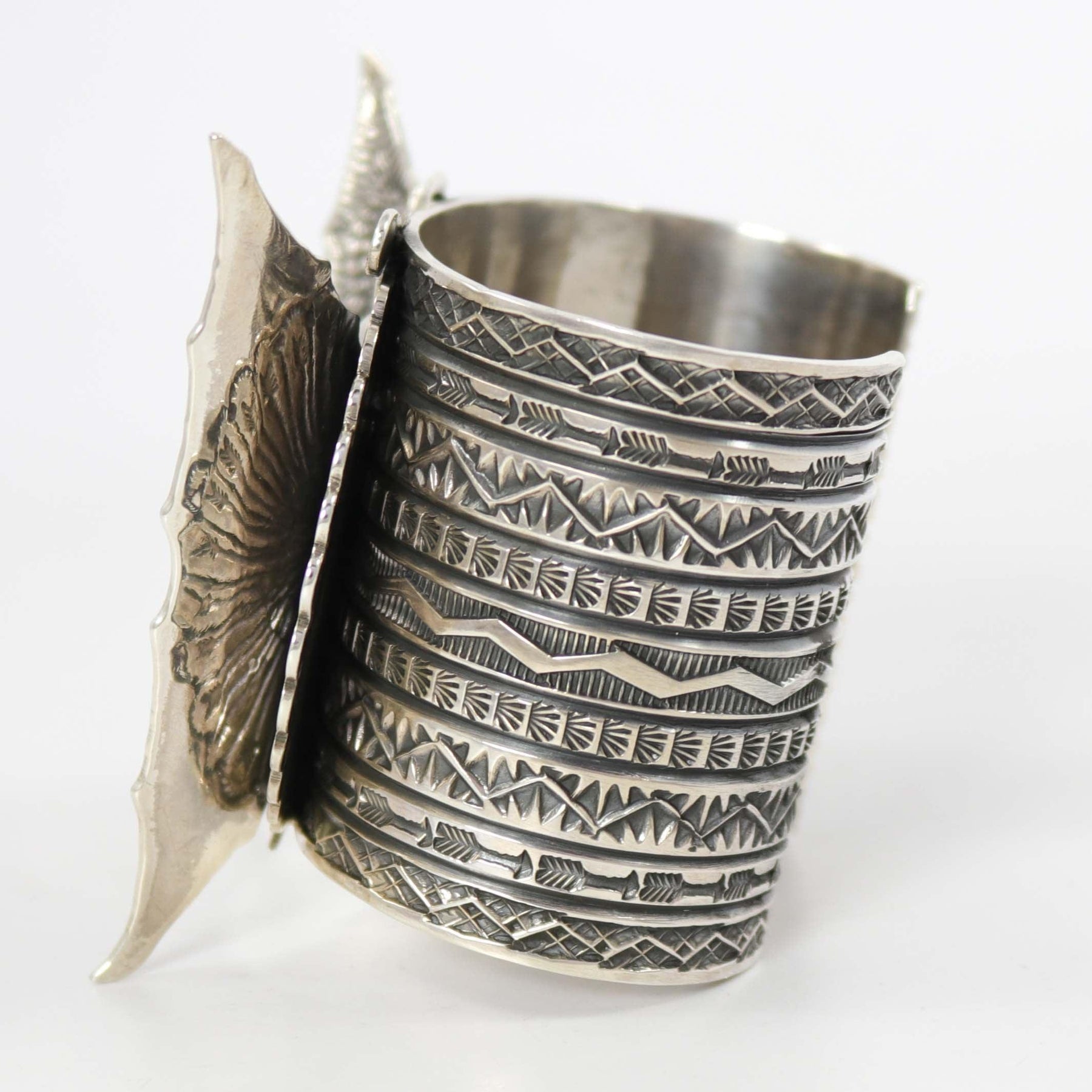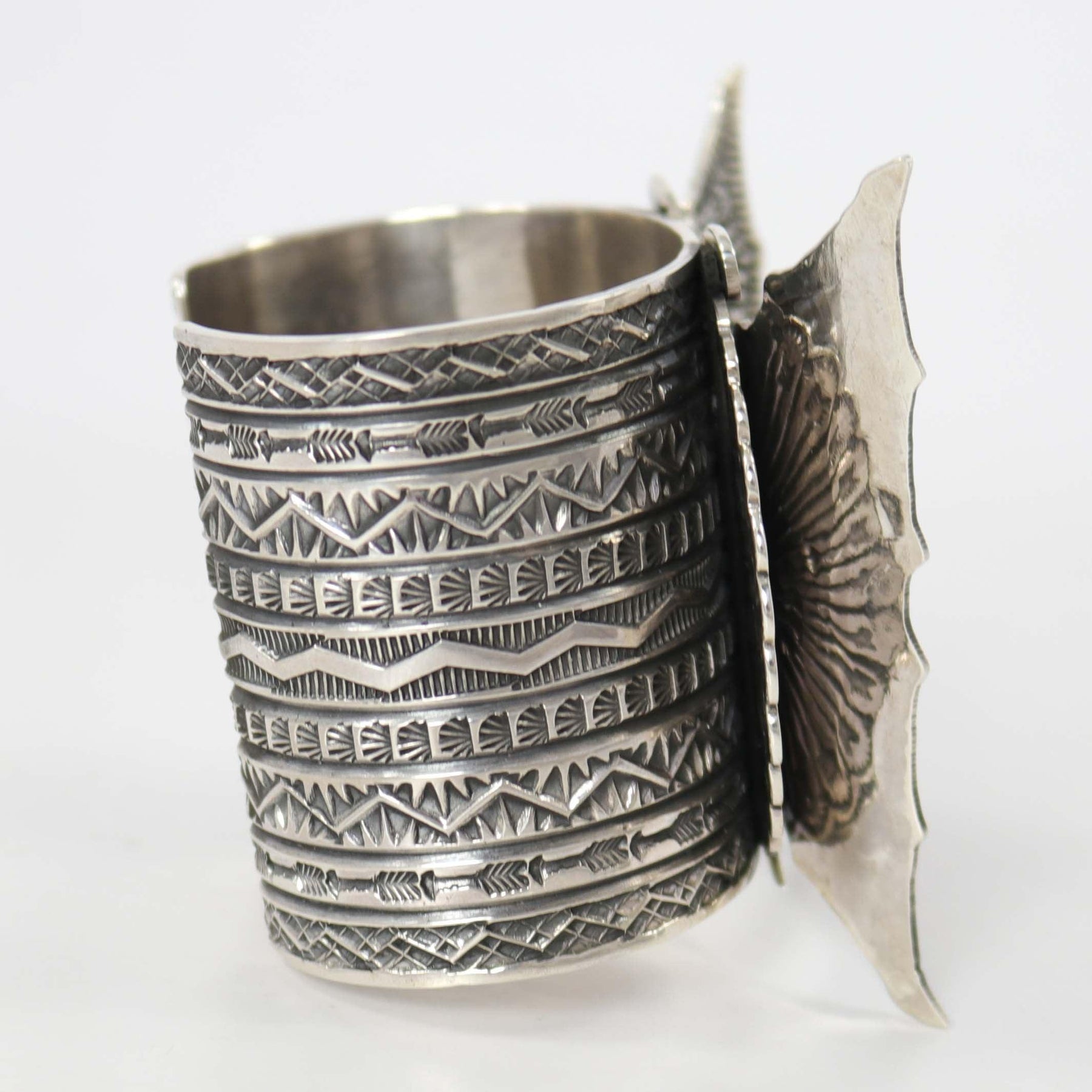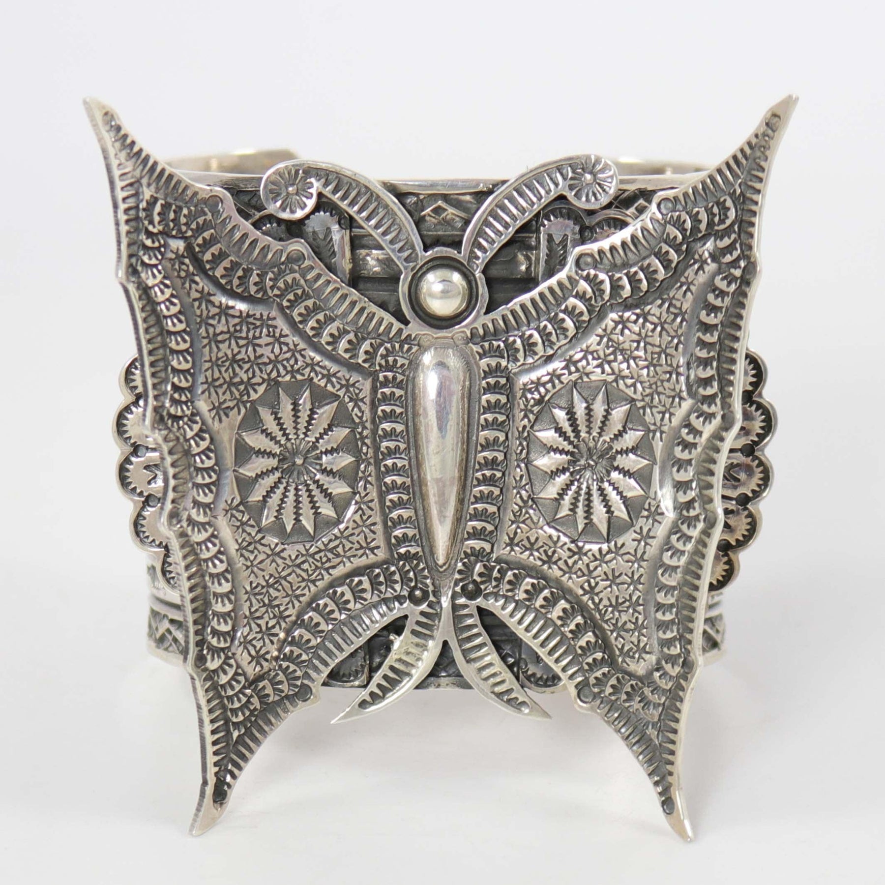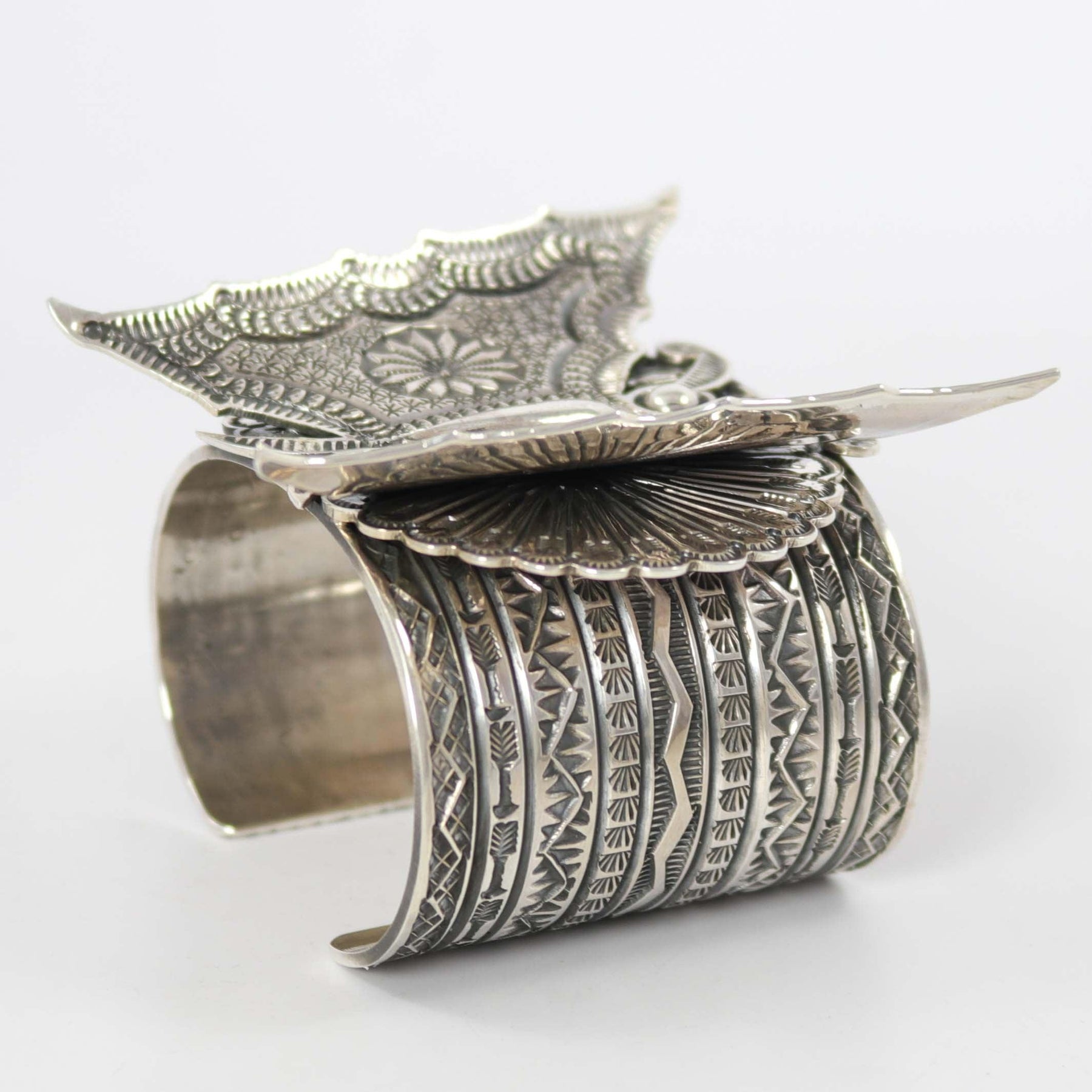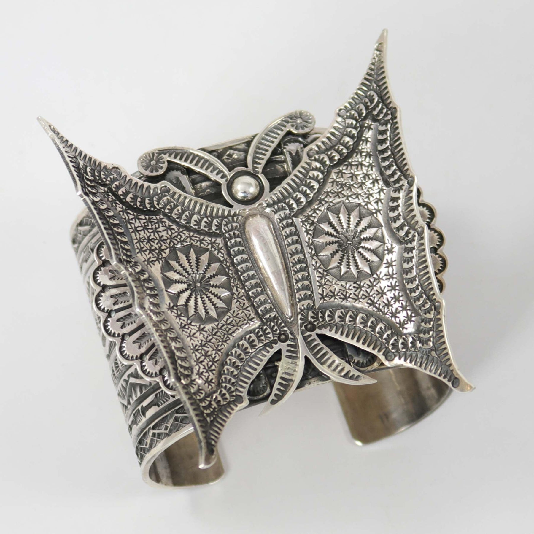 Wide Sterling Silver Cuff Bracelet and a Multi-Layered Butterfly Design featuring Intricate Hand Stamped Designs.