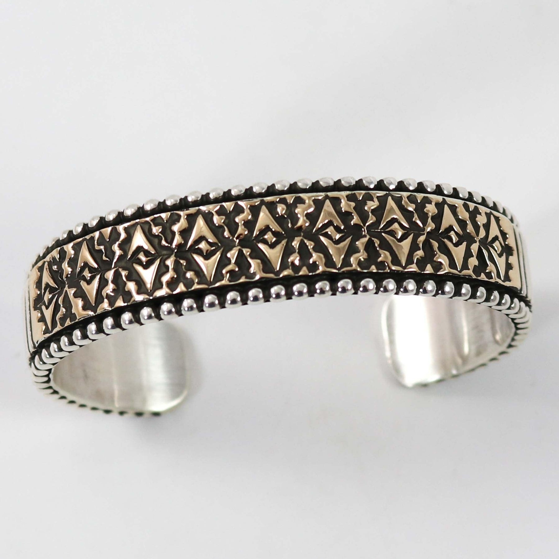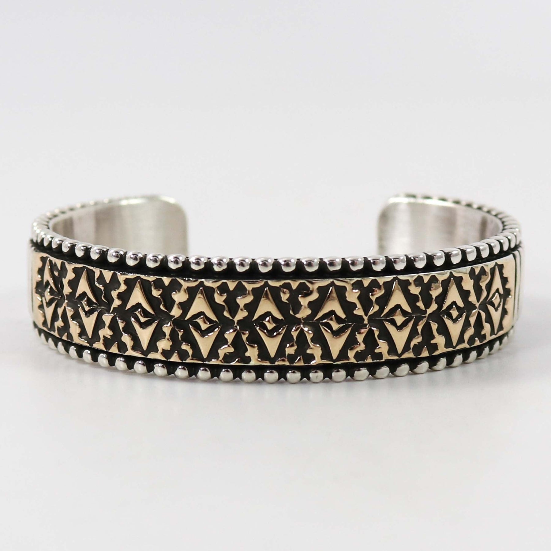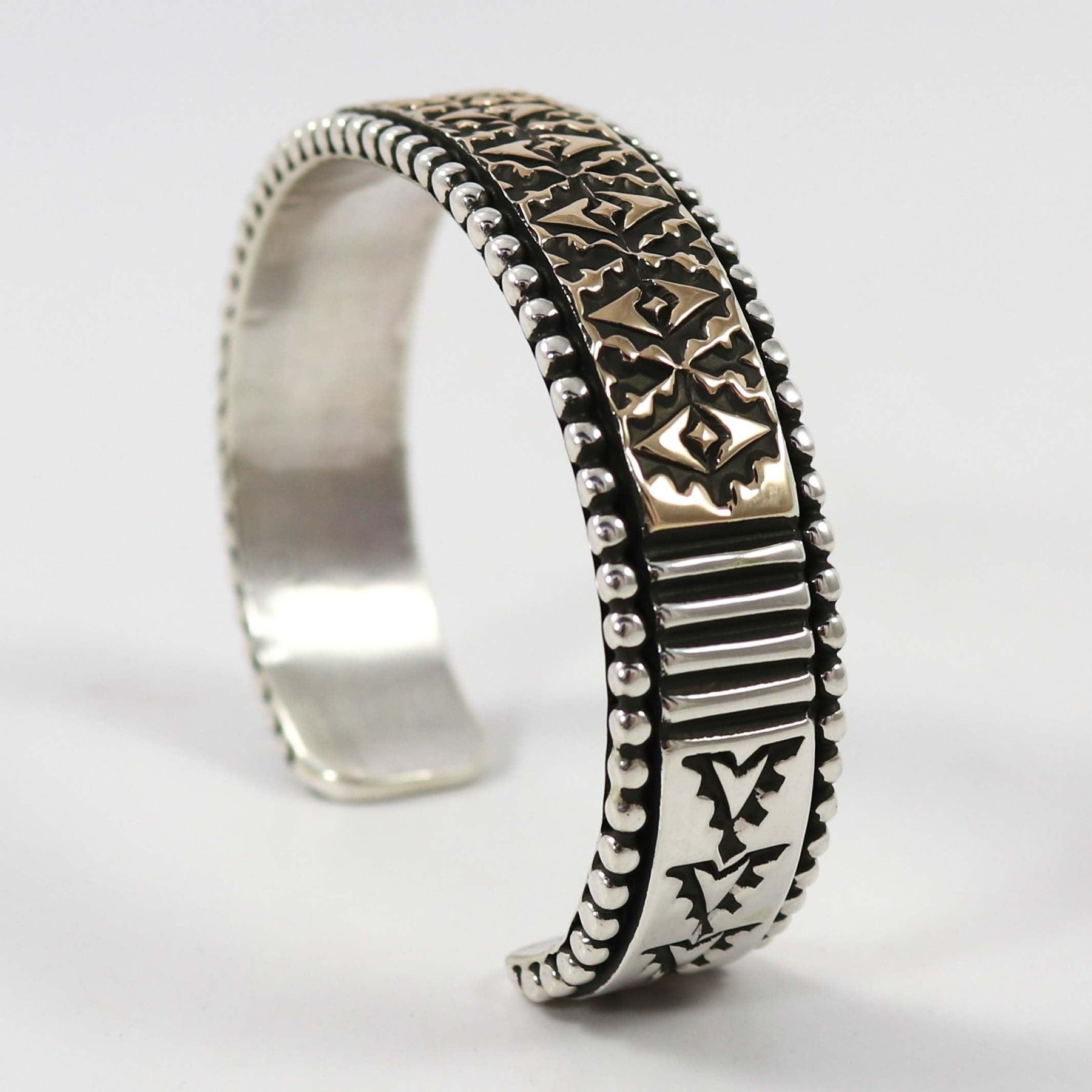 14k Gold on Sterling Silver Cuff Bracelet with Intricate Hand Stamped Designs by Navajo Silversmith, Johnathan Nez.