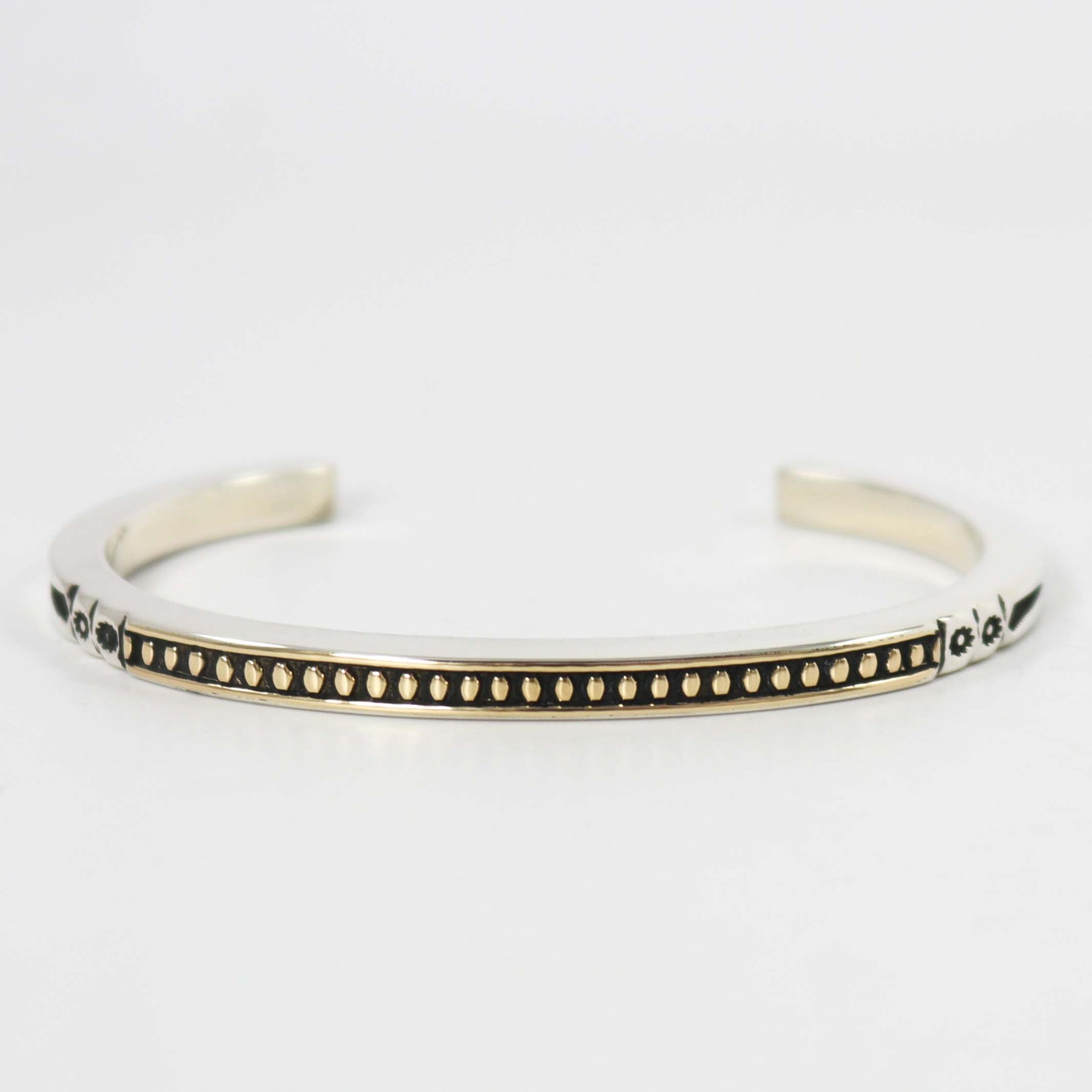 Heavy Gauge Sterling Silver and 14k Gold Square Wire Cuff Bracelet with Hand Stamped and Hand Filed Designs by Award Winning Navajo Silversmith, Jennifer Curtis.