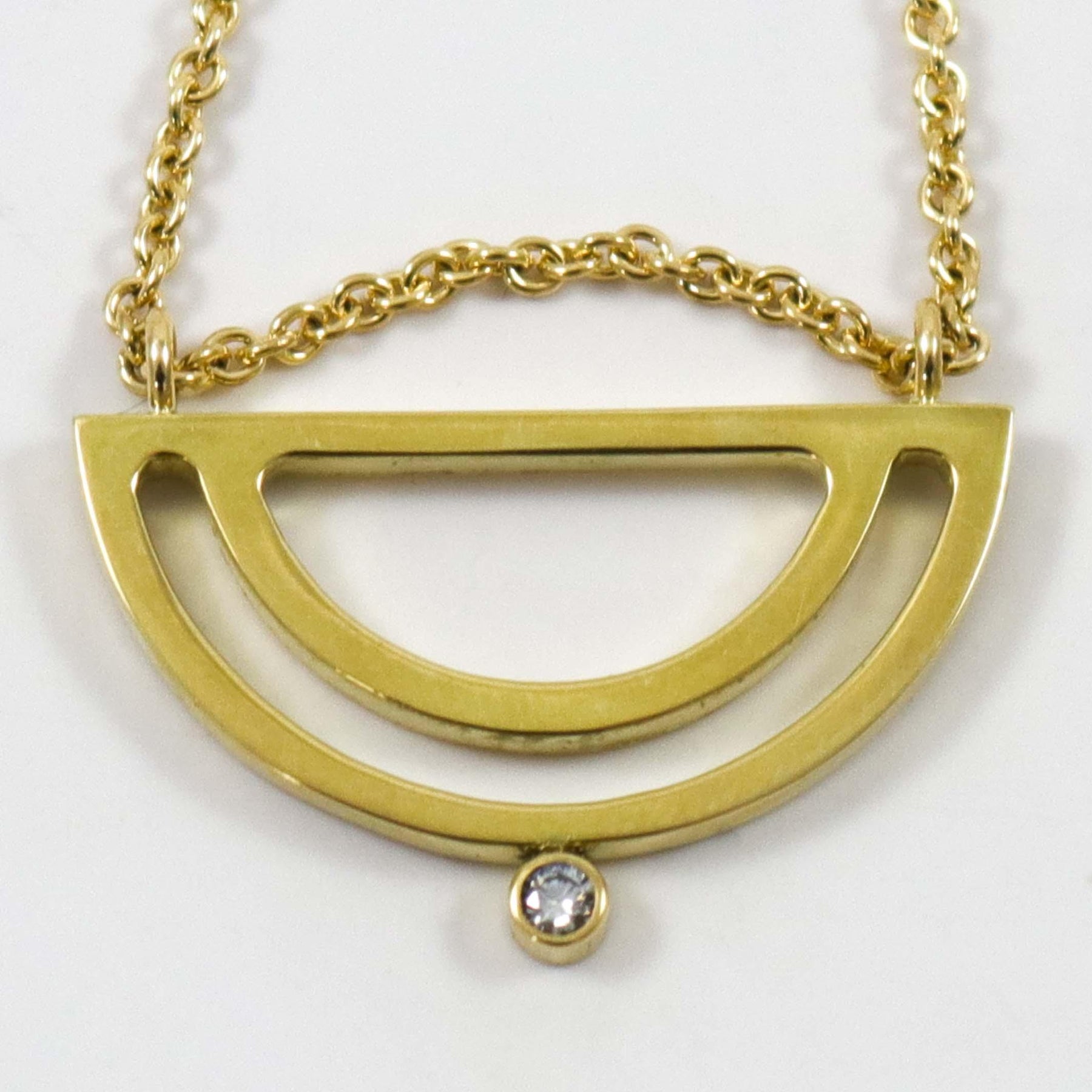 18k Gold “Strata Half Moon” Pendant set with a White Conflict-Free Diamond on a 18k Gold Chain Necklace.