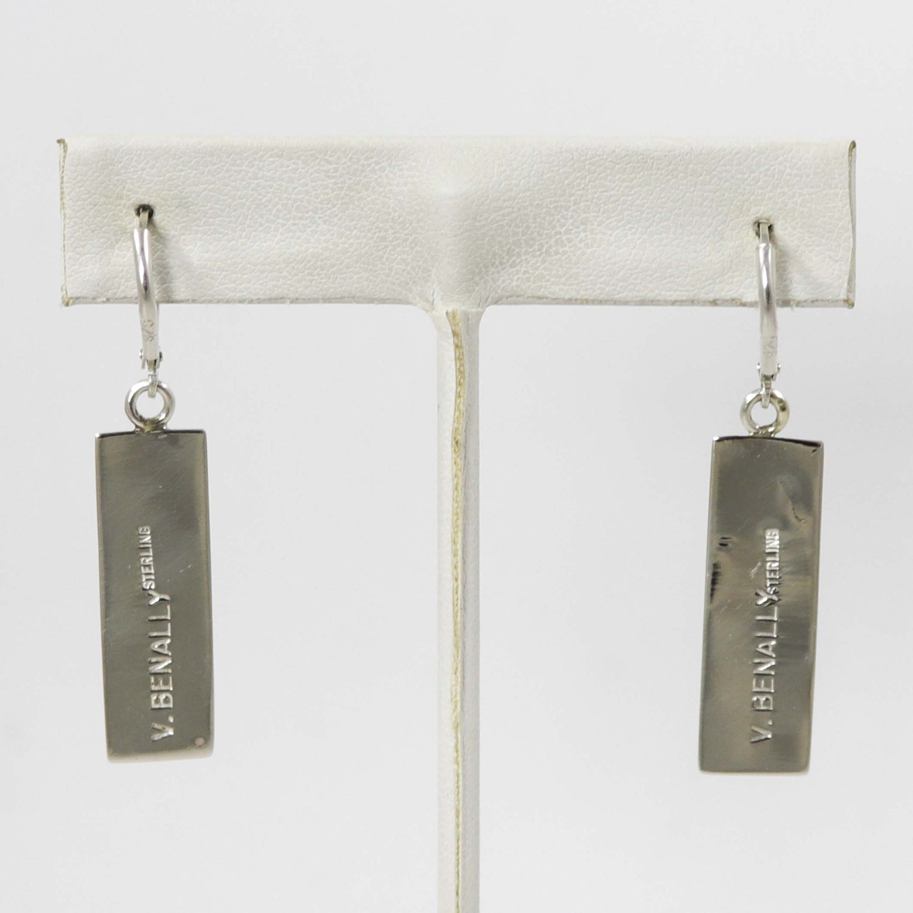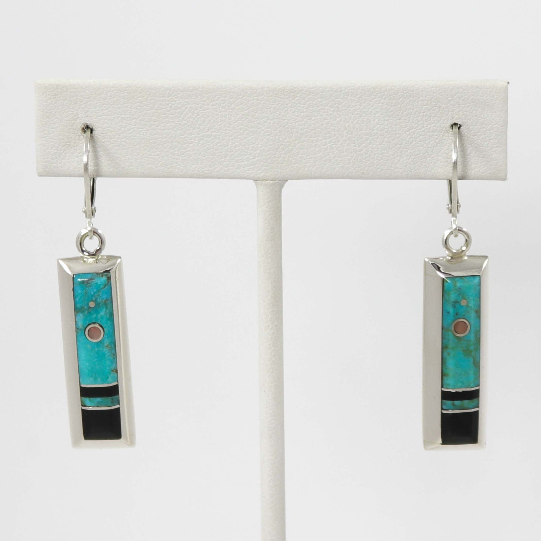 Sterling Silver Lever-Back Earrings with Channel Inlaid Turquoise, Jet, and Pink Coral.