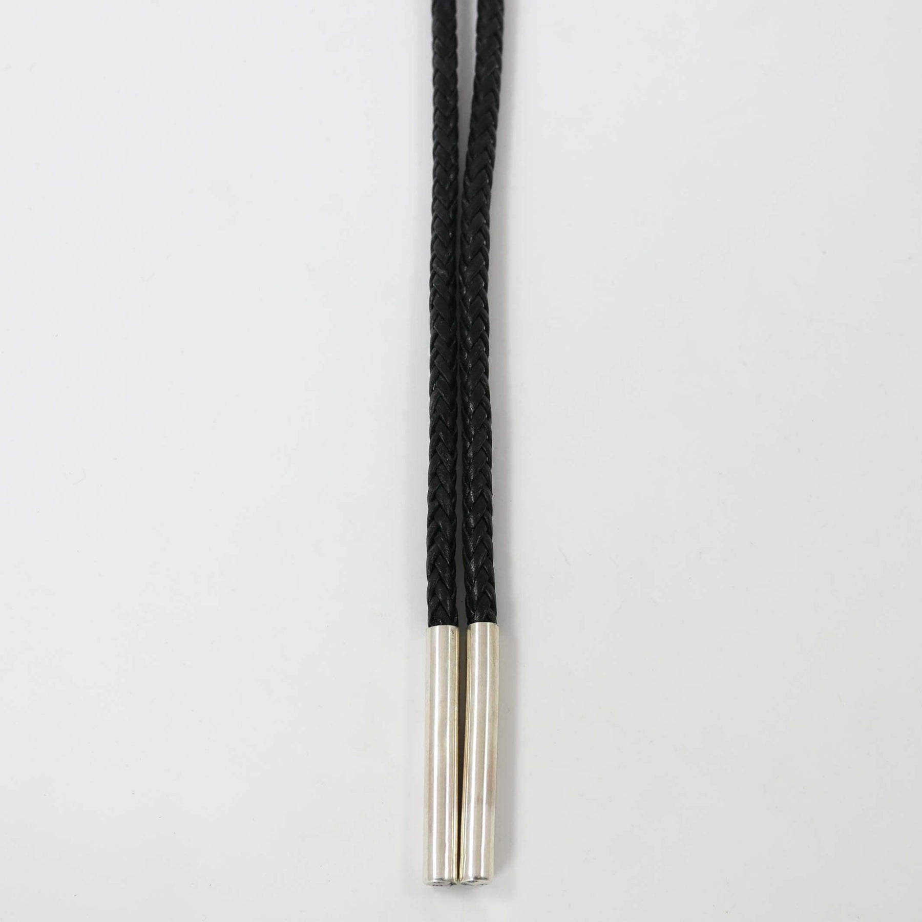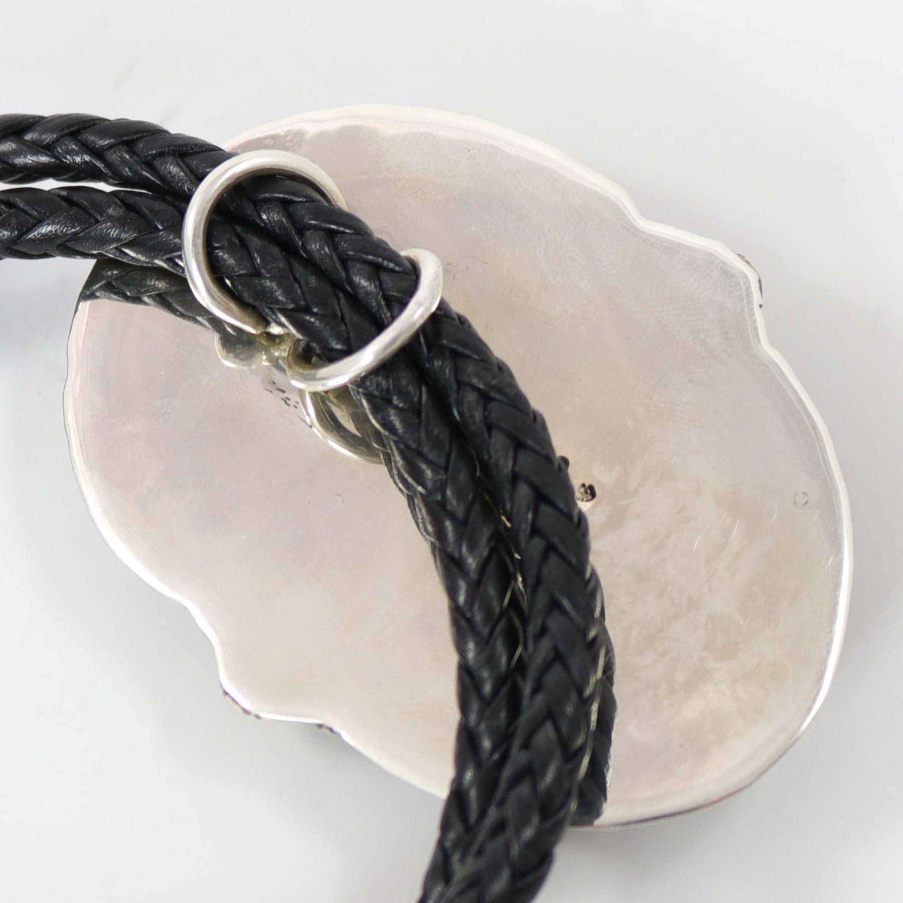 Sterling Silver Bola Tie set with Natural Kingman Turquoise in a Custom Sawtooth Bezel. This bola tie features a figure eight backing, a 40” black leather cord, and sterling silver tips.