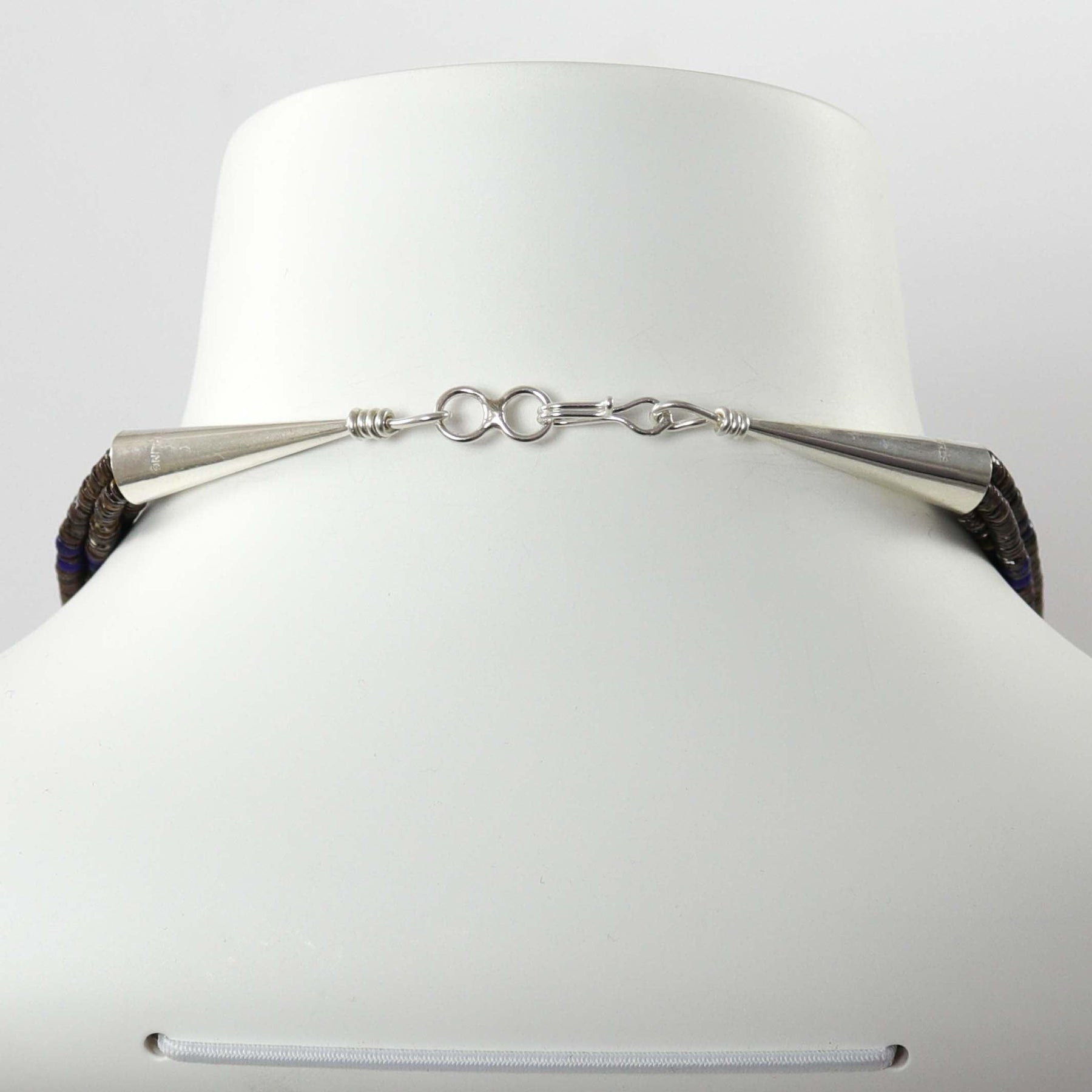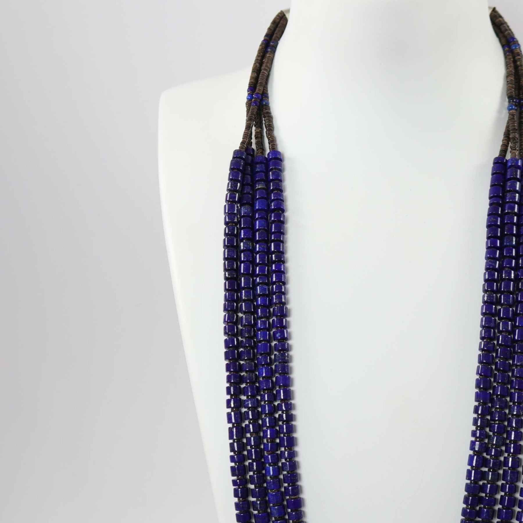 Four Strand Necklace with Lapis and Pen Shell Heishi Beads and a Sterling Silver Clasp.