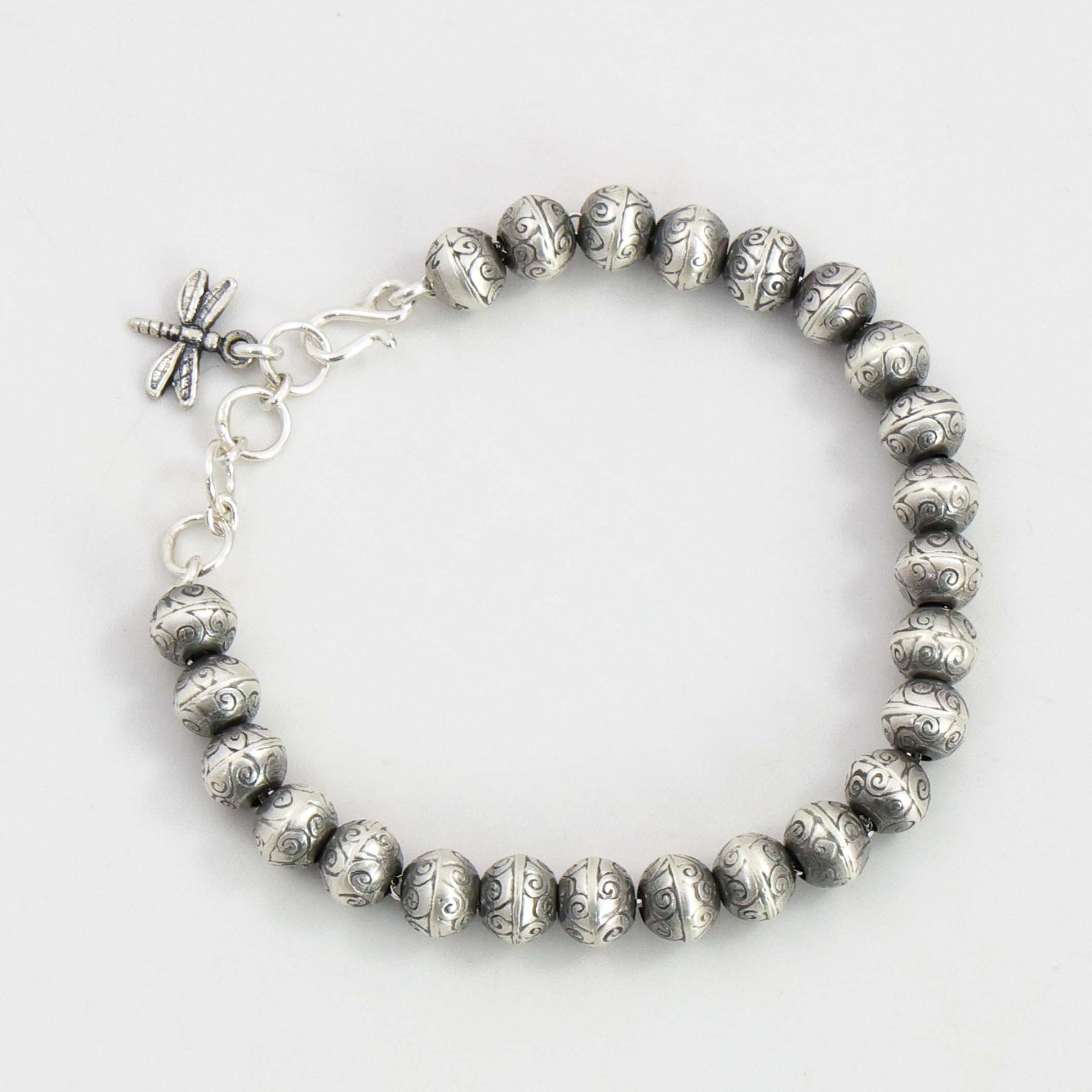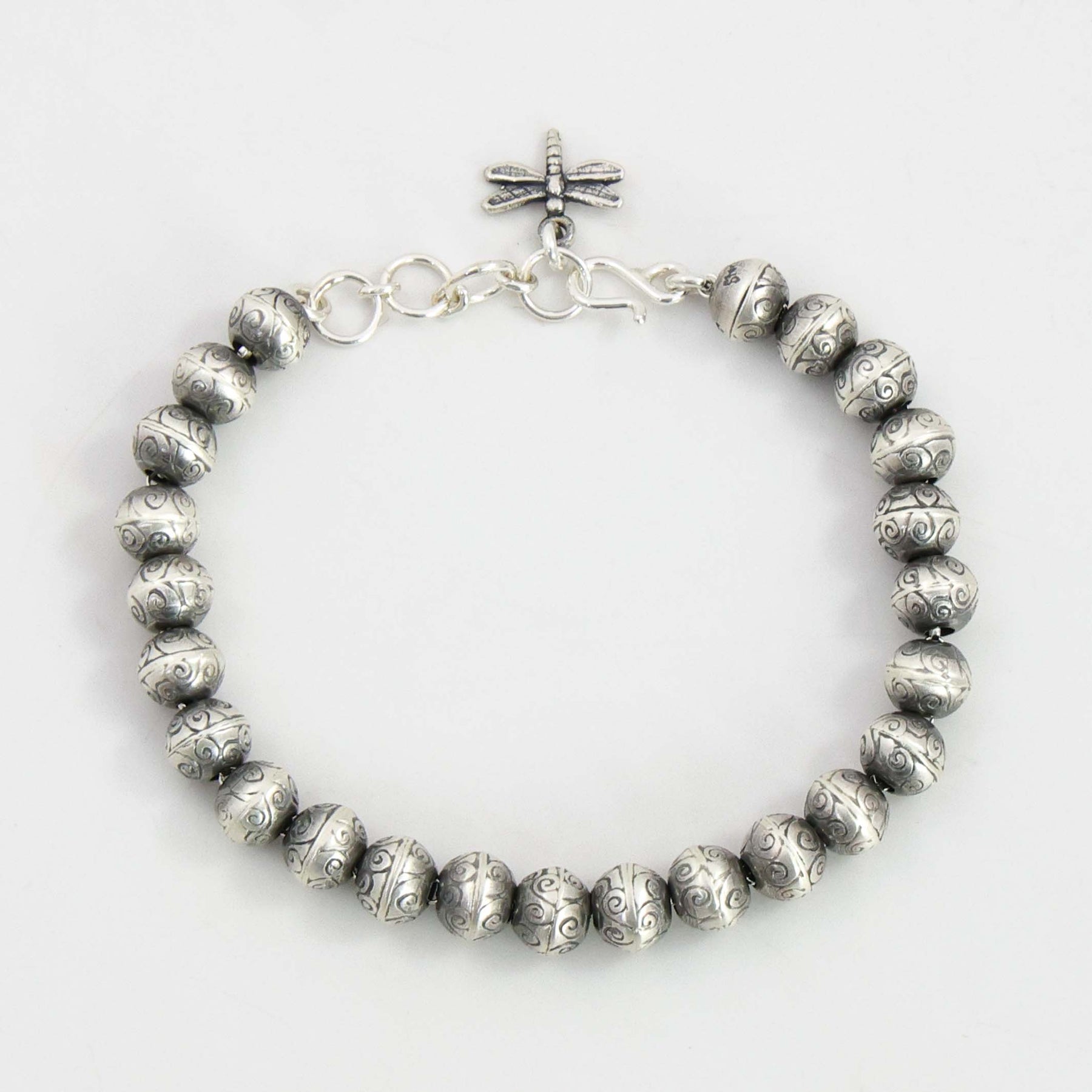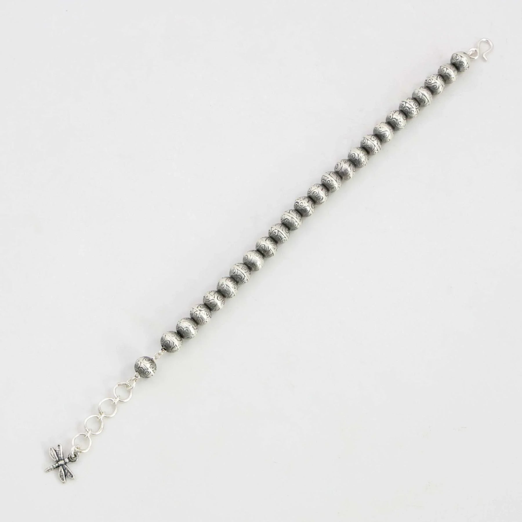 Sterling Silver Navajo Pearl Bracelet Featuring Handmade Beads with Hand-Stamped Designs and an Oxidized Finish.  This bracelet has an adjustable link clasp and dragonfly charm.